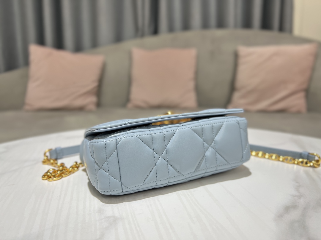 This Dior Caro bag combines elegant temperament with a modern style. Meticulously crafted from mist blue calfskin, it features original oversized quilted cannage stitching, making it unique. The flap is adorned with a vintage gold-finished metal knob-style "CD" clasp, inspired by the seal of a Christian Dior perfume bottle. The medium style comes with a detachable "CD" link strap, allowing it to be carried by hand or on the shoulder. It can also be replaced with Dior's embroidered wide strap to accessorize everyday looks or add a touch of brilliance to evening wear.