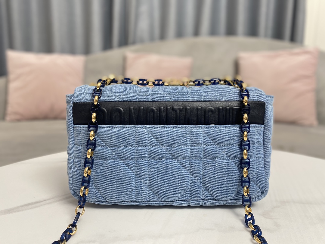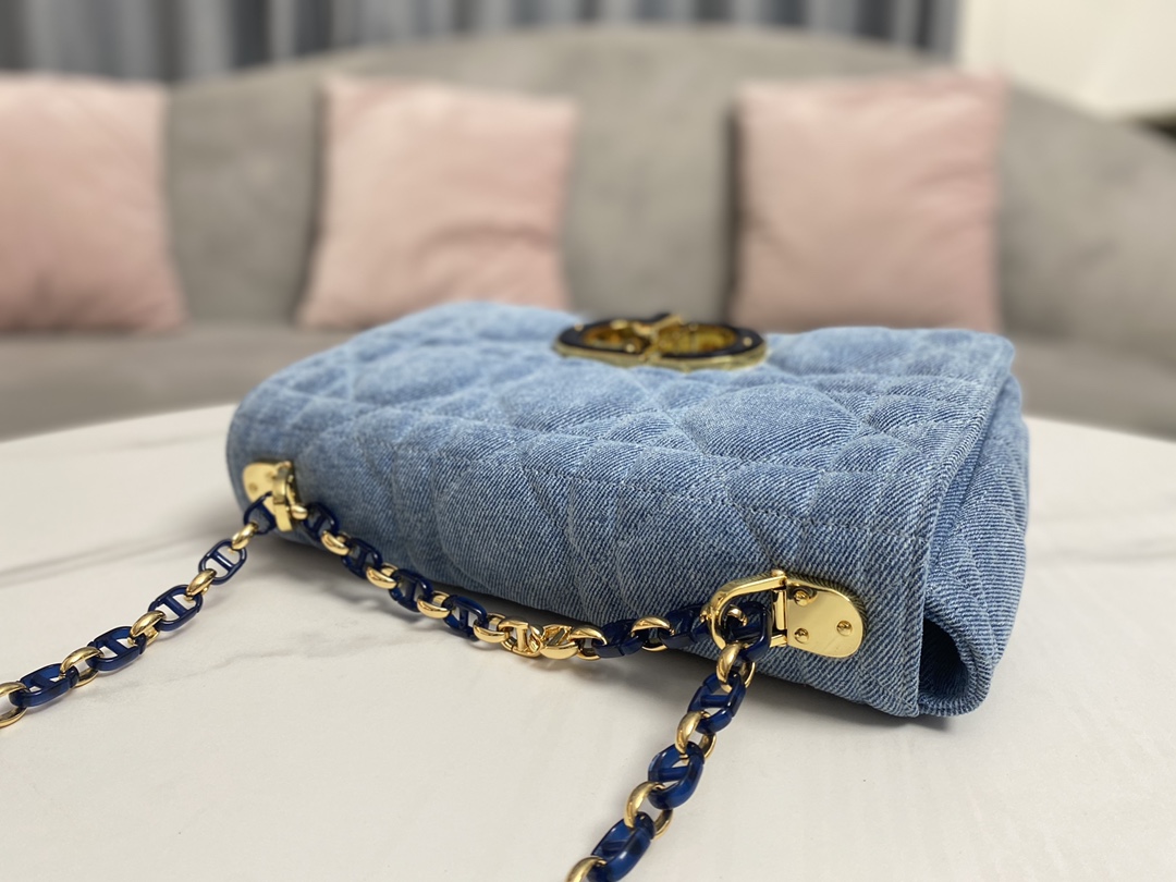 This Dior Caro bag blends modern fashion with classic elegance, showcasing the pop style of the collection. Meticulously crafted from blue denim, it features an original quilting effect with oversized cannage stitching and a flap adorned with a fluorescent blue transparent resin knob-style "CD" clasp, making it unique. The medium style comes with a detachable "CD" chain strap, allowing it to be carried by hand, on the shoulder, or cross-body. It can also be replaced with Dior's embroidered wide strap to accessorize daily outfits or add a touch of brilliance to evening wear.