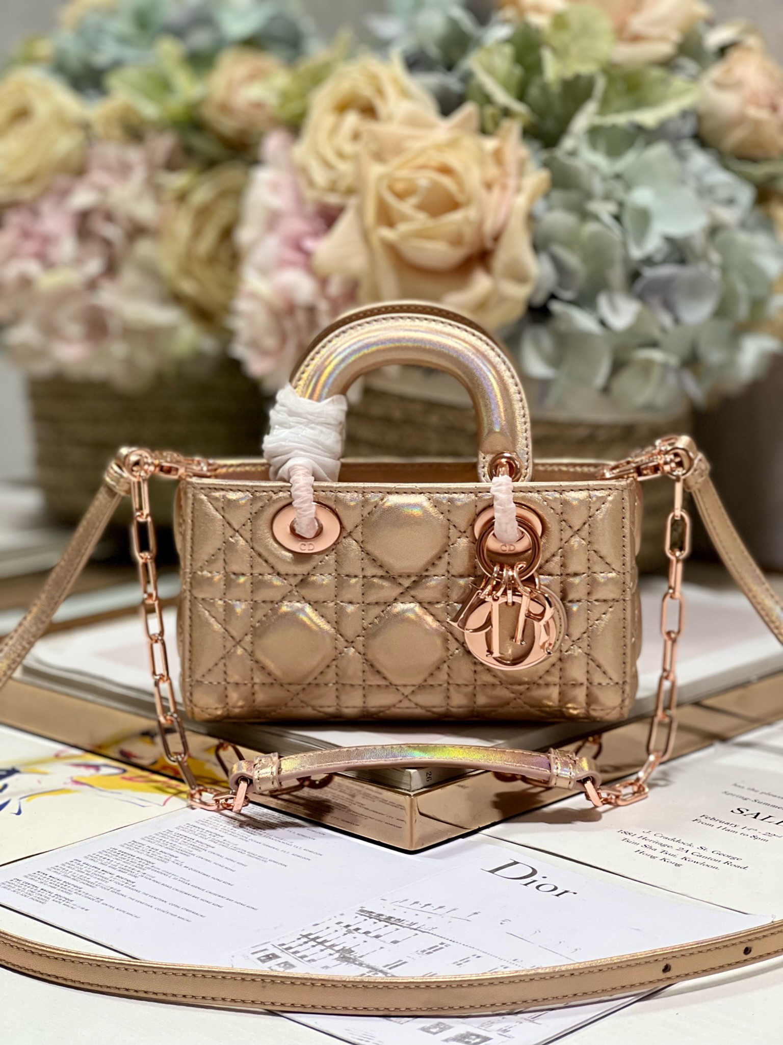 This Lady D-Joy bag from the Dior Or collection highlights the minimalist aesthetic of the Lady Dior line, embodying Dior's profound insight into elegance and beauty. Meticulously crafted from fluorescent silver-toned metallic lambskin, it features striking quilted details with cannage stitch patterning. Adorned with a metal-coated D.I.O.R. charm, it exudes an elegant temperament. The mini design comes with a detachable chain strap and an adjustable, detachable leather strap, allowing it to be carried by hand, on the shoulder, or cross-body, making it an ideal choice for everyday styling.