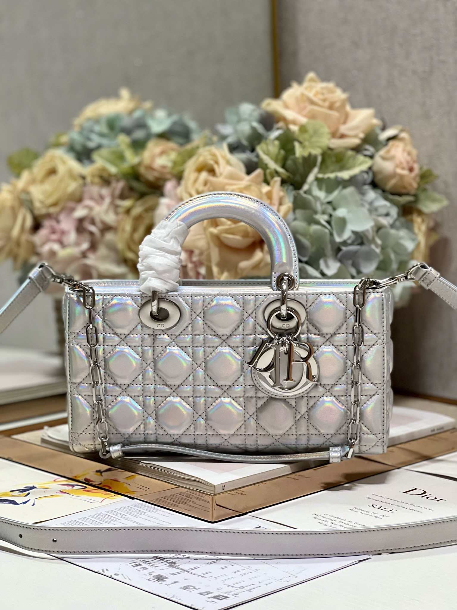 This Lady D-Joy bag from the Dior Or series highlights the minimalist aesthetic of the Lady Dior collection, embodying Dior's profound insight into elegance and beauty. Meticulously crafted from fluorescent silver-toned metallic lambskin, it features striking quilted details with cannage stitching. Adorned with a metal-coated D.I.O.R. charm, it exudes an elegant temperament. The medium style comes with a detachable chain strap and an adjustable, detachable leather strap, allowing it to be carried by hand, on the shoulder, or cross-body, making it an ideal choice for everyday styling.