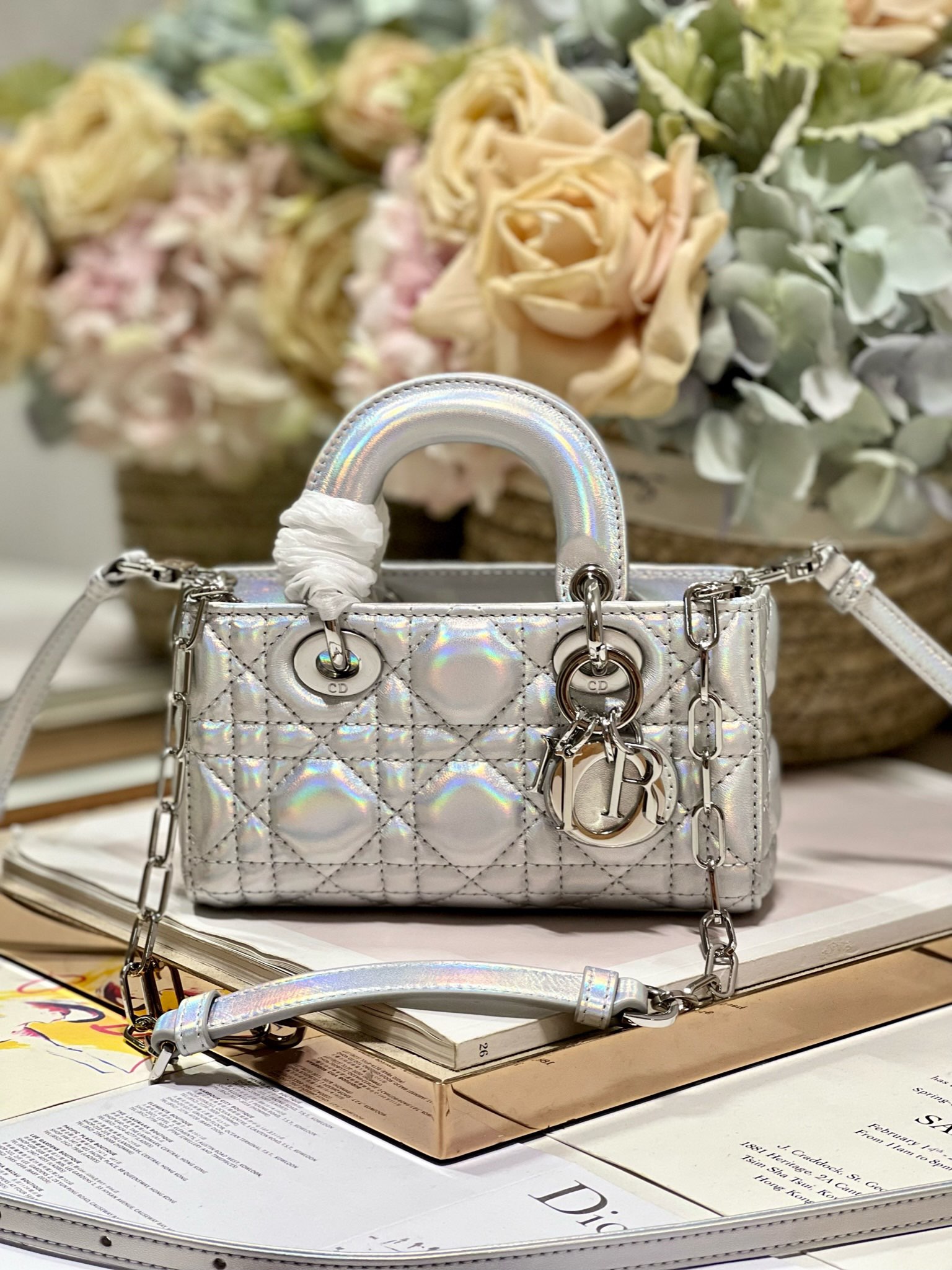 This Lady D-Joy bag from the Dior Or collection highlights the minimalist aesthetic of the Lady Dior line, embodying Dior's profound insight into elegance and beauty. Meticulously crafted from fluorescent silver-toned metallic lambskin, it features striking quilted details with cannage stitch patterning. Adorned with a metal-coated D.I.O.R. charm, it exudes an elegant temperament. The mini style comes with a detachable chain strap and an adjustable, detachable leather strap, allowing it to be carried by hand, on the shoulder, or cross-body, making it an ideal choice for everyday styling.