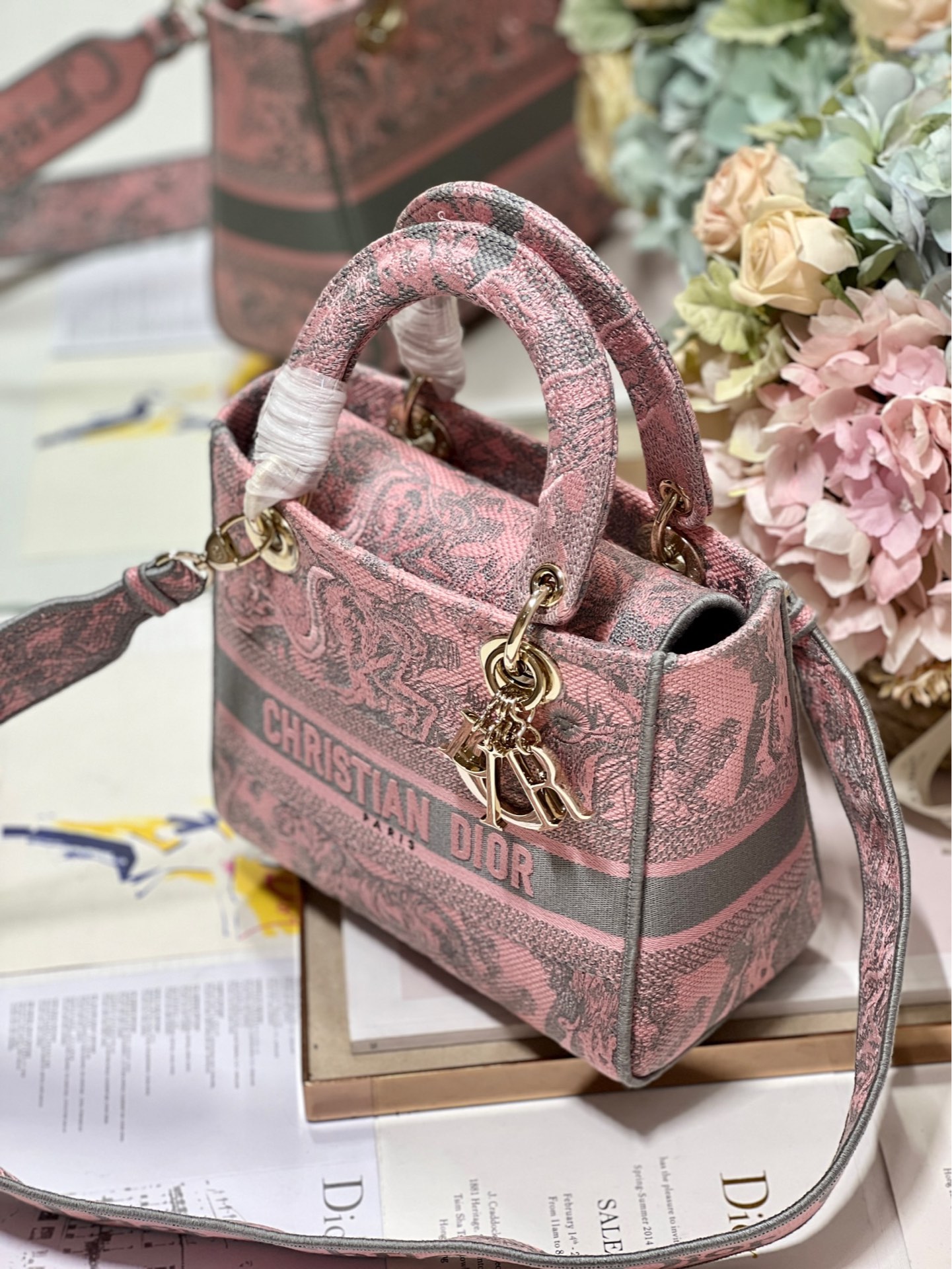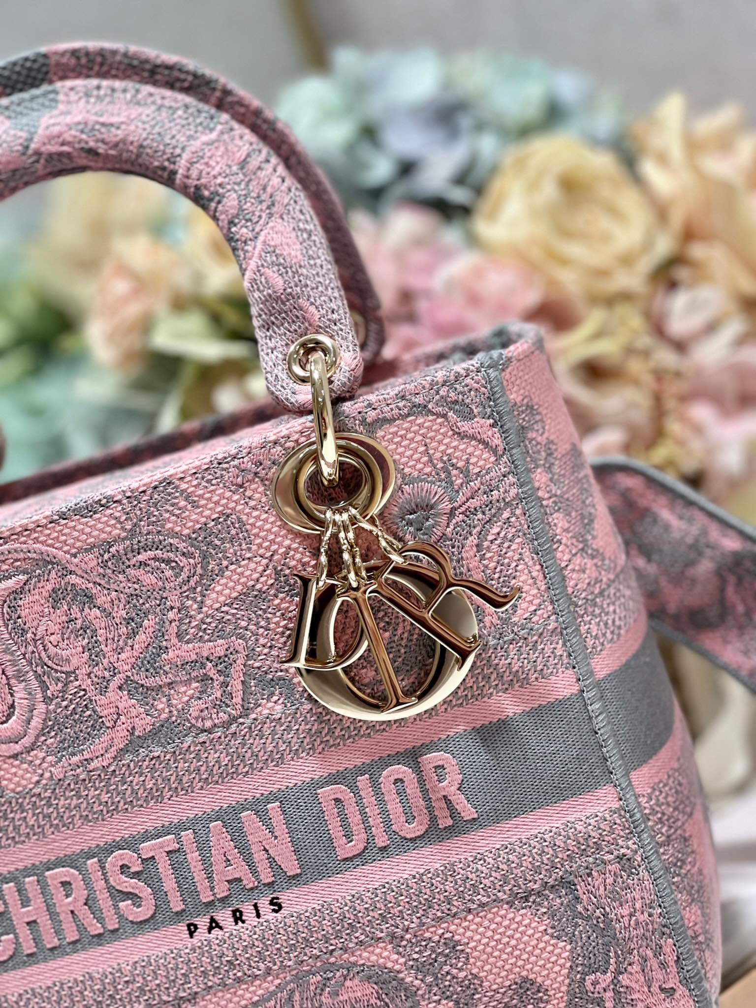 [Old Pink Base Tiger Five-Grid Embroidered Lady Dior] The Lady Dior embroidered bag features the "Christian Dior" logo, stylish and soft. Adorned with the iconic "D.I.O.R." charm, adding a touch of dynamism to the exquisite silhouette. Comes with a large detachable double-sided embroidered strap, allowing you to choose how to carry it as you wish. The detachable double-sided embroidered wide strap includes an internal zippered pocket and patch pocket. It can be carried by hand, on the shoulder, or cross-body, and can be freely matched with other embroidered straps.