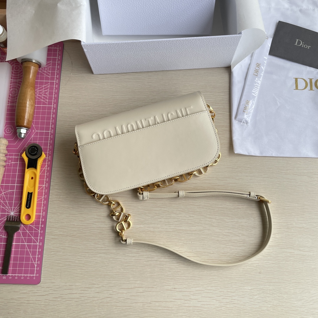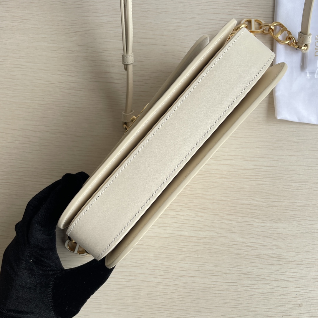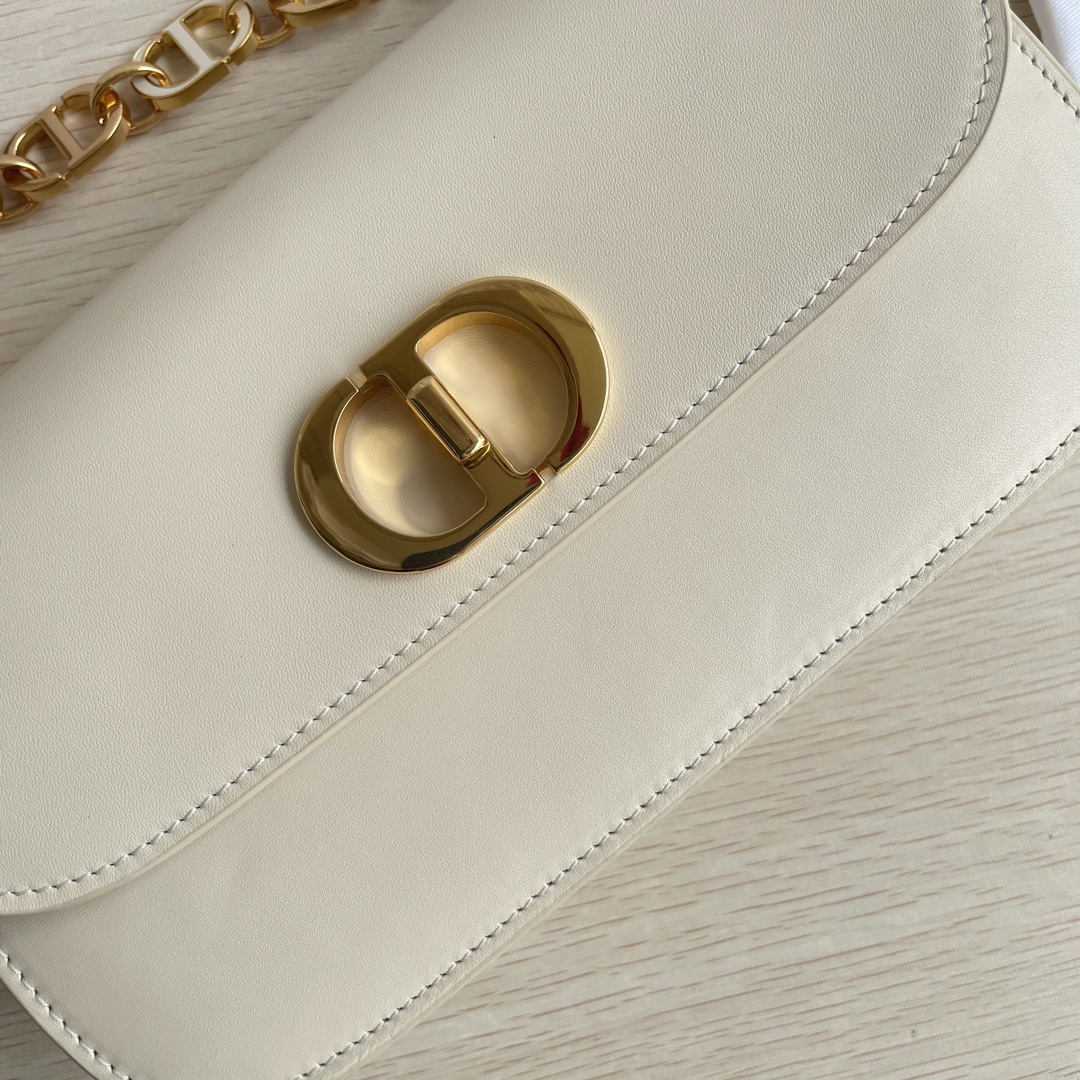 This 30 Montaigne Avenue handbag features an elegant design that elevates the style of this classic collection. It is meticulously crafted from gray-ivory smooth calfskin leather, with exquisitely curved rounded flap edges adorned in vintage gold. The metal CD clasp is inspired by the closure of Christian Dior perfume bottles. The back is decorated with an embossed 30 Montaigne logo, paired with a classic chain composed of alternating gold-finished metal and enamel links in the same tone as the leather. The pleated design offers spacious interior and a refined silhouette, allowing it to be carried by hand, on the shoulder, or cross-body. It features a flap closure, a CD clasp, and an embossed 30 Montaigne logo on the back. The adjustable chain is made of gold-finished metal and enamel CD links in the same tone as the leather, complemented by a leather strap. It has three compartments.