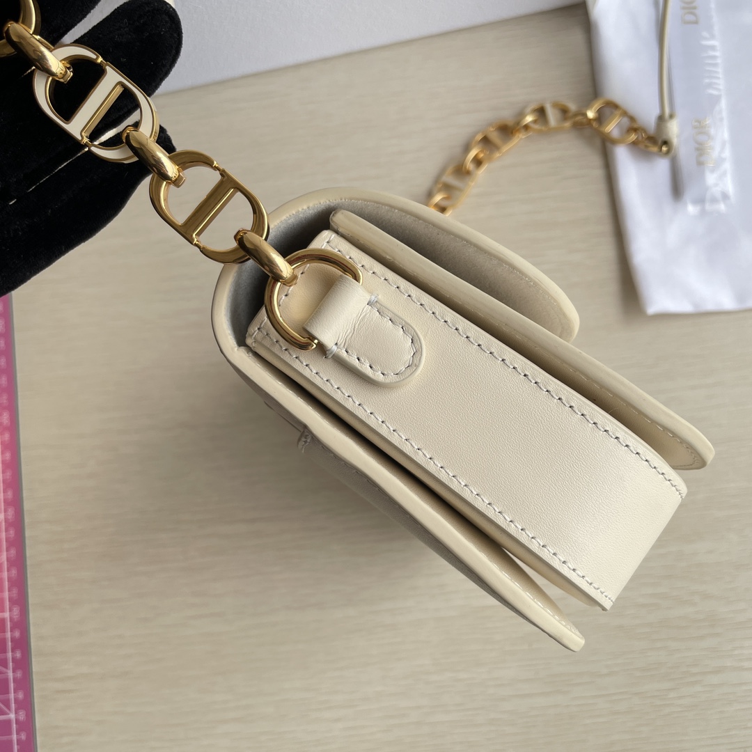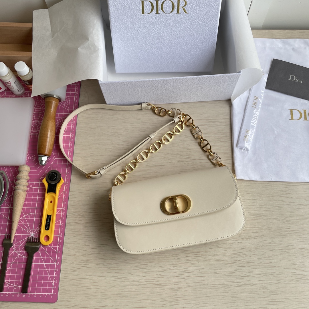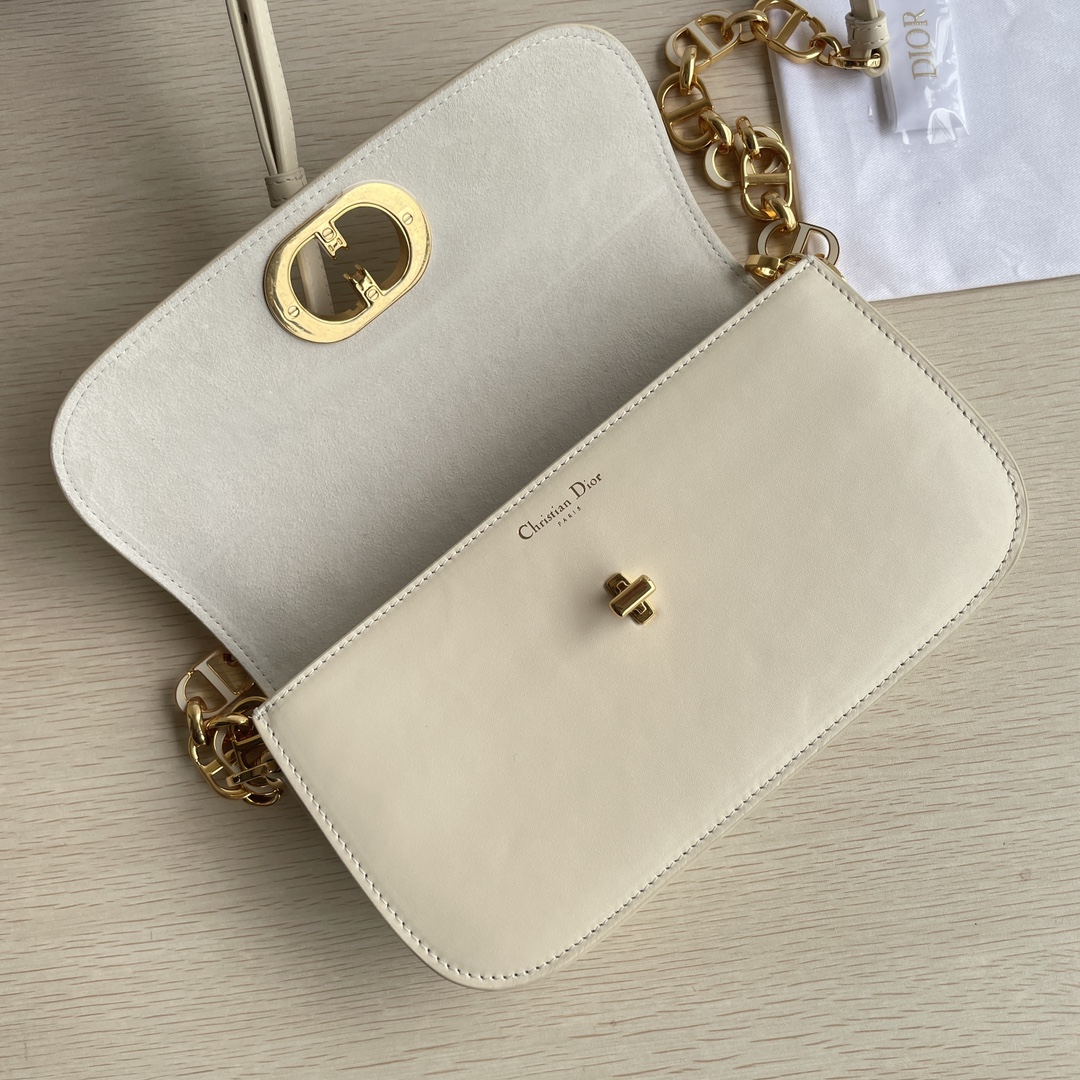 This 30 Montaigne Avenue handbag features an elegant design that elevates the style of this classic collection. It is meticulously crafted from gray-ivory smooth calfskin leather, with exquisitely curved rounded flap edges adorned in vintage gold. The metal CD clasp is inspired by the closure of Christian Dior perfume bottles. The back is decorated with an embossed 30 Montaigne logo, paired with a classic chain composed of alternating gold-finished metal and enamel links in the same tone as the leather. The pleated design offers spacious interior and a refined silhouette, allowing it to be carried by hand, on the shoulder, or cross-body. It features a flap closure, a CD clasp, and an embossed 30 Montaigne logo on the back. The adjustable chain is made of gold-finished metal and enamel CD links in the same tone as the leather, complemented by a leather strap. It has three compartments.