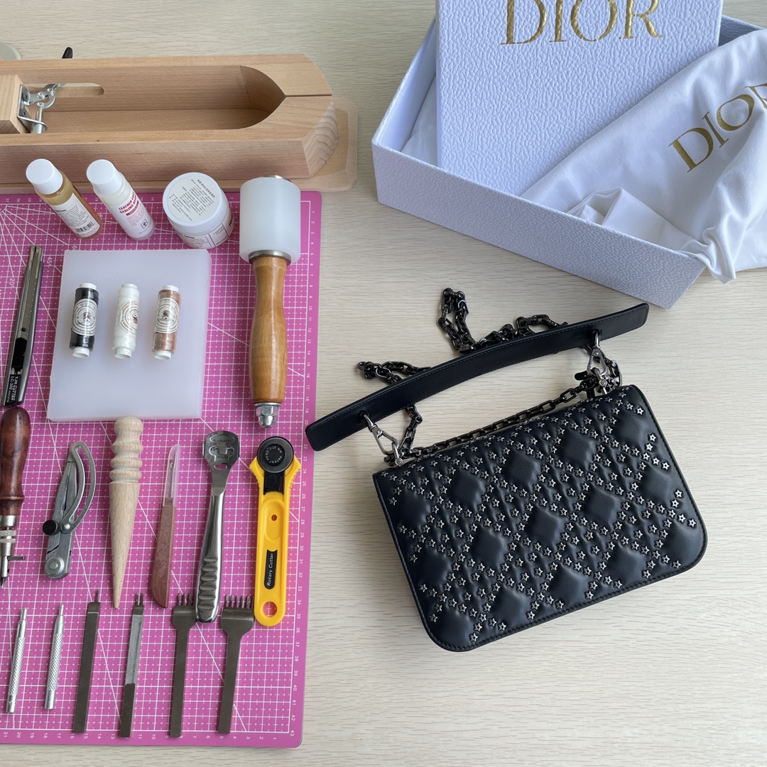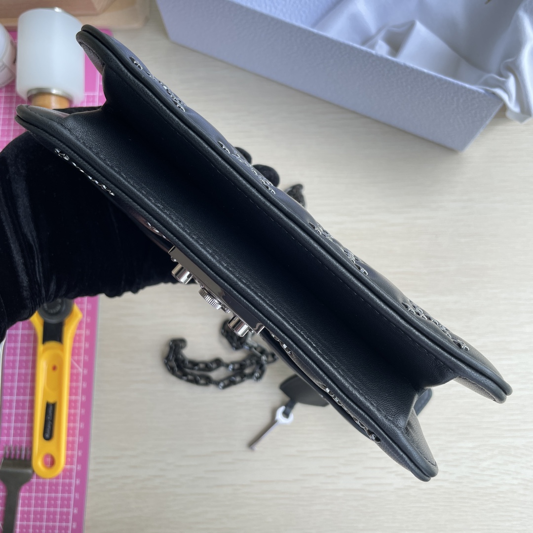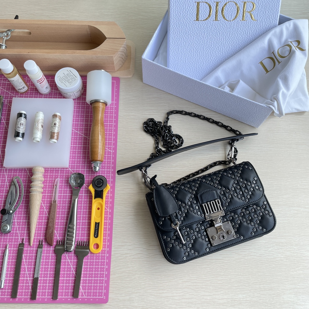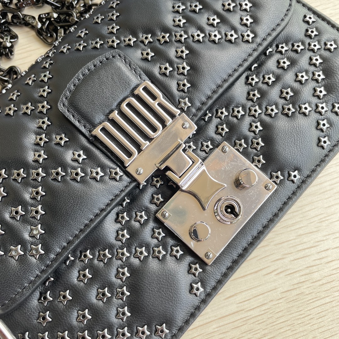 High-end quality, not ordinary market goods. This Dior Addict handbag stylishly showcases Dior's elegant classic logo. Crafted meticulously from black lambskin, it features a Lucky Star cannage pattern adorned with hand-decorated stars, offering a fresh interpretation of the iconic design. The flap is paired with a gunmetal-finished metal "DIOR" clasp and a detachable top handle. The small style comes with a chain shoulder strap, allowing it to be carried by hand, on the shoulder, or crossbody. Dimensions: 21×8×13. Color: Black. Model: 5821