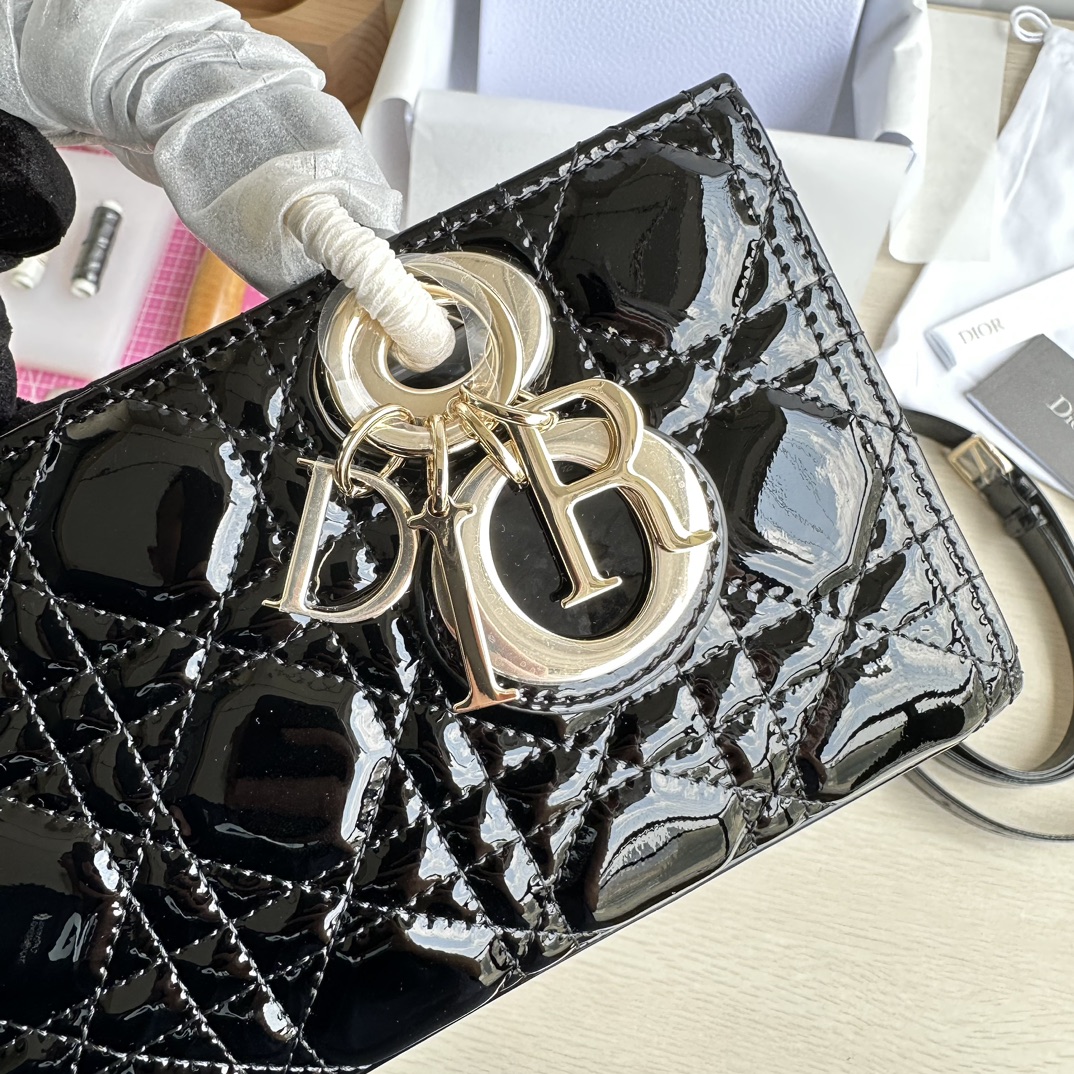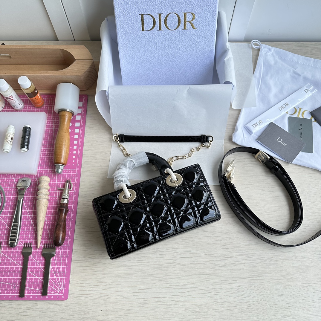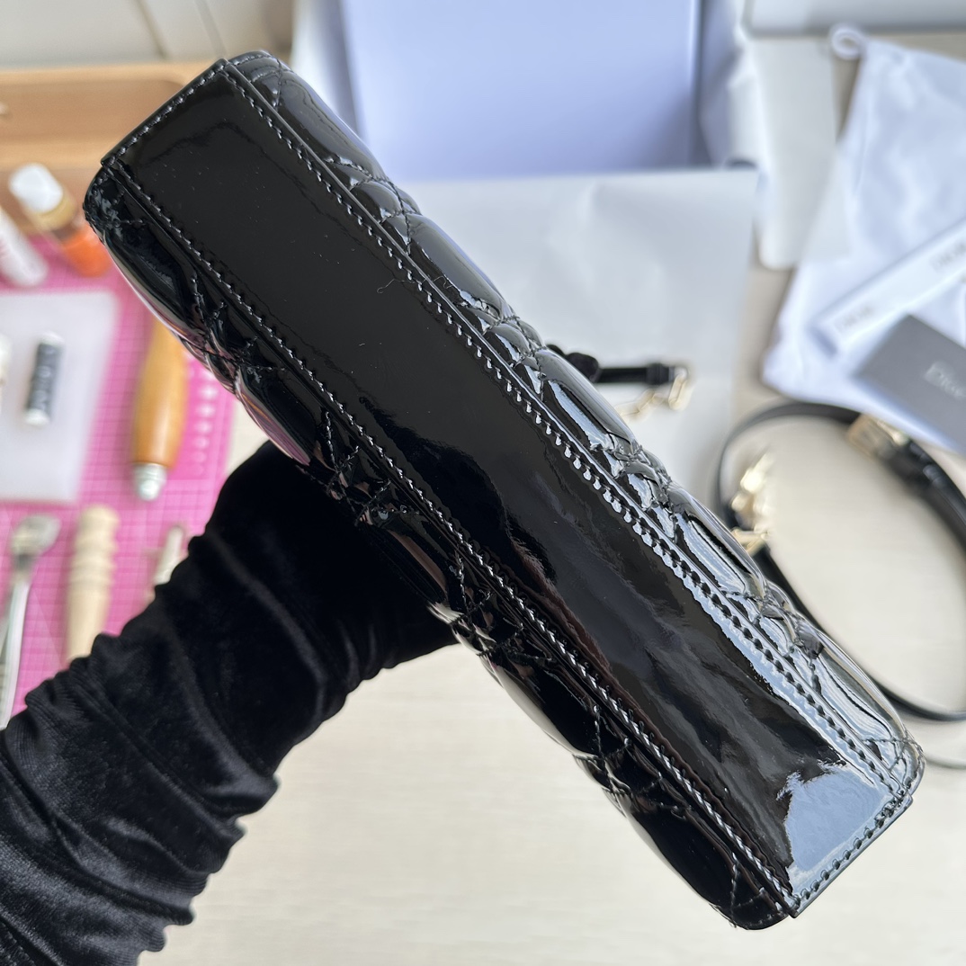 Lady D-Joy handbag is the new season product, highlighting the minimalist aesthetics of the Lady Dior collection, embodying Dior's profound insight into elegance and beauty. Made of black patent leather, the fashionable and elegant design is timeless. Adorned with cannage stitching and accented with light gold-finished metal D.I.O.R. charm to enhance the style. Equipped with a detachable chain strap and an adjustable, detachable leather strap, it can be carried by hand, on the shoulder, or cross-body, making it an ideal companion for day or evening wear. D.I.O.R. charm, detachable chain strap, adjustable leather strap. Dimensions: 22×12×6. Color: Black patent leather. Model: 0613
