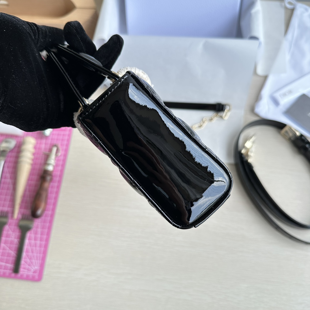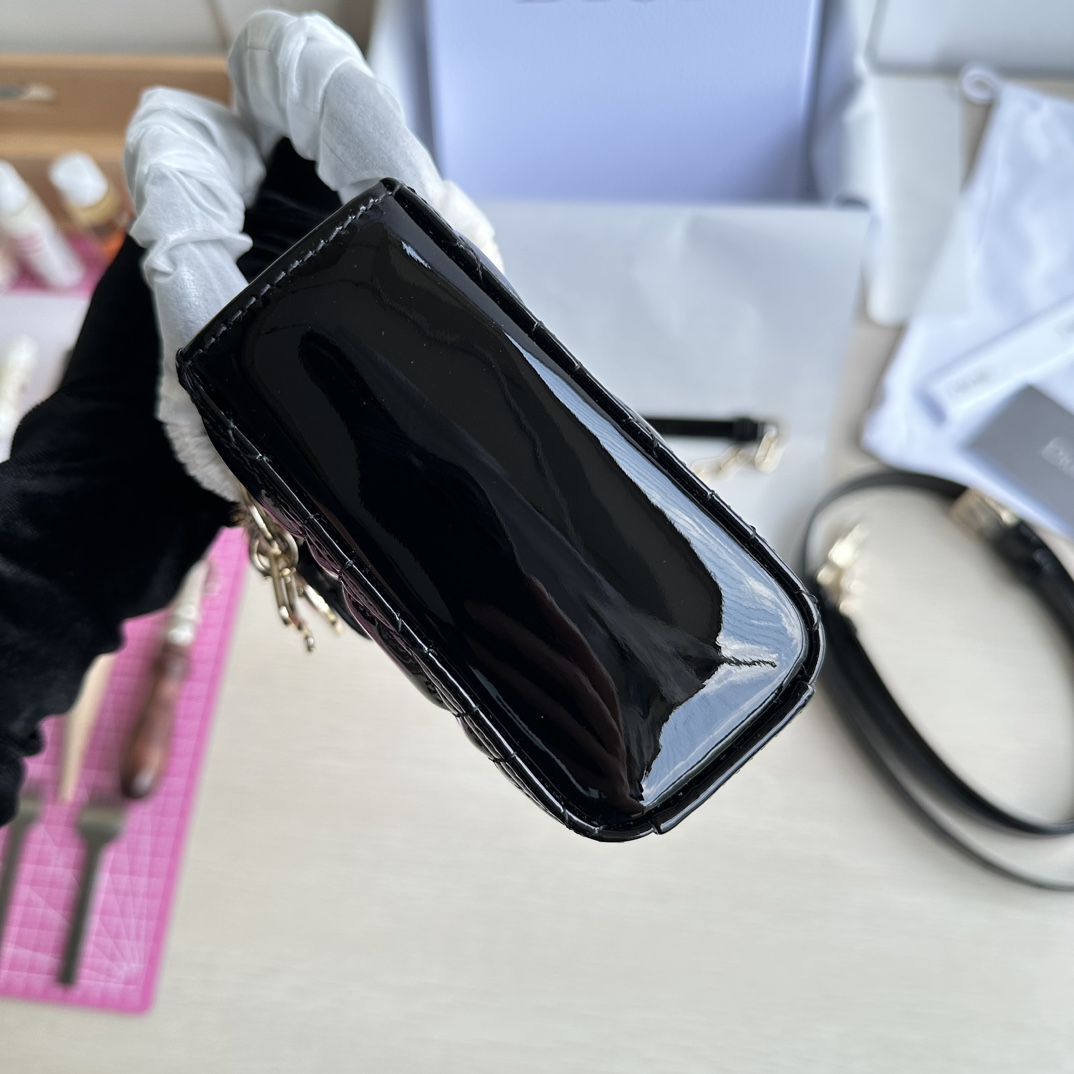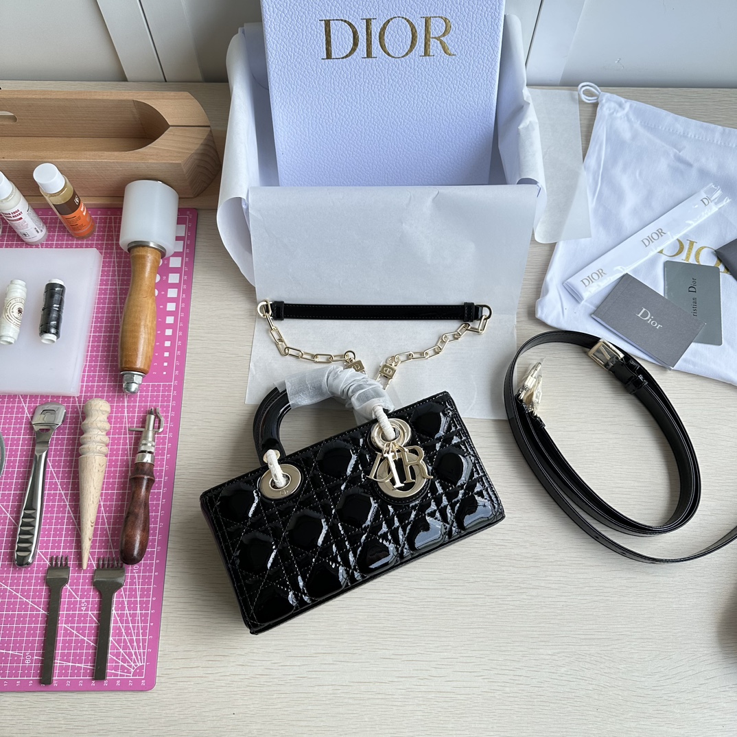 Lady D-Joy handbag is the new season product, highlighting the minimalist aesthetics of the Lady Dior collection, embodying Dior's profound insight into elegance and beauty. Made of black patent leather, the fashionable and elegant design is timeless. Adorned with cannage stitching and accented with light gold-finished metal D.I.O.R. charm to enhance the style. Equipped with a detachable chain strap and an adjustable, detachable leather strap, it can be carried by hand, on the shoulder, or cross-body, making it an ideal companion for day or evening wear. D.I.O.R. charm, detachable chain strap, adjustable leather strap. Dimensions: 22×12×6. Color: Black patent leather. Model: 0613