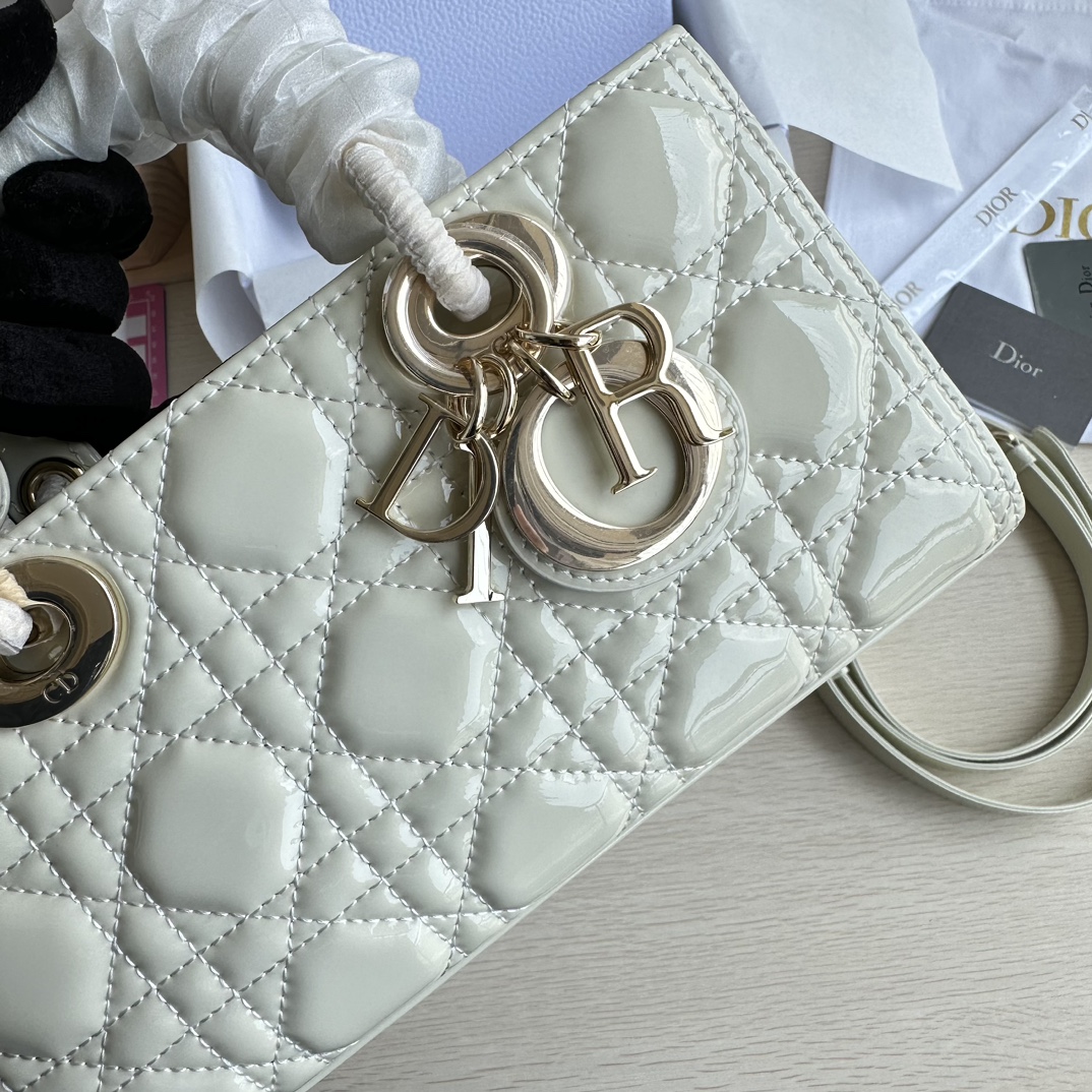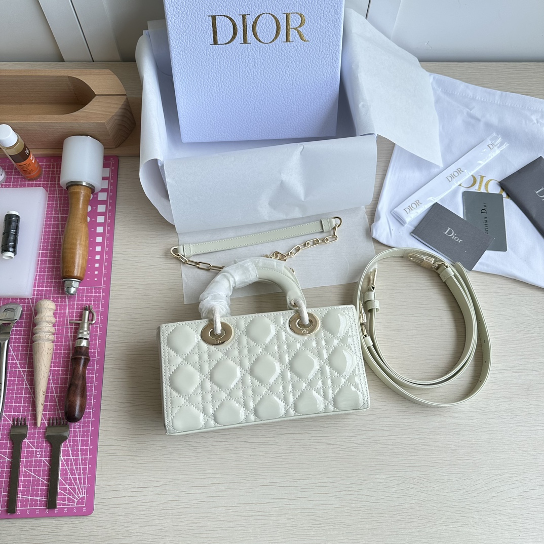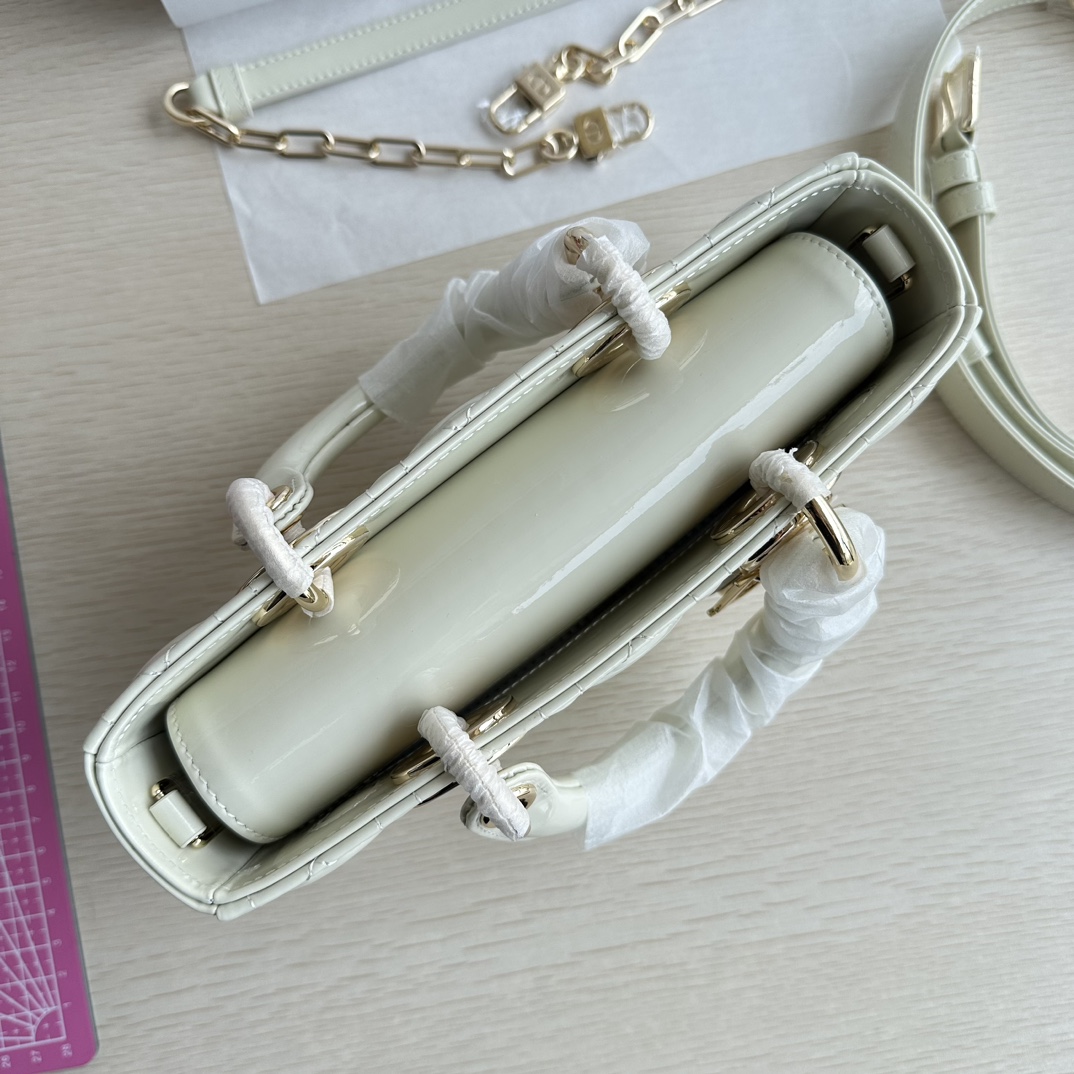 Lady D-Joy handbag is the new season product, highlighting the minimalist aesthetics of the Lady Dior collection, embodying Dior's profound insight into elegance and beauty. Made of milky white patent leather with a timeless and elegant design. Adorned with cannage stitching and a light gold-finished metal D.I.O.R. charm to enhance the style. Comes with a detachable chain strap and an adjustable, detachable leather strap, can be carried by hand, on the shoulder, or cross-body, ideal for day or evening wear. D.I.O.R. charm, detachable chain strap, adjustable leather strap. Dimensions: 22×12×6. Color: Milky White Patent Leather. Model: 0613