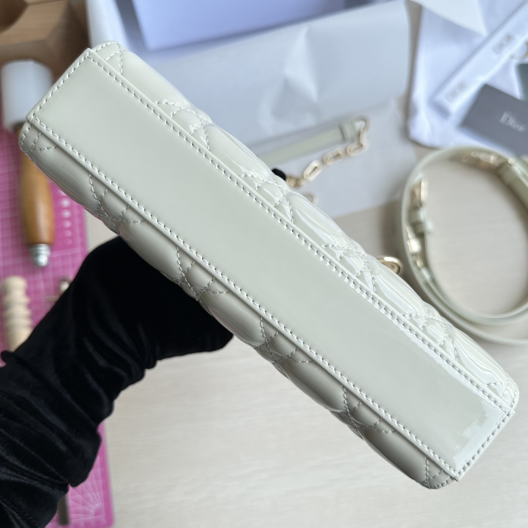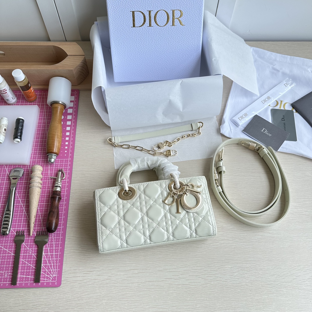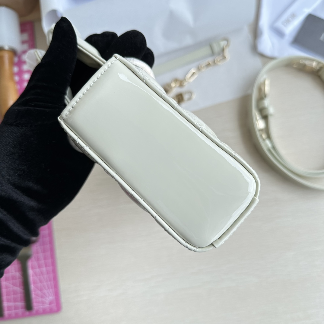 Lady D-Joy handbag is the new season product, highlighting the minimalist aesthetics of the Lady Dior collection, embodying Dior's profound insight into elegance and beauty. Made of milky white patent leather with a timeless and elegant design. Adorned with cannage stitching and a light gold-finished metal D.I.O.R. charm to enhance the style. Comes with a detachable chain strap and an adjustable, detachable leather strap, can be carried by hand, on the shoulder, or cross-body, ideal for day or evening wear. D.I.O.R. charm, detachable chain strap, adjustable leather strap. Dimensions: 22×12×6. Color: Milky White Patent Leather. Model: 0613