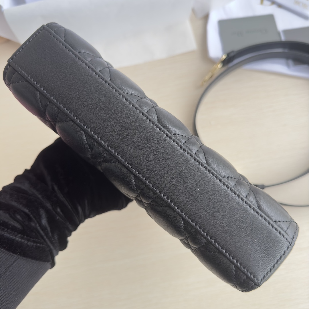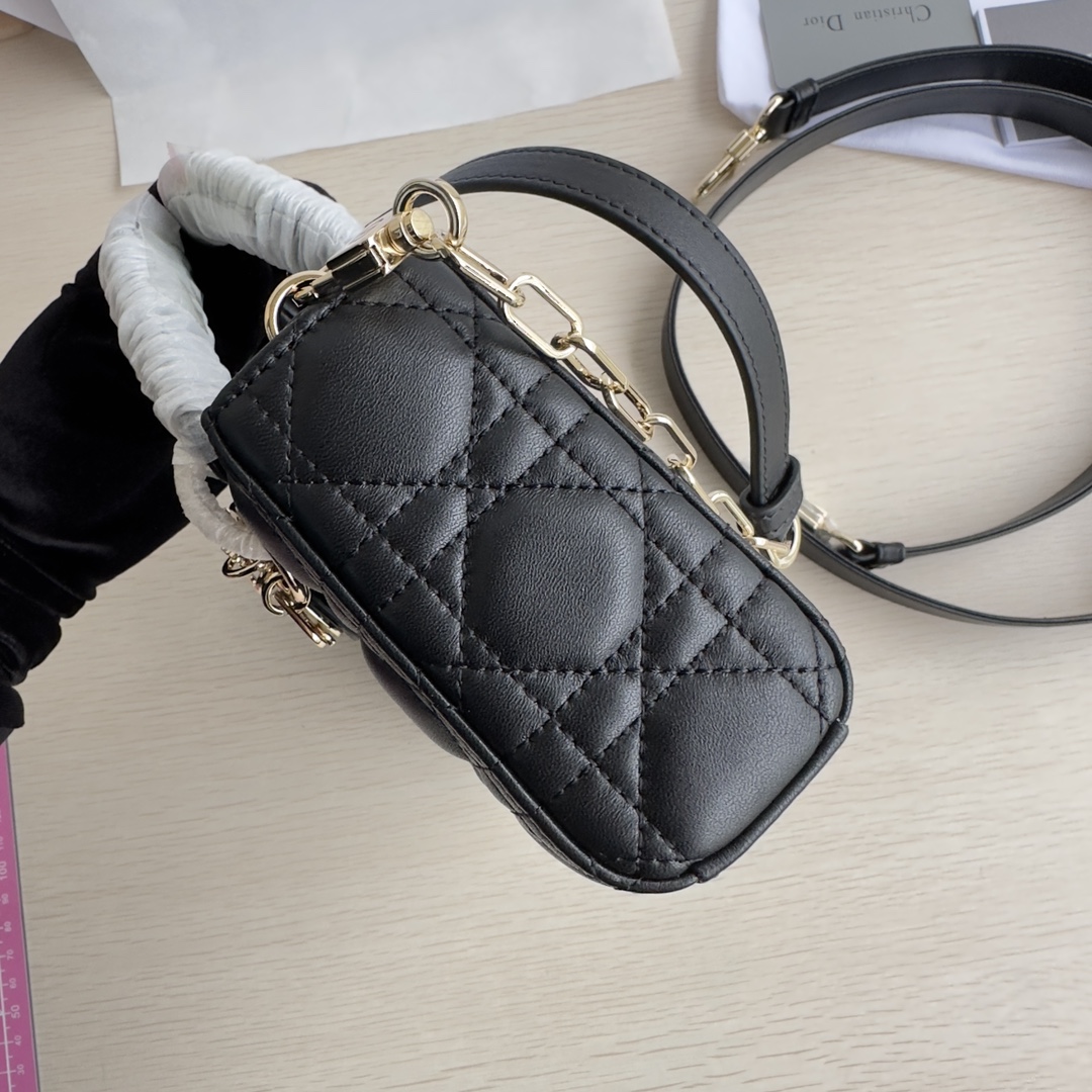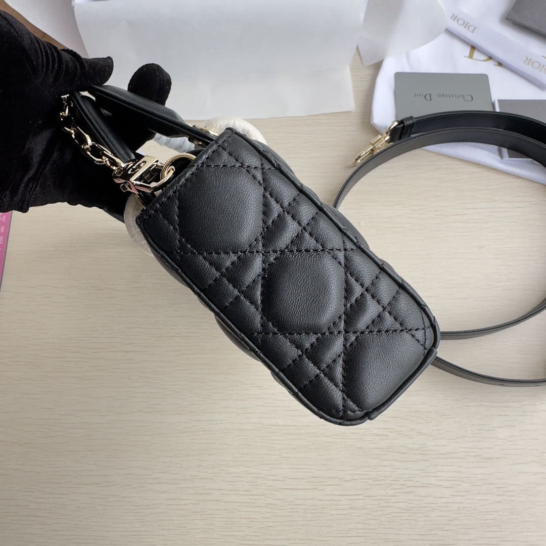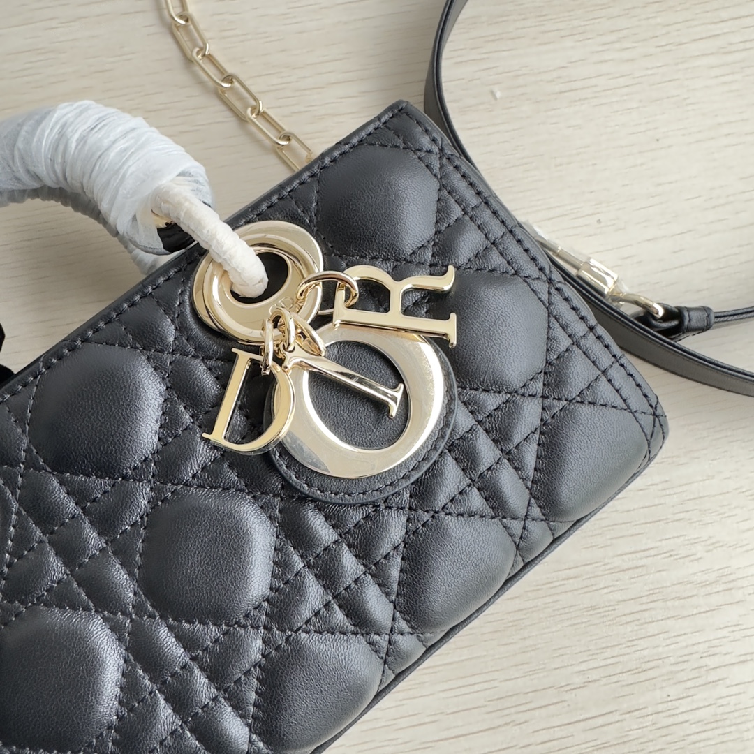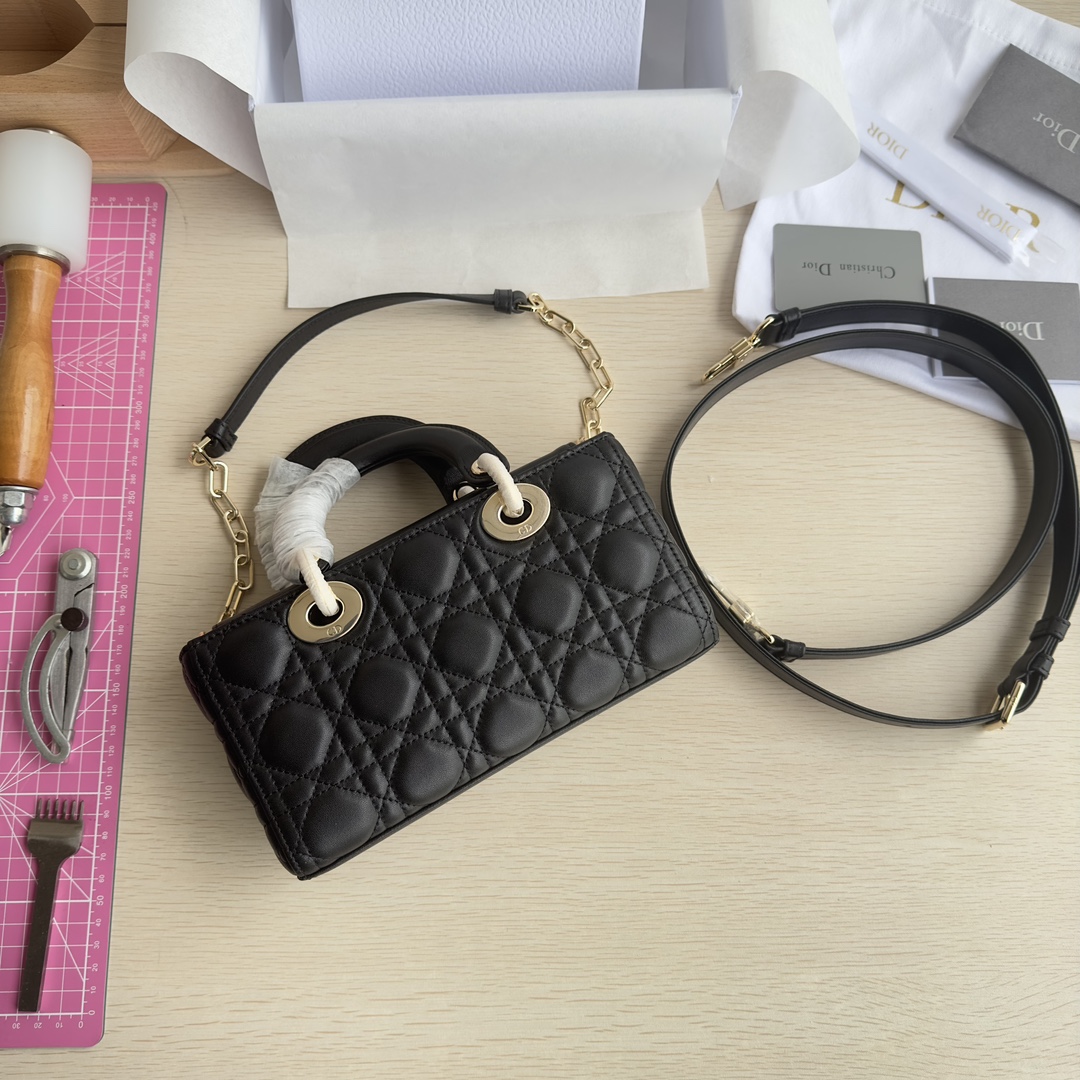 Lady D-Joy handbag is the new season product, highlighting the minimalist aesthetics of the Lady Dior collection, embodying Dior's profound insight into elegance and beauty. Meticulously crafted from black lambskin, the stylish and elegant design is timeless. Adorned with cannage stitching and accented with a light gold-finished metal D.I.O.R. charm to enhance the style. Equipped with a detachable chain strap and an adjustable, detachable leather strap, it can be carried by hand, on the shoulder, or cross-body, making it an ideal companion for day or evening wear. D.I.O.R. charm, detachable chain strap, adjustable leather strap. Dimensions: 22×12×6. Color: Black. Model: 0613