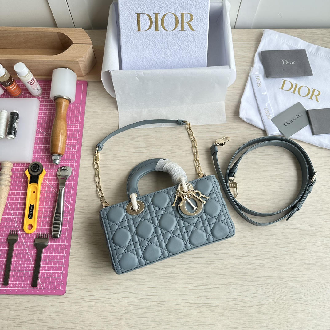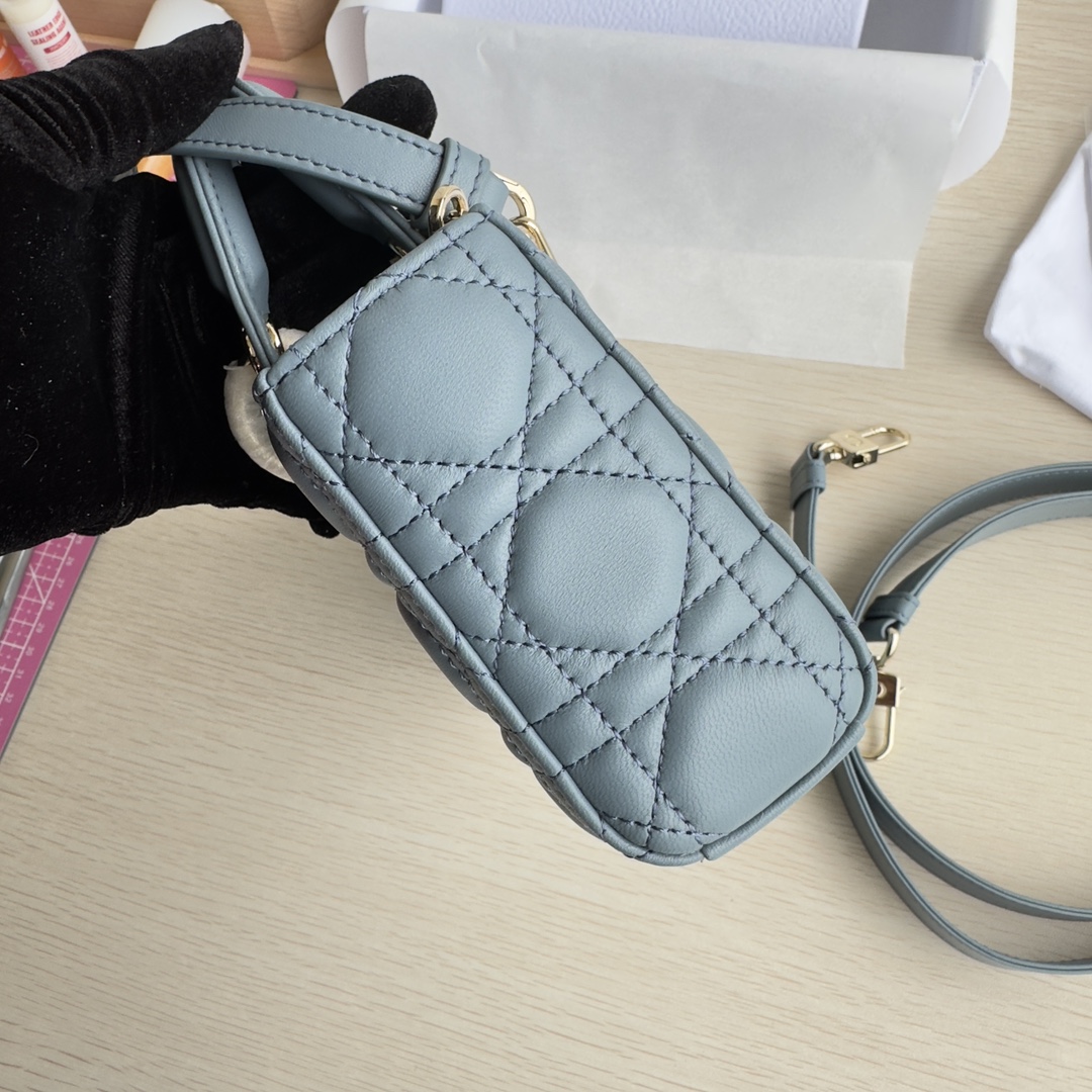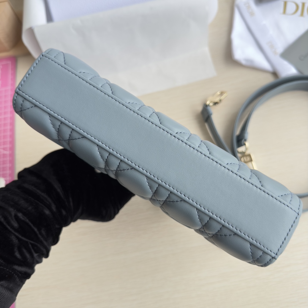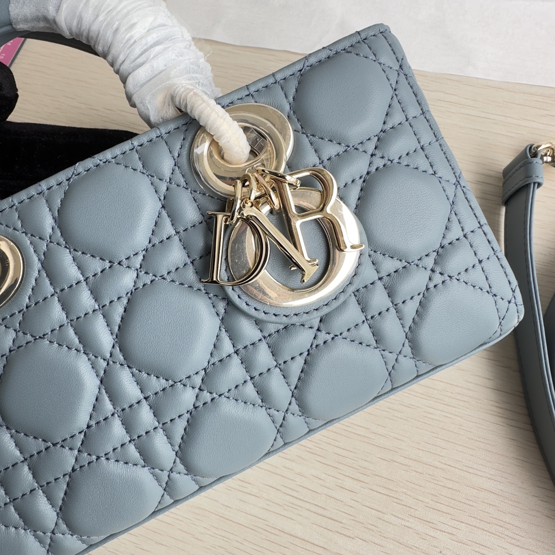 Lady D-Joy handbag is the new season product, highlighting the minimalist aesthetics of the Lady Dior collection, embodying Dior's profound insight into elegance and beauty. Meticulously crafted from black lambskin, the fashionable and elegant design is timeless. Adorned with cannage stitching and accented with a light gold-finished metal D.I.O.R. charm to enhance the style. Equipped with a detachable chain strap and an adjustable, detachable leather strap, it can be carried by hand, on the shoulder, or cross-body, making it an ideal companion for day or evening wear. D.I.O.R. charm, detachable chain strap, adjustable leather strap. Dimensions: 22×12×6. Color: Cloud Blue. Model: 0613