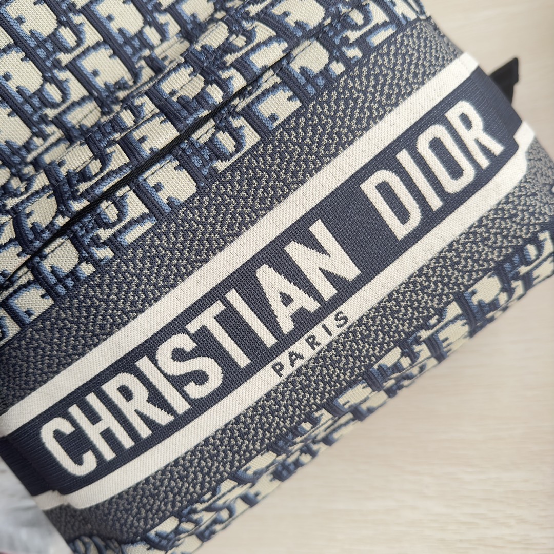 Front adorned with CHRISTIAN DIOR PARIS logo, adjustable shoulder straps, and a front zippered pocket. Model: 6104. Dimensions: 35×41×15. Color: Blue Monogram.