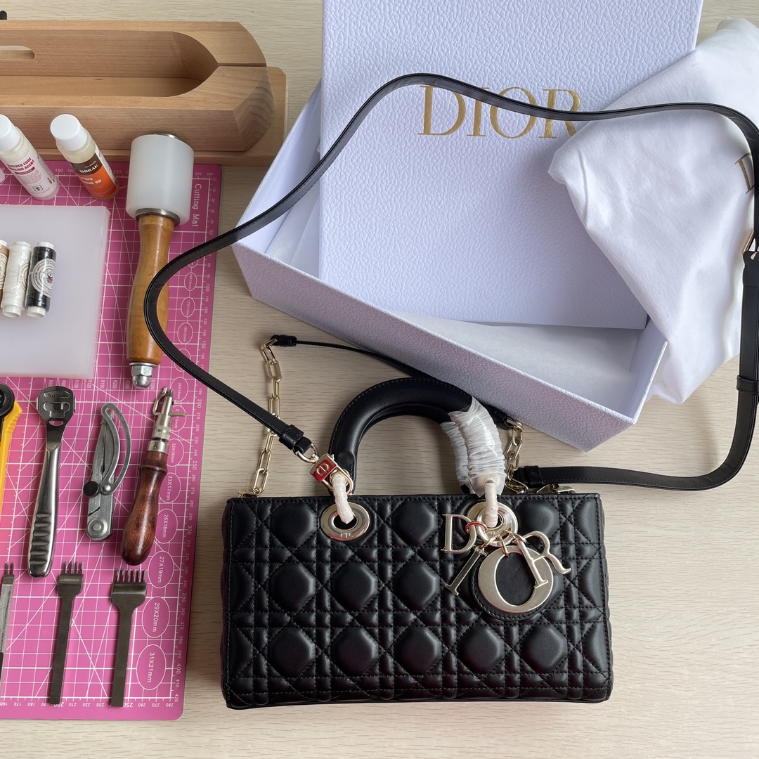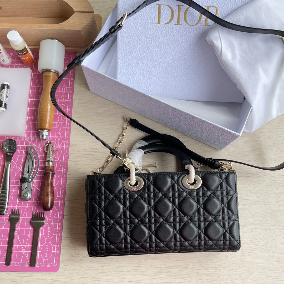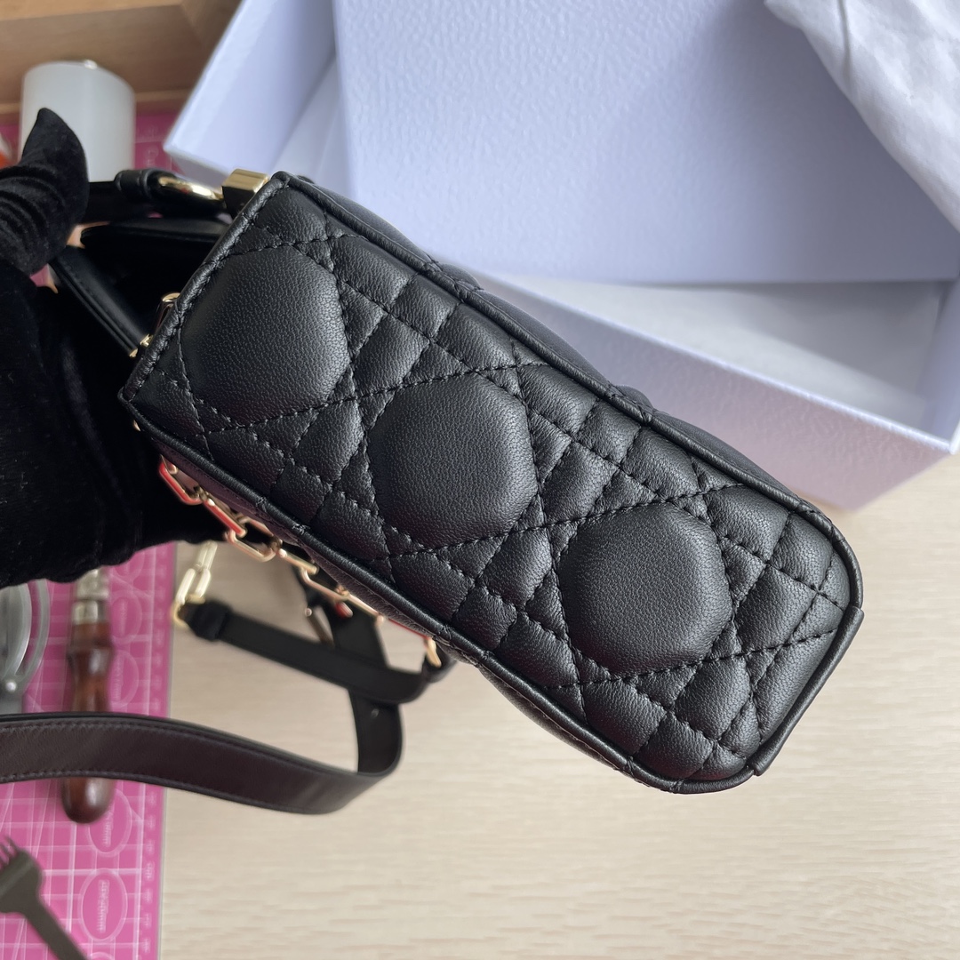 This Lady D-Joy bag interprets Dior's profound insight into elegance and beauty. It features a classic and sophisticated style, crafted from imported lambskin material. The bag is adorned with a gold-toned metal "D.I.O.R." charm that enhances its style, adding a touch of dynamism to the exquisite silhouette. It comes with a detachable chain shoulder strap and an adjustable, removable leather shoulder strap, making it suitable for hand carry, shoulder wear, or cross-body wear—an ideal choice for everyday styling. Dimensions: 26 x 13.5 x 5 cm