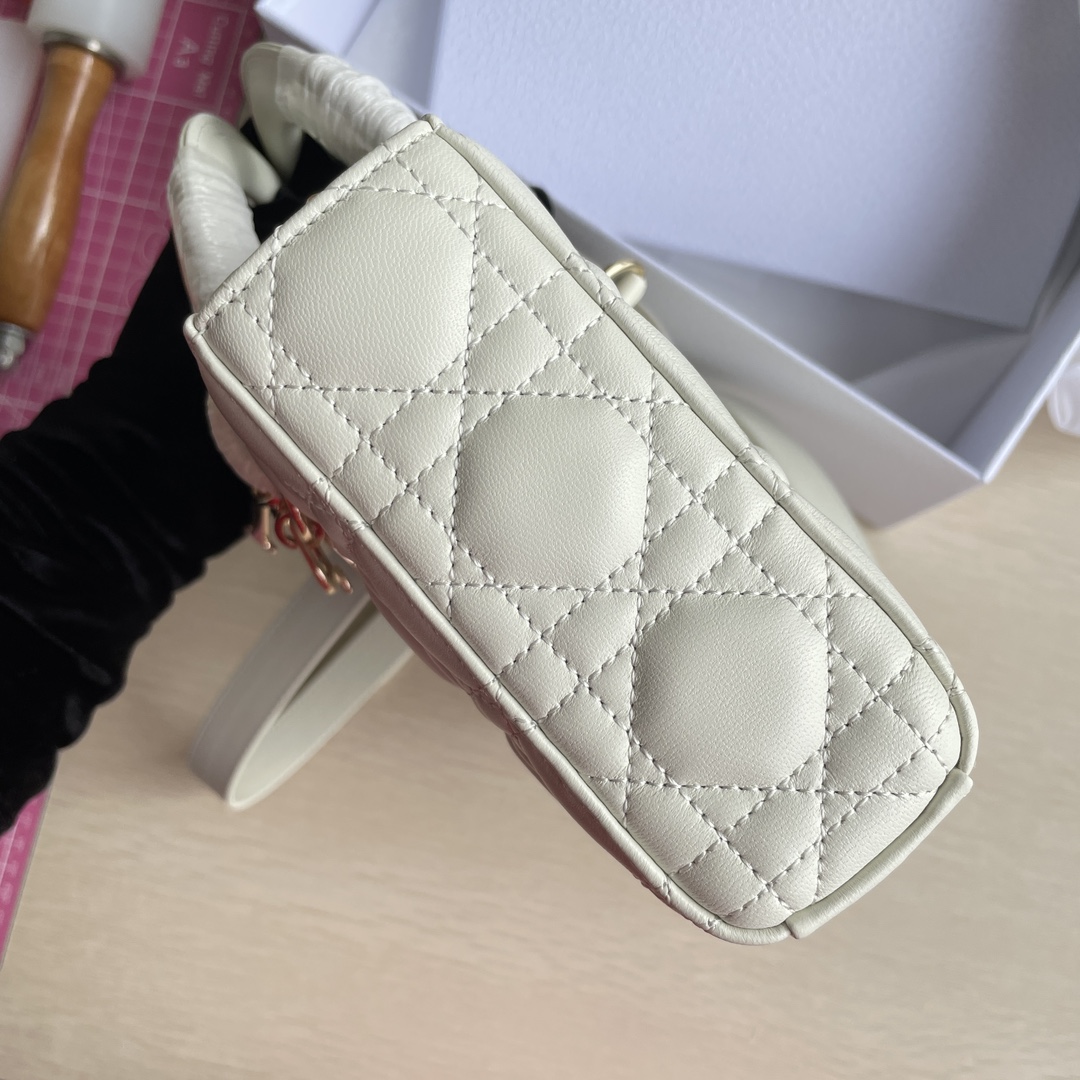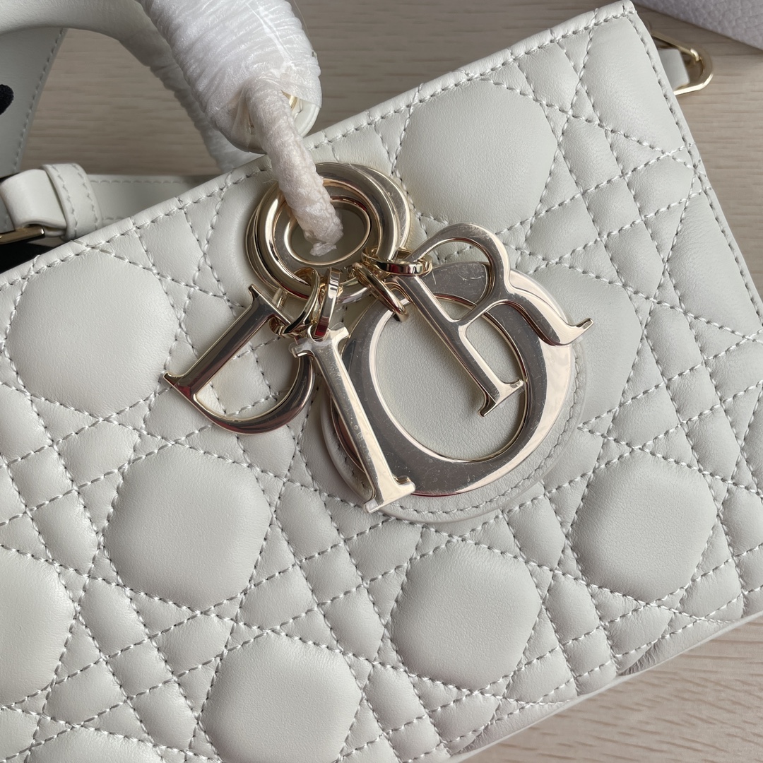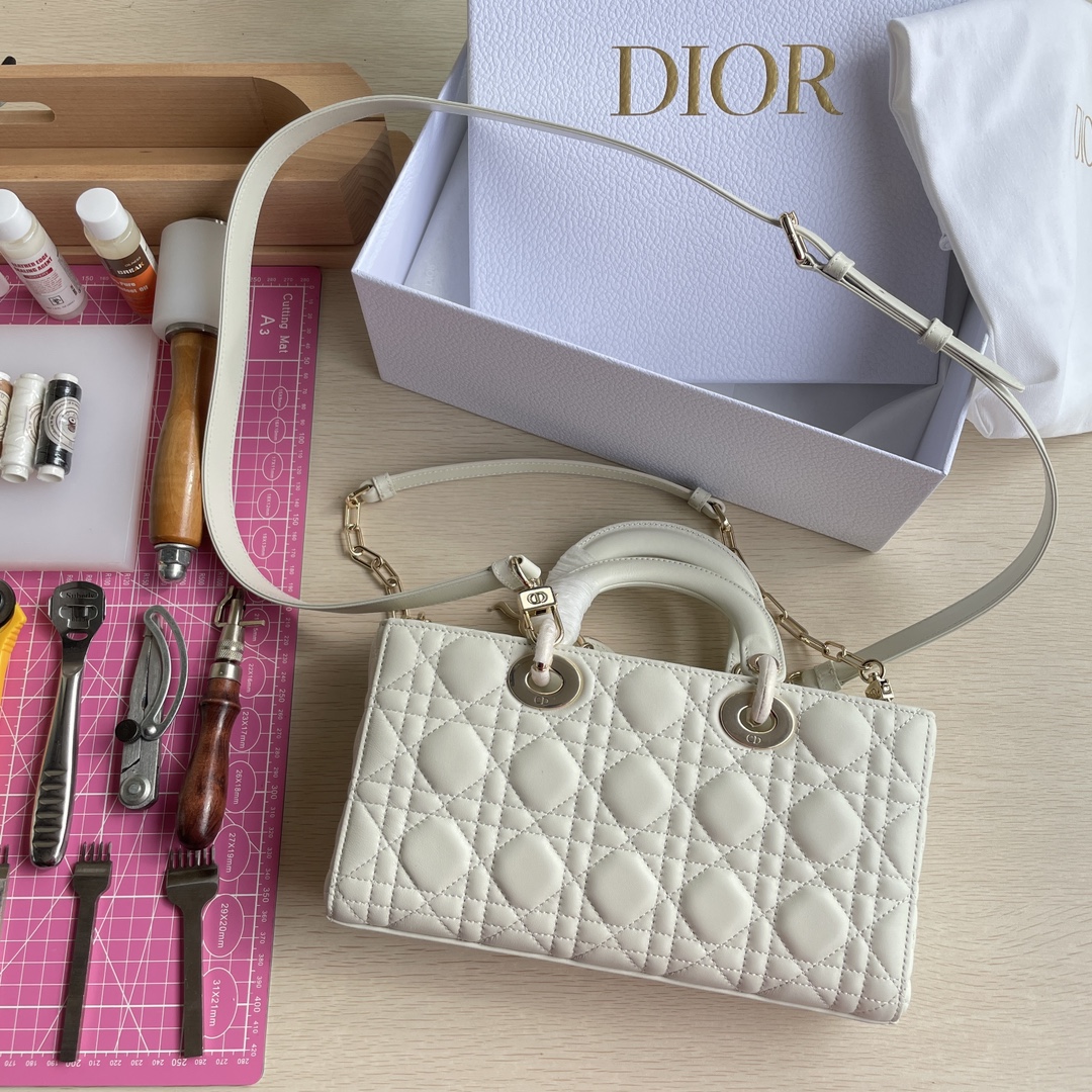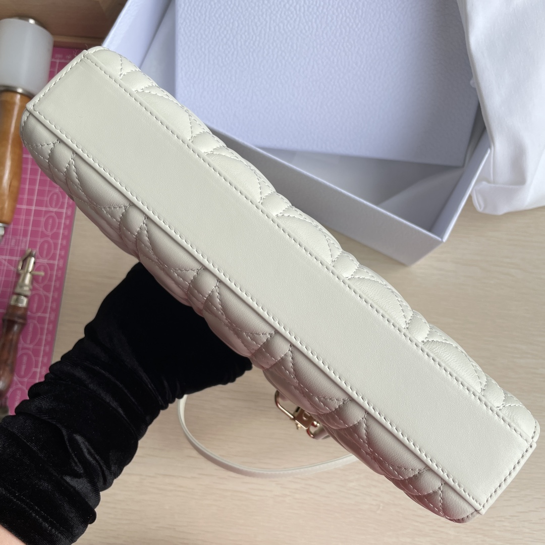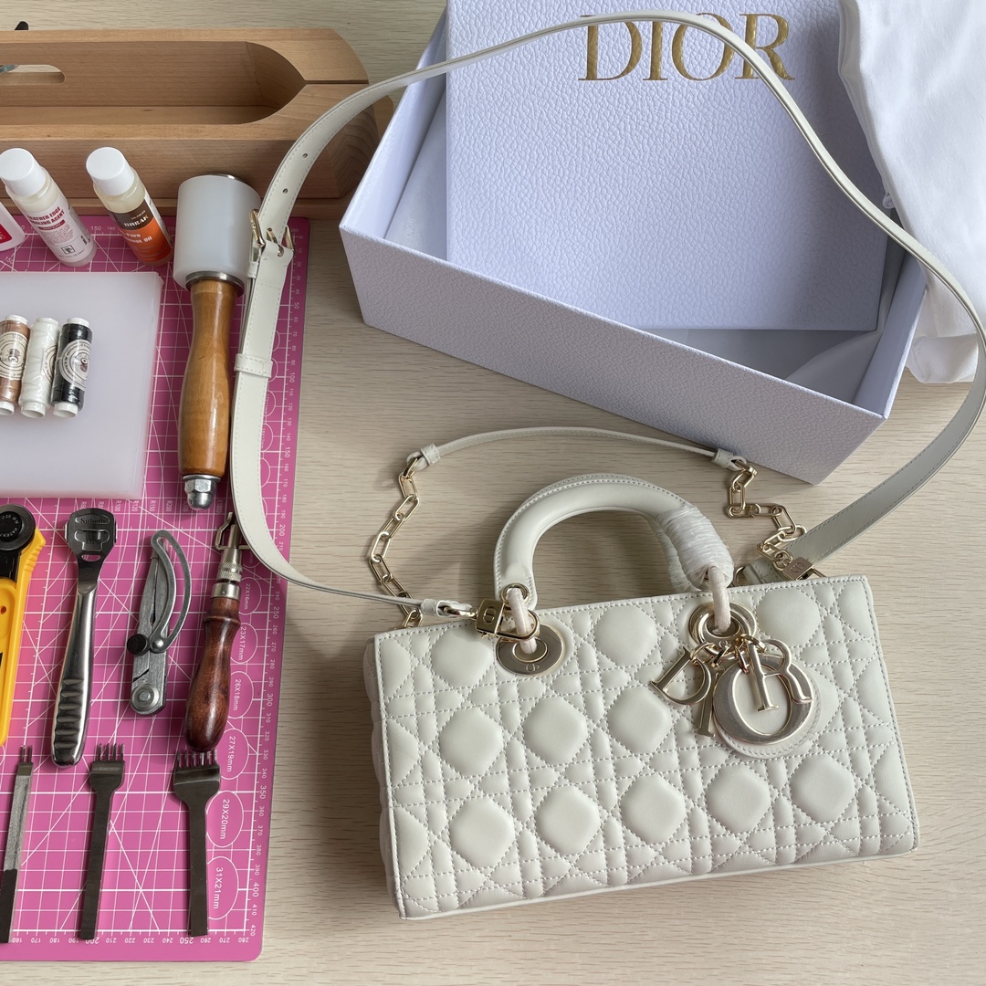 This Lady D-Joy bag interprets Dior's profound insight into elegance and beauty. It features a classic and sophisticated style, crafted from imported lambskin material. The bag is adorned with a gold-tone metal "D.I.O.R." charm that enhances its style, adding a touch of dynamism to the exquisite silhouette. It comes with a detachable chain shoulder strap and an adjustable, removable leather shoulder strap, making it suitable for hand carry, shoulder wear, or cross-body wear—ideal for everyday styling. Dimensions: 26 x 13.5 x 5 cm