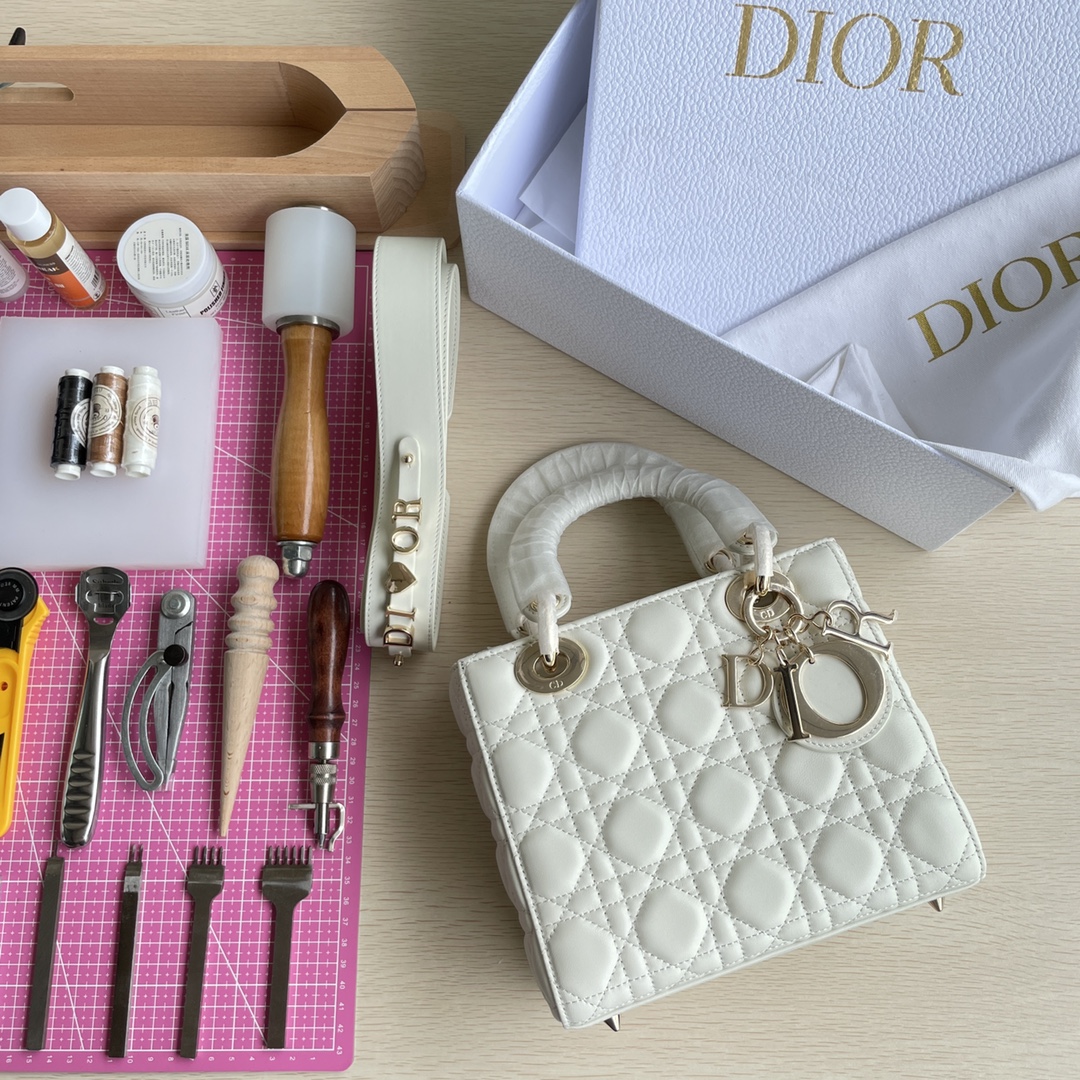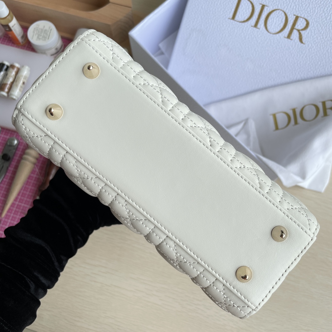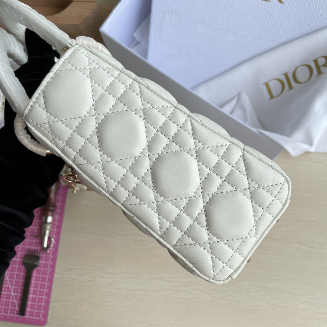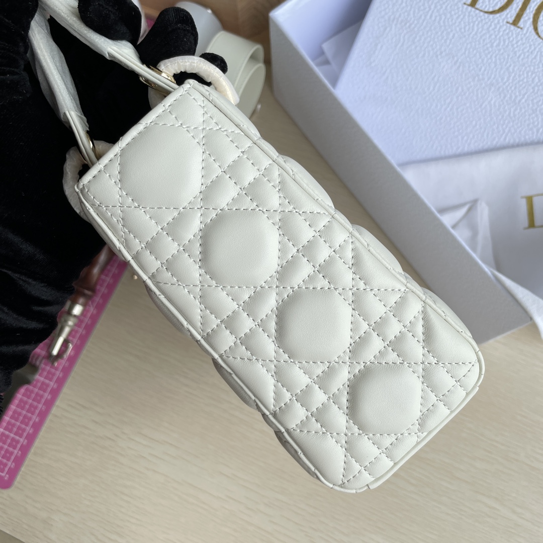 LADY D-JOY handbag This Lady D-Joy handbag interprets Dior's profound insight into elegance and beauty. The elegant and classic style is made of lambskin fabric. It is paired with a gray metal "D.I.O.R." charm to enhance the style, adding a touch of agility to the exquisite silhouette. It comes with a detachable and adjustable leather shoulder strap that can be carried by hand, on the shoulder, or across the body, making it an ideal choice for daily styling. Color: Off-white. Dimensions: Four compartments 20.5*8.5*17