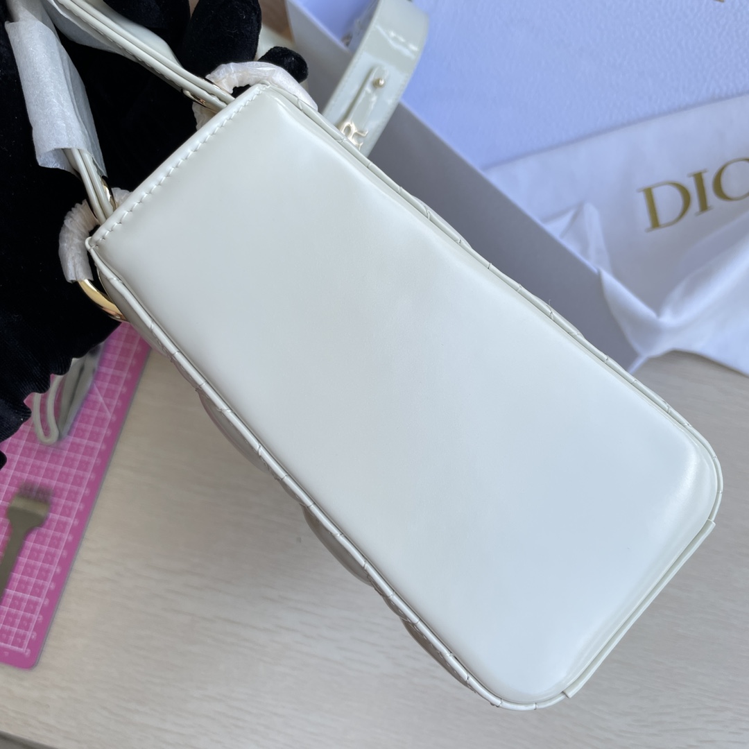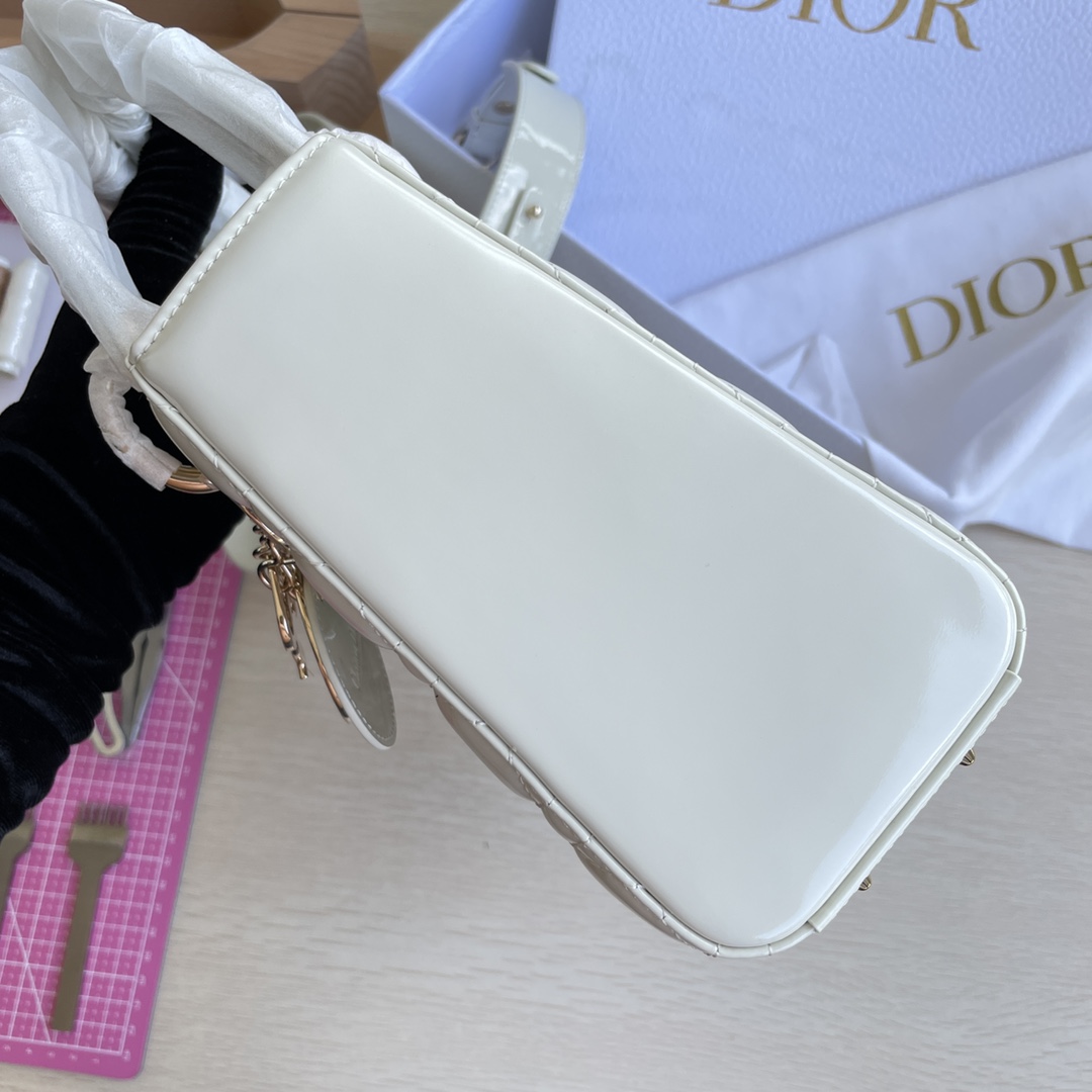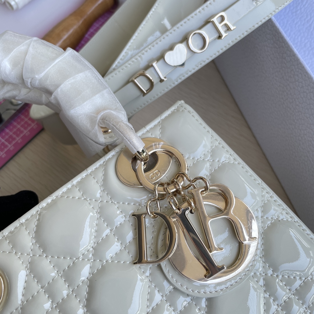 High-end quality, not ordinary market goods! LADY D-JOY Handbag. This Lady D-Joy handbag interprets Dior's profound insight into elegance and beauty. The elegant and classic style is made of patent leather. It features gray metal hardware with a "D.I.O.R." charm that enhances the style, adding a touch of dynamism to the exquisite silhouette. It comes with a detachable and adjustable leather strap, allowing it to be carried by hand, on the shoulder, or cross-body, making it an ideal choice for everyday styling. Color: Off-white. Dimensions: Four compartments 20.5*8.5*17.