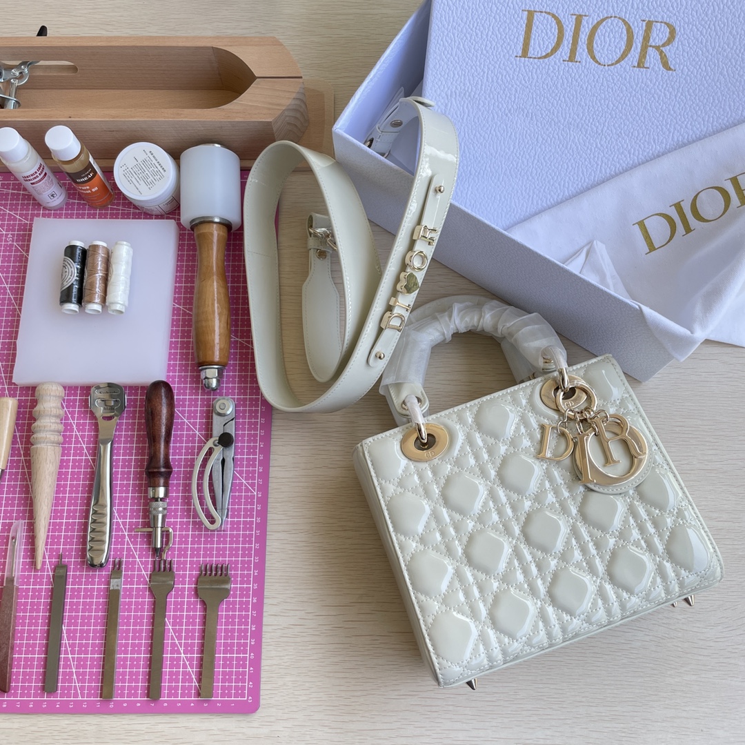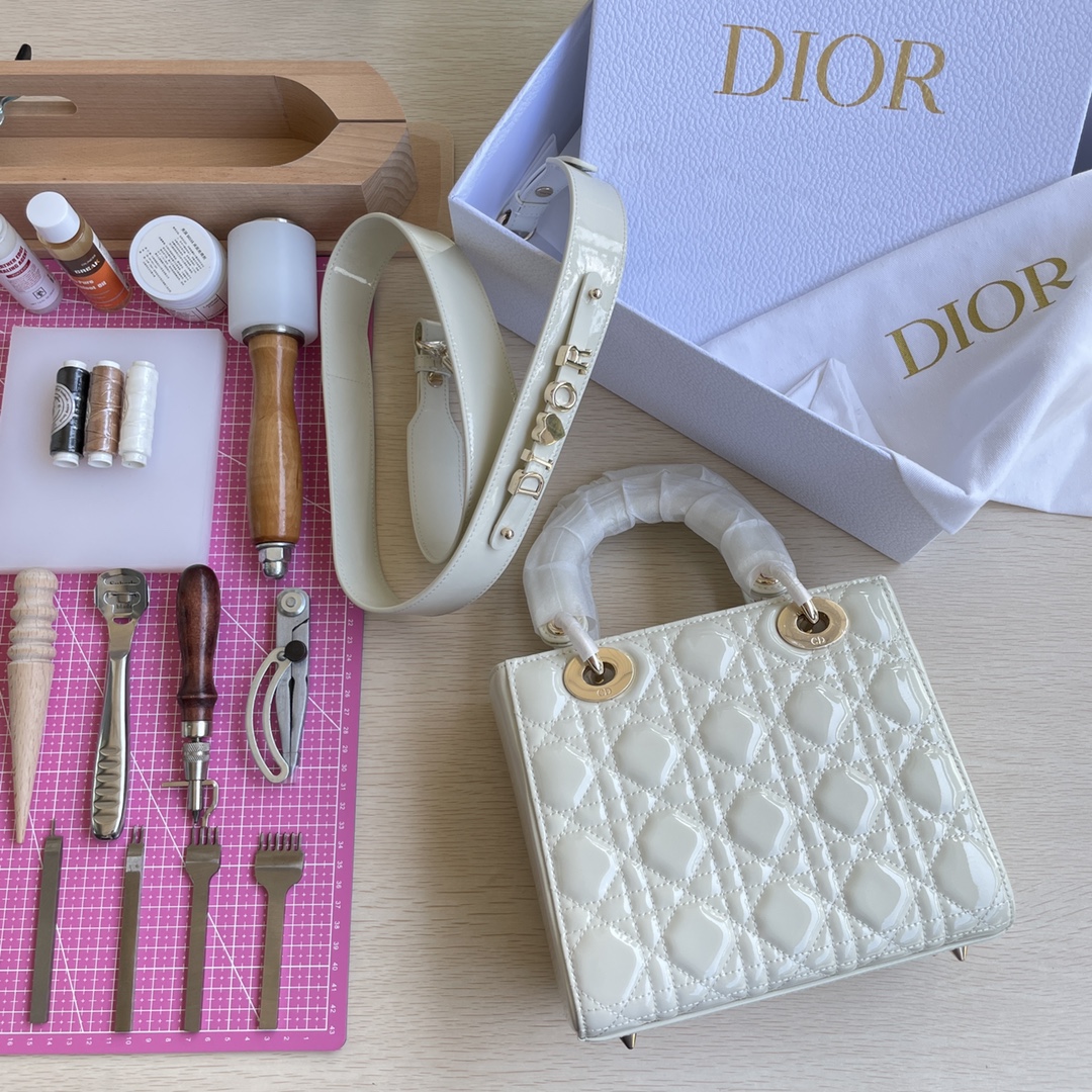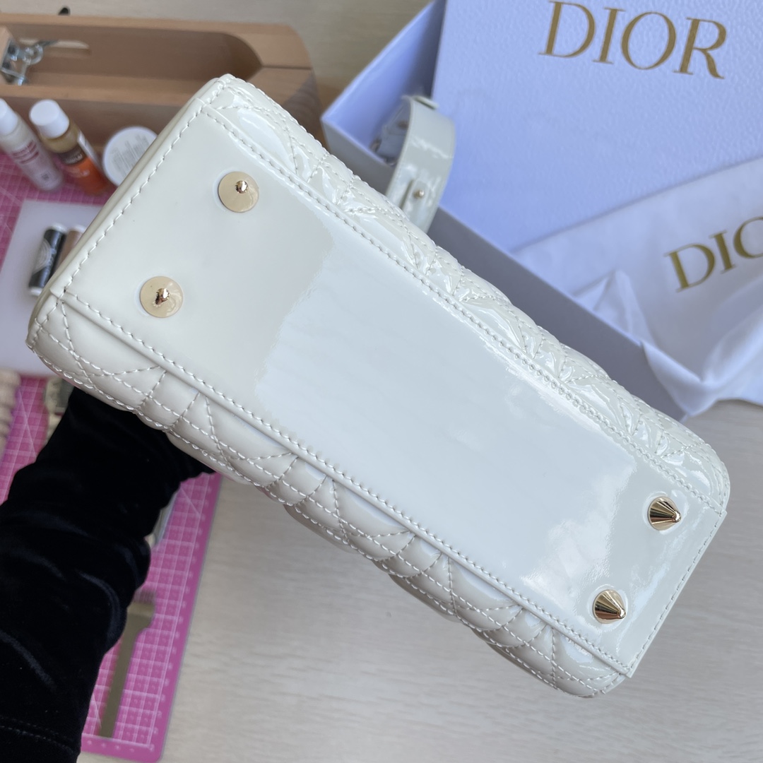 High-end quality, not ordinary market goods! LADY D-JOY Handbag. This Lady D-Joy handbag interprets Dior's profound insight into elegance and beauty. The elegant and classic style is made of patent leather. It features gray metal hardware with a "D.I.O.R." charm that enhances the style, adding a touch of dynamism to the exquisite silhouette. It comes with a detachable and adjustable leather strap, allowing it to be carried by hand, on the shoulder, or cross-body, making it an ideal choice for everyday styling. Color: Off-white. Dimensions: Four compartments 20.5*8.5*17.