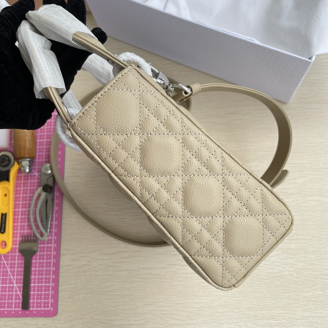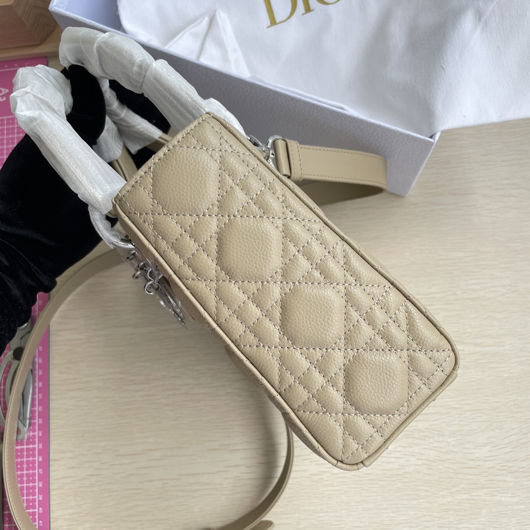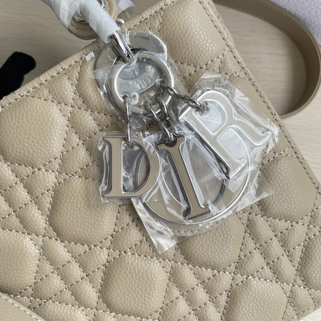 High-end quality, not ordinary market goods. New style, new fabric. This Lady Dior handbag fully embodies Dior's profound insight into elegance and beauty. Meticulously crafted from hazelnut-colored grained calfskin, it features striking quilted details with cannage stitch patterns. The fashionable and elegant design is timeless. A silver-finished metal and enamel "D.I.O.R." charm highlights its graceful temperament. It comes with a detachable leather thin shoulder strap, allowing it to be carried by hand, on the shoulder, or across the body. Dimensions: 20×17×8.