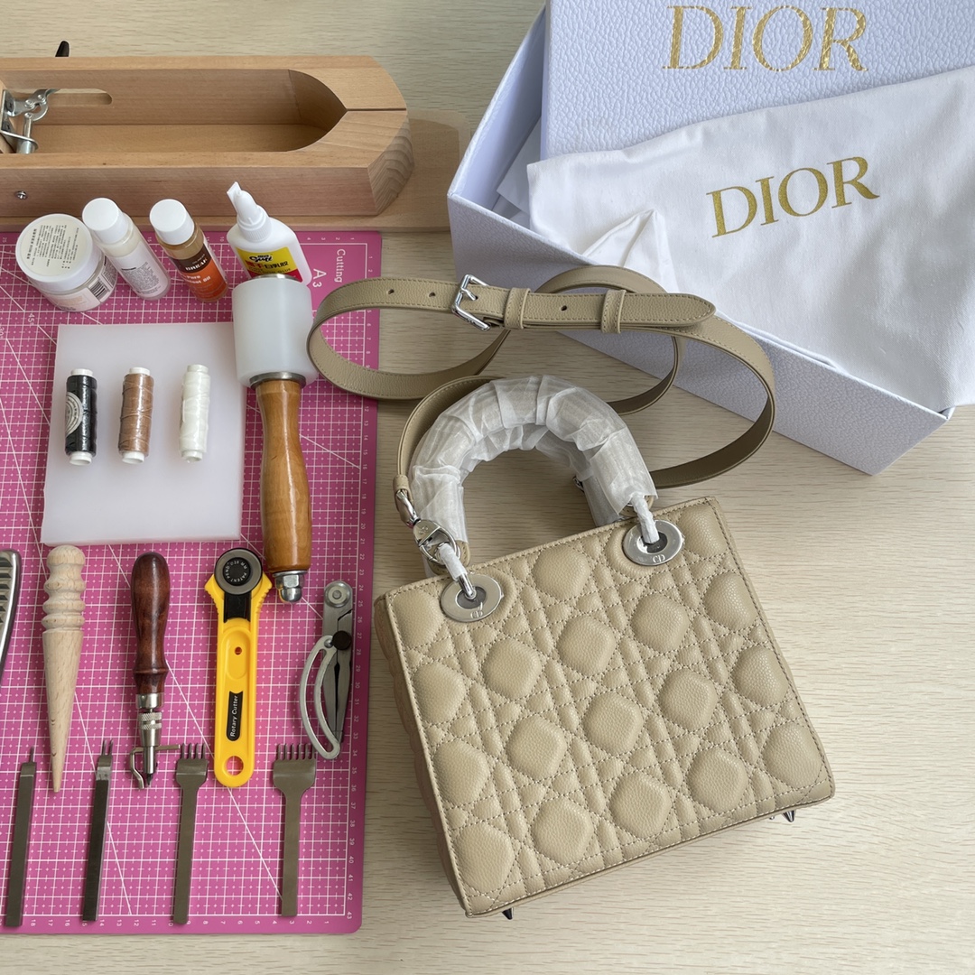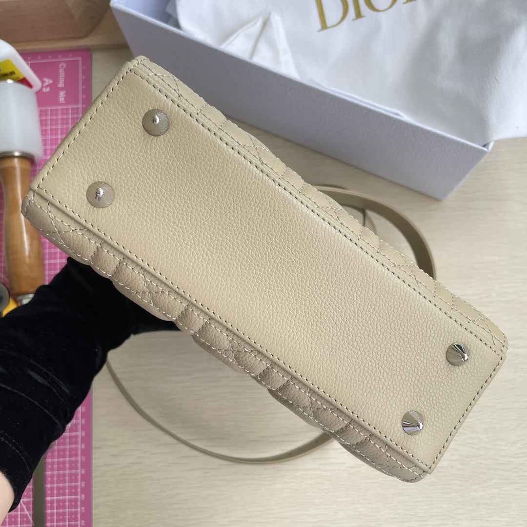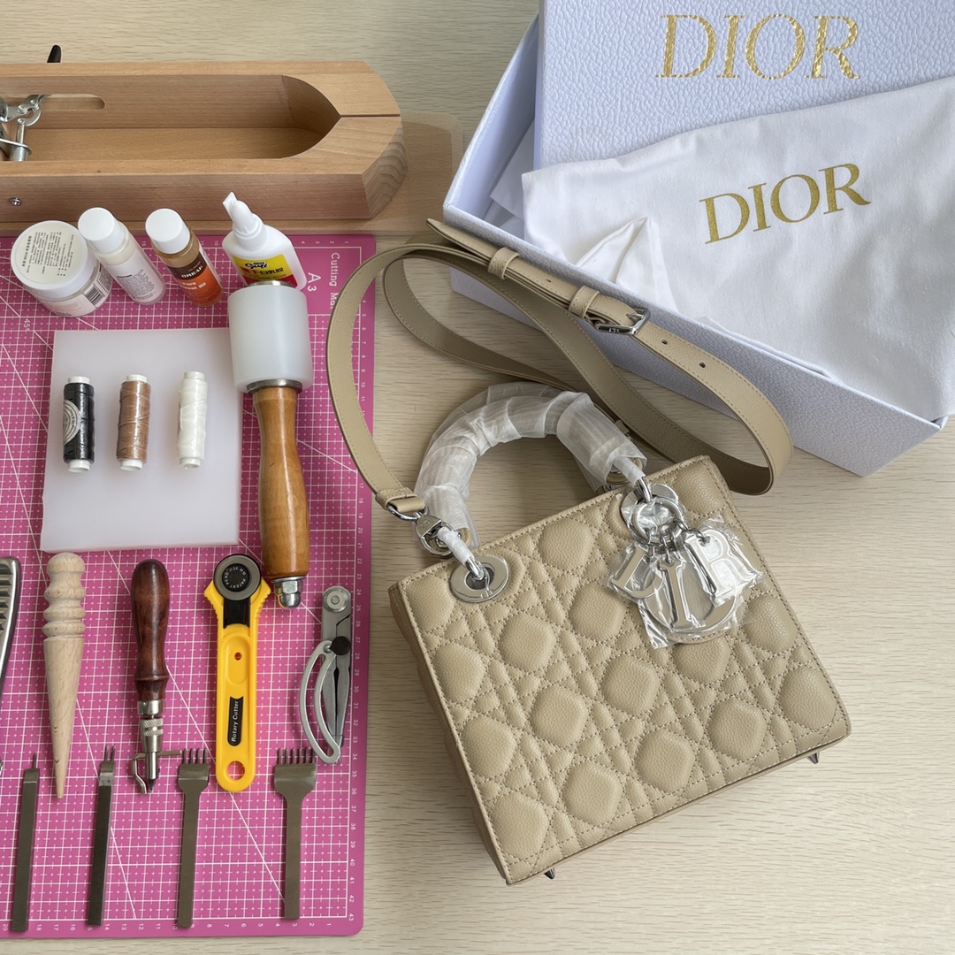 High-end quality, not ordinary market goods. New style, new fabric. This Lady Dior handbag fully embodies Dior's profound insight into elegance and beauty. Meticulously crafted from hazelnut-colored grained calfskin, it features striking quilted details with cannage stitch patterns. The fashionable and elegant design is timeless. A silver-finished metal and enamel "D.I.O.R." charm highlights its graceful temperament. It comes with a detachable leather thin shoulder strap, allowing it to be carried by hand, on the shoulder, or across the body. Dimensions: 20×17×8.
