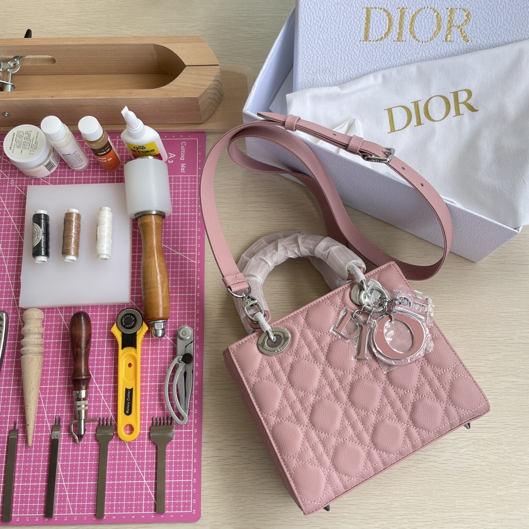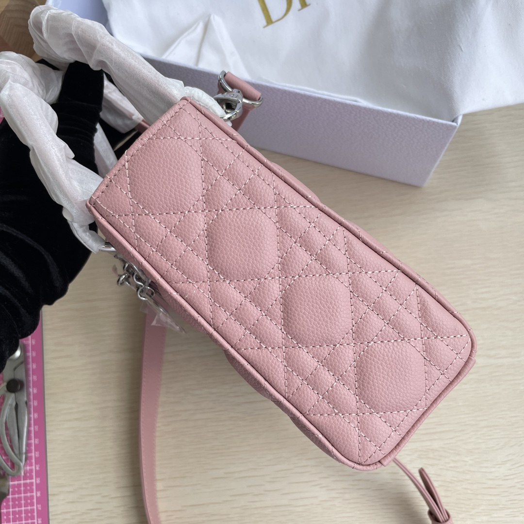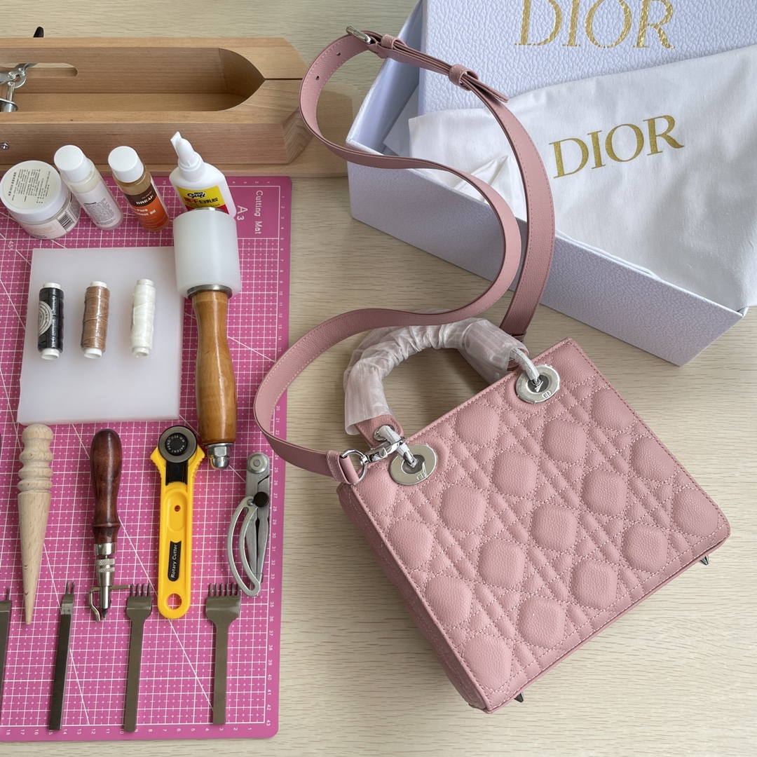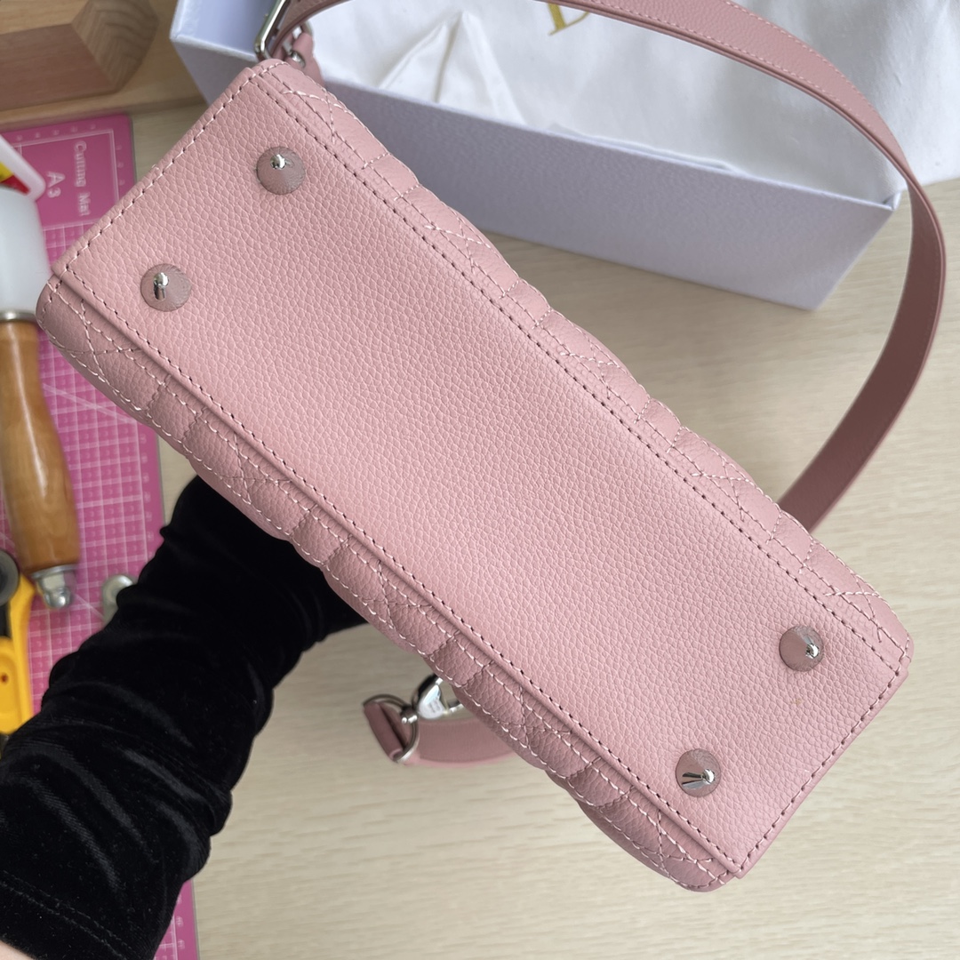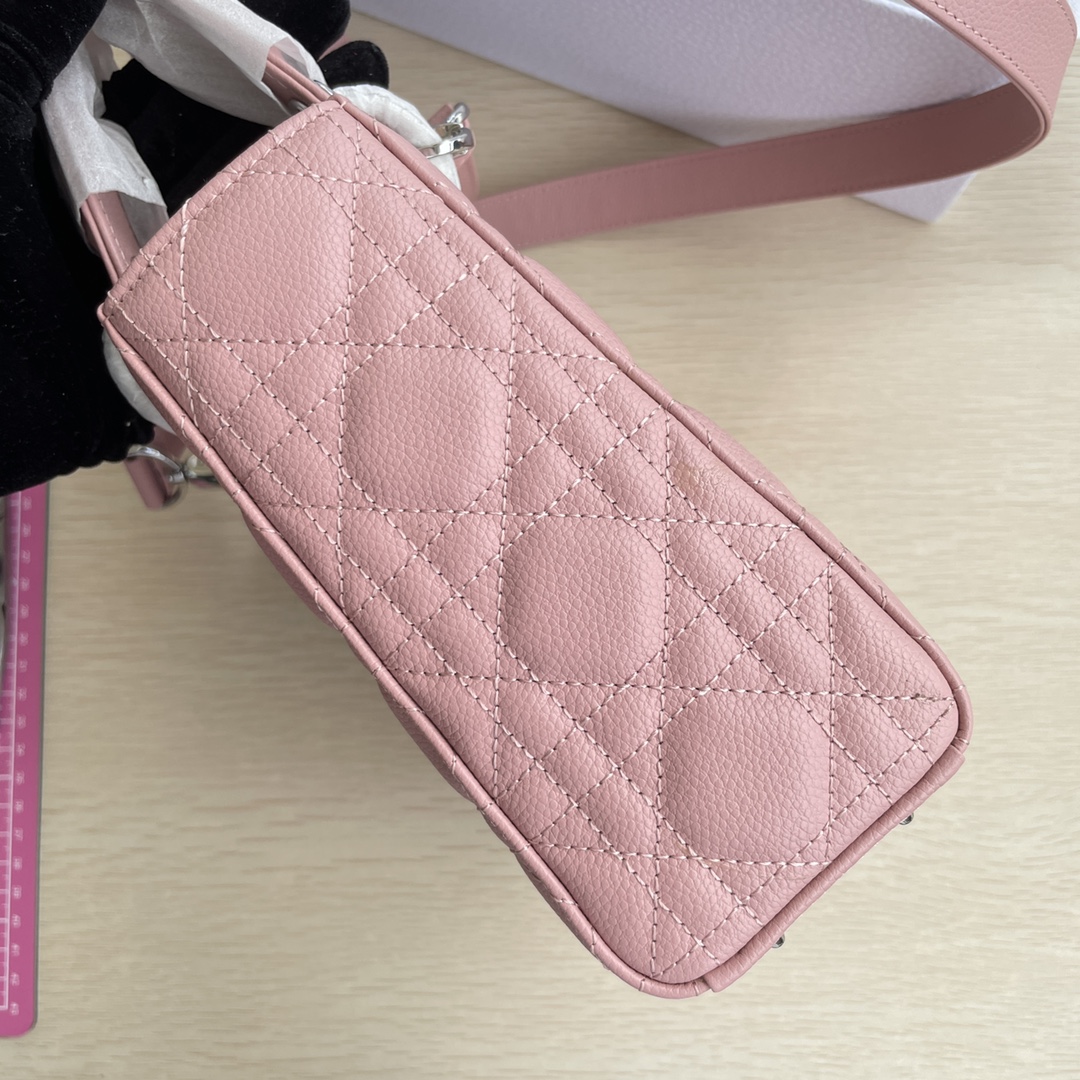 High-end quality, not ordinary market goods. New style and new fabric. This Lady Dior handbag fully embodies Dior's profound insight into elegance and beauty. Meticulously crafted from hazelnut-colored grained calfskin, it features striking quilted details with cannage stitching. The fashionable and elegant design is timeless. Silver-finished metal and enamel "D.I.O.R." charm exudes an elegant temperament. Comes with a detachable leather thin shoulder strap, can be carried by hand, on the shoulder, or across the body. Dimensions: 20×17×8.