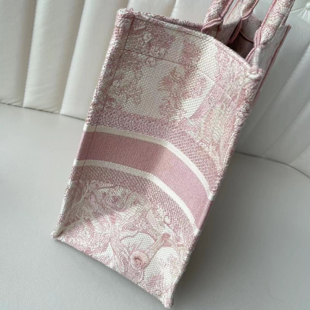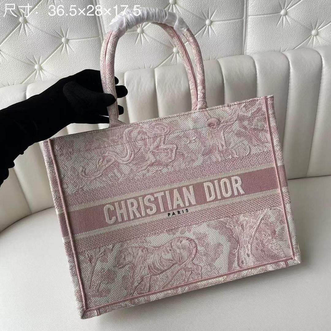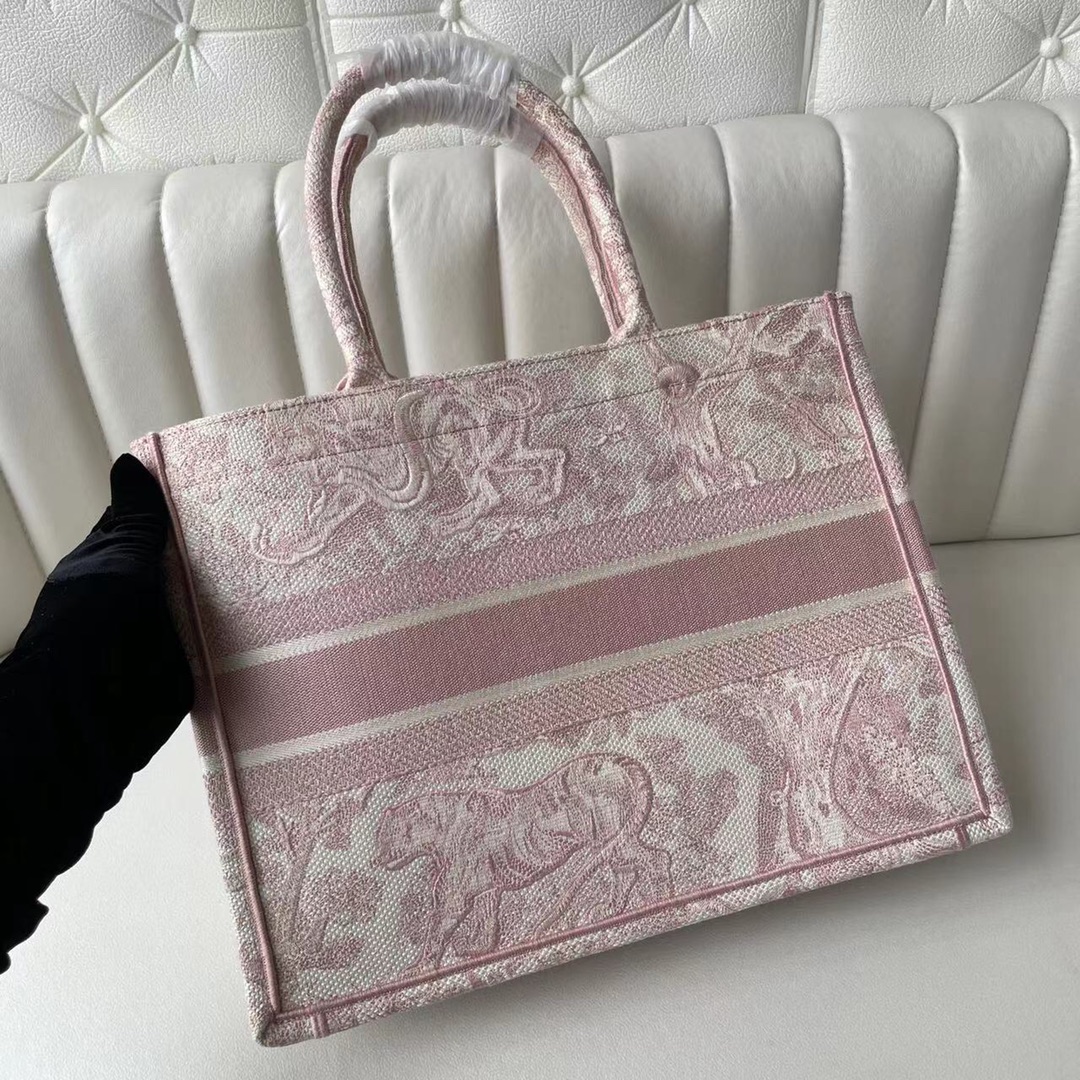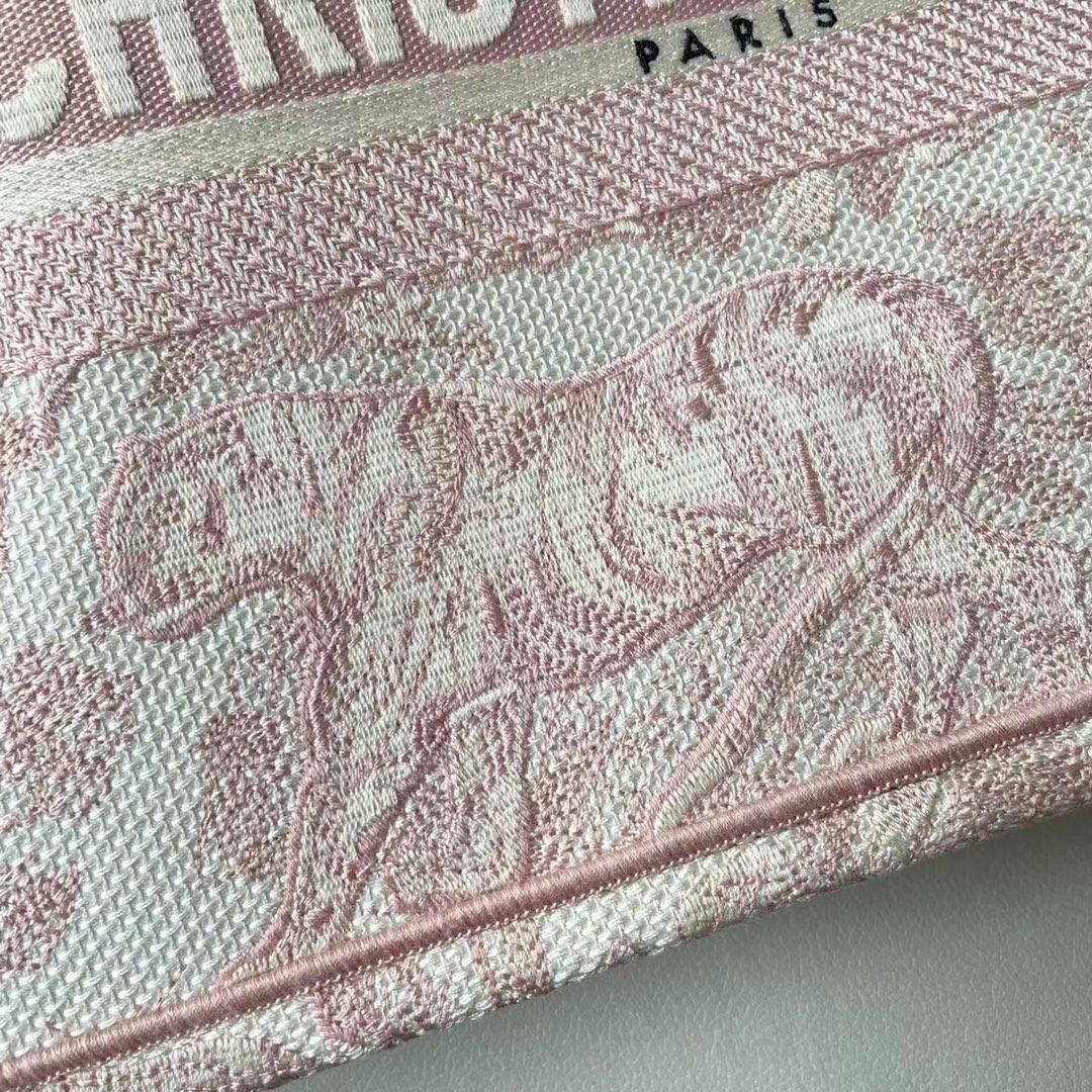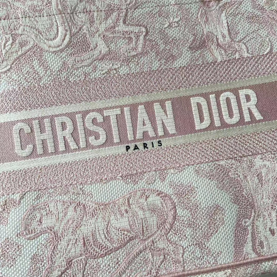 This Book Tote bag is designed by Dior's women's creative director Maria Grazia Chiuri and is a flagship item embodying Dior's aesthetics. The medium style can hold various daily essentials and is adorned with pink embroidered tiger prints. The front features the "CHRISTIAN DIOR" logo. This bag showcases Dior's iconic craftsmanship and can be carried by hand or on the shoulder. Front "CHRISTIAN DIOR" logo. Dimensions: 36.5 x 28 x 17.5 cm. Color: Pink Tiger.