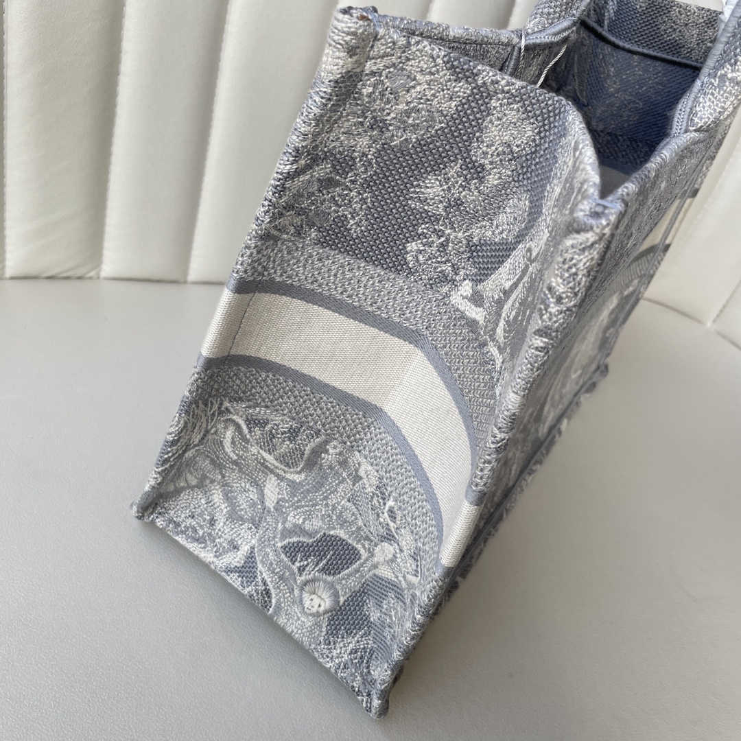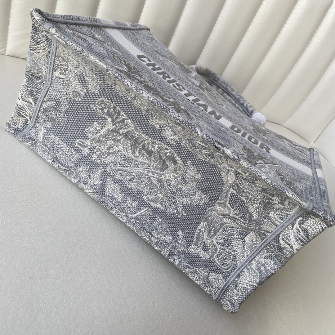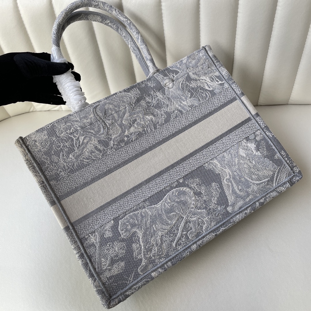 This Book Tote bag is designed by Dior's women's creative director Maria Grazia Chiuri and is a flagship item that embodies Dior's aesthetic. The medium size can hold various daily essentials and is fully adorned with blue embroidered Oblique print. The front features the "CHRISTIAN DIOR" logo. This bag showcases Dior's iconic craftsmanship and can be carried by hand or on the shoulder. Dimensions: 36.5 x 28 x 17.5 cm. Color: Toile de Jouy Gray Tiger