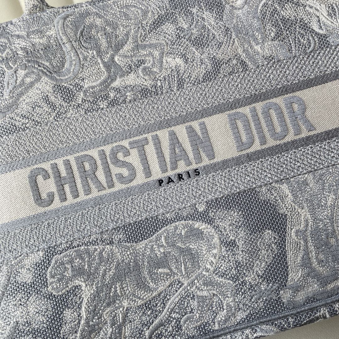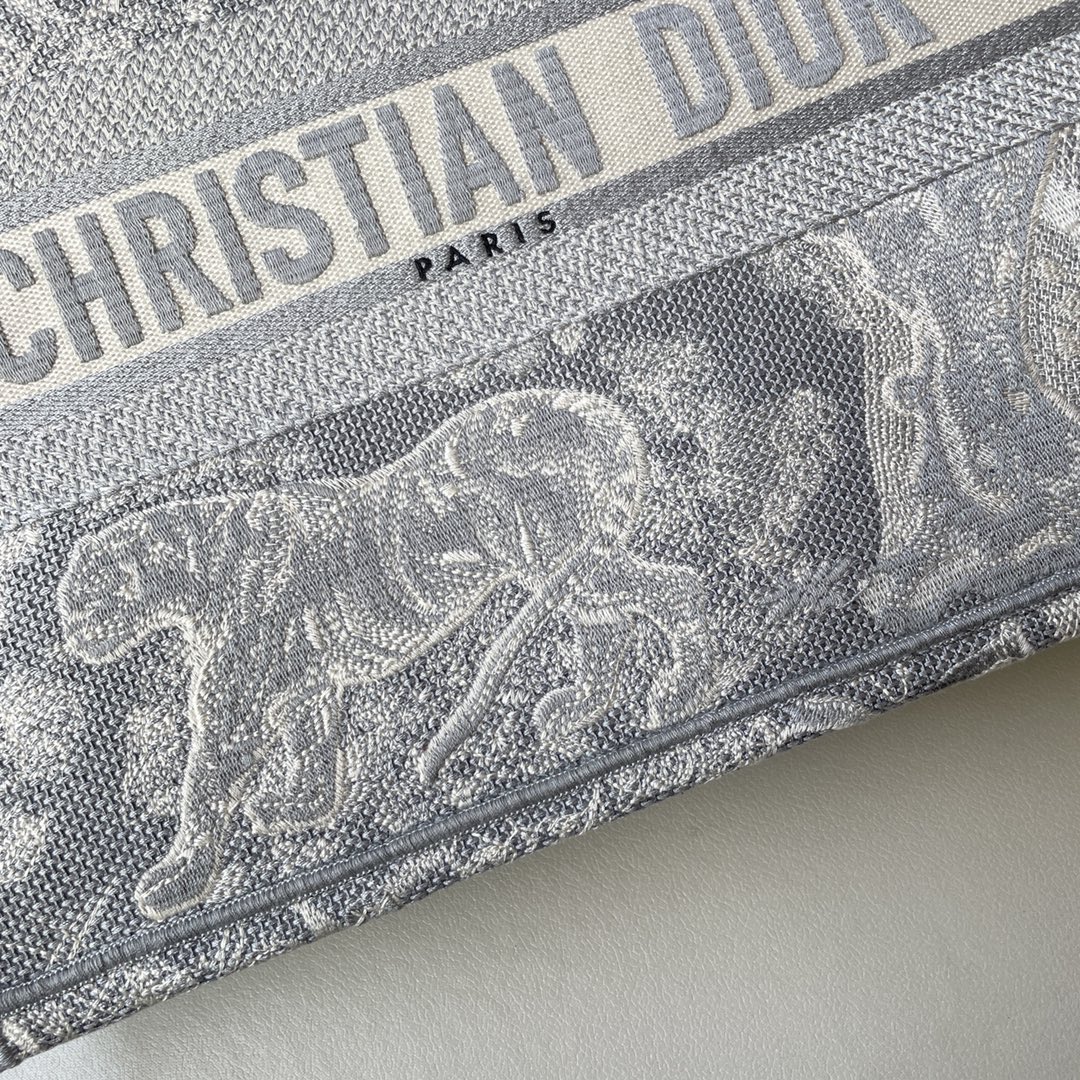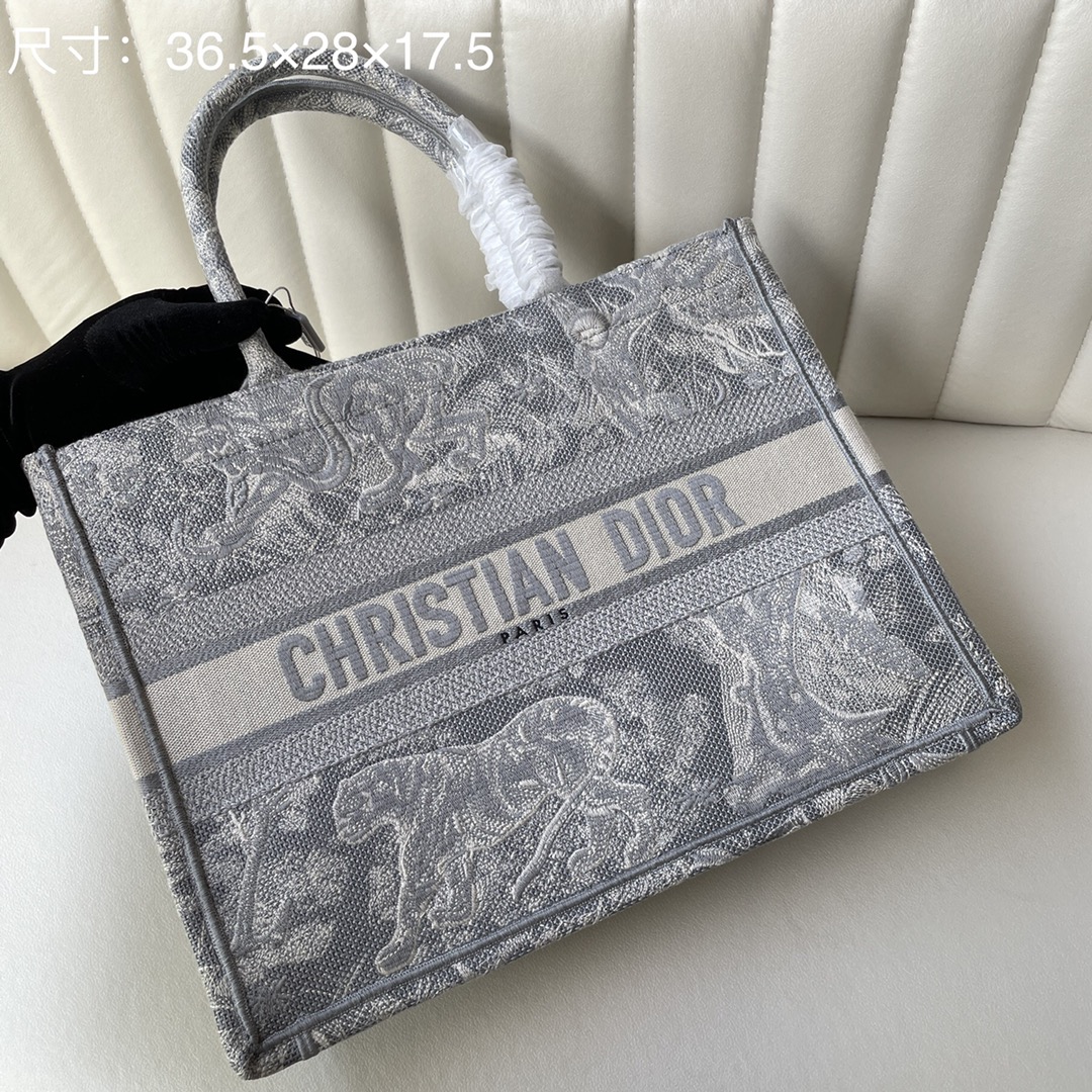 This Book Tote bag is designed by Dior's women's creative director Maria Grazia Chiuri and is a flagship item that embodies Dior's aesthetic. The medium size can hold various daily essentials and is fully adorned with blue embroidered Oblique print. The front features the "CHRISTIAN DIOR" logo. This bag showcases Dior's iconic craftsmanship and can be carried by hand or on the shoulder. Dimensions: 36.5 x 28 x 17.5 cm. Color: Toile de Jouy Gray Tiger