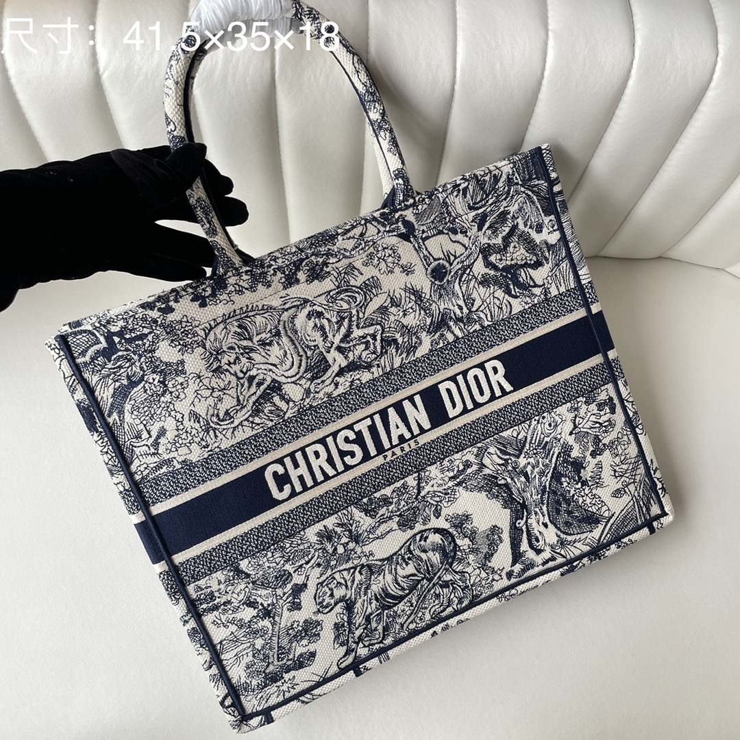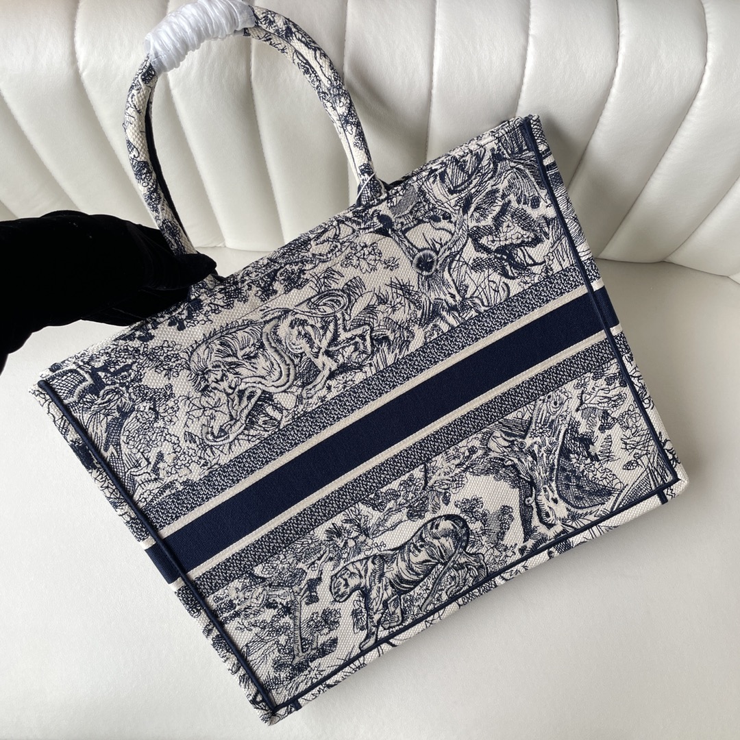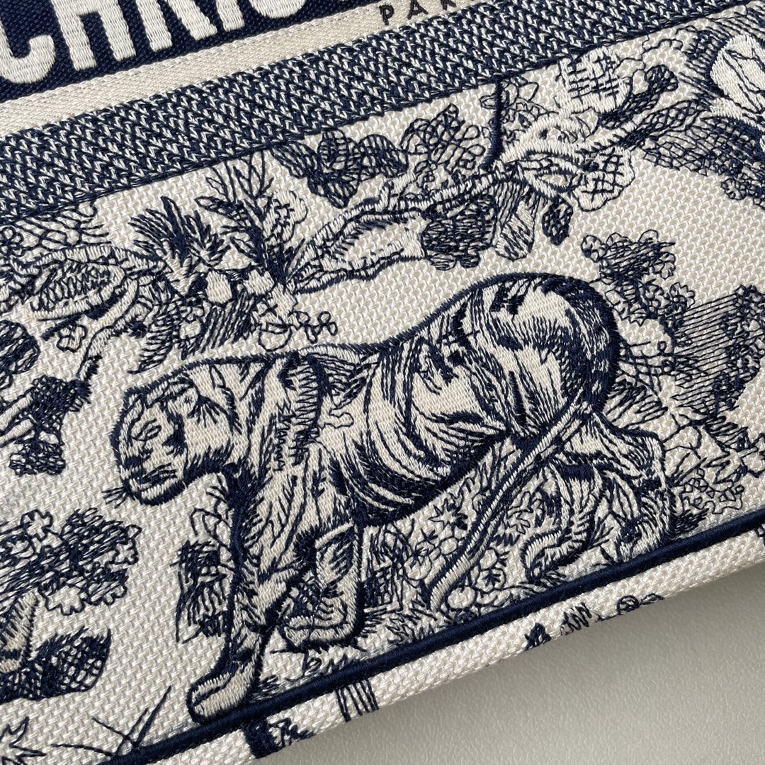 This Book Tote bag is designed by Dior's Women's Creative Director Maria Grazia Chiuri and is a flagship item embodying Dior's aesthetics. The large size can hold various daily essentials and is adorned with blue embroidered tiger prints. The front features the "CHRISTIAN DIOR" logo. This bag reflects Dior's iconic craftsmanship and can be carried by hand or on the shoulder. Front "CHRISTIAN DIOR" logo. Dimensions: 41.5x35x18 cm. Color: Blue Tiger.