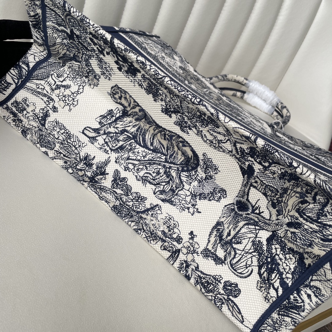 Dior Book Tote, large size with blue embroidered tiger print and "CHRISTIAN DIOR" logo. Crafted for daily use, can be carried by hand or shoulder.