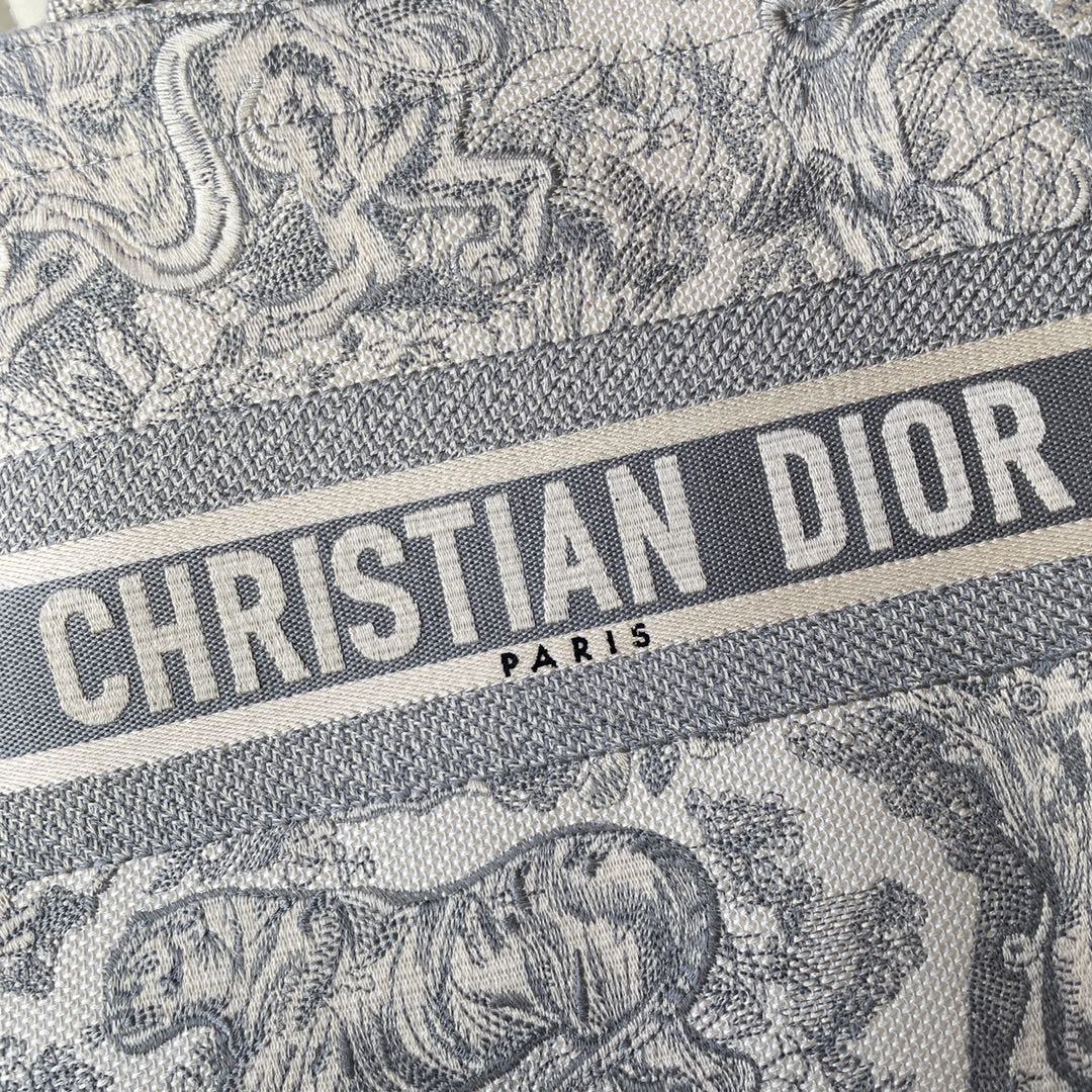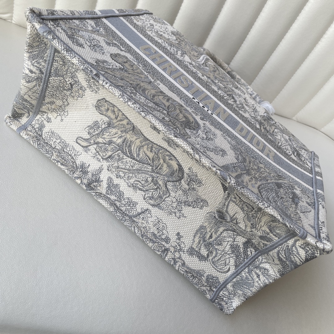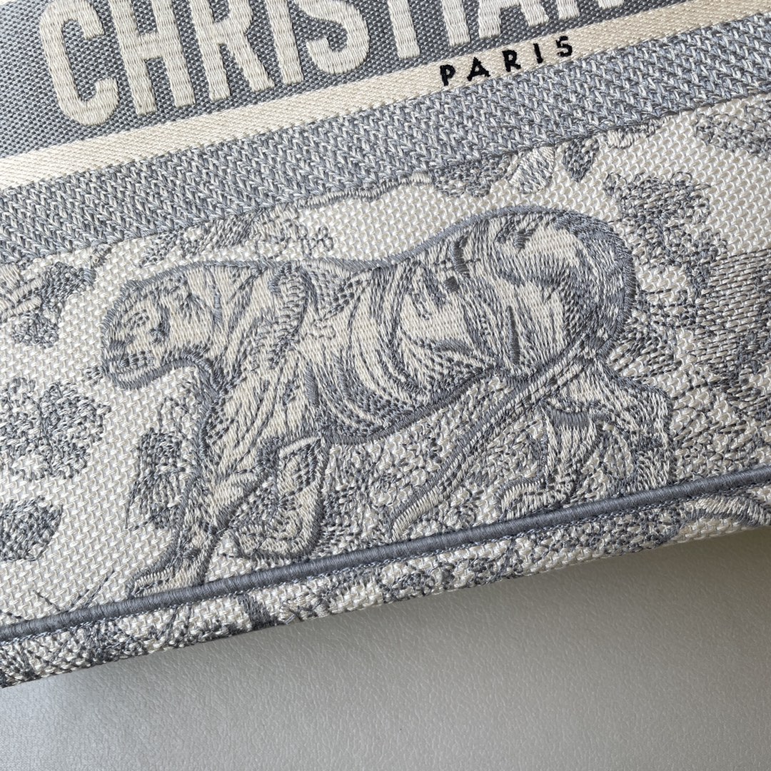 This Book Tote bag is designed by Dior's Women's Creative Director Maria Grazia Chiuri and is a flagship item that embodies Dior's aesthetic. The medium size can hold various daily essentials and is adorned with blue embroidered tiger print. The front features the "CHRISTIAN DIOR" logo. This bag showcases Dior's iconic craftsmanship and can be carried by hand or on the shoulder. The front "CHRISTIAN DIOR" logo. Dimensions: 36.5 x 28 x 17.5 cm. Color: Gray Tiger.