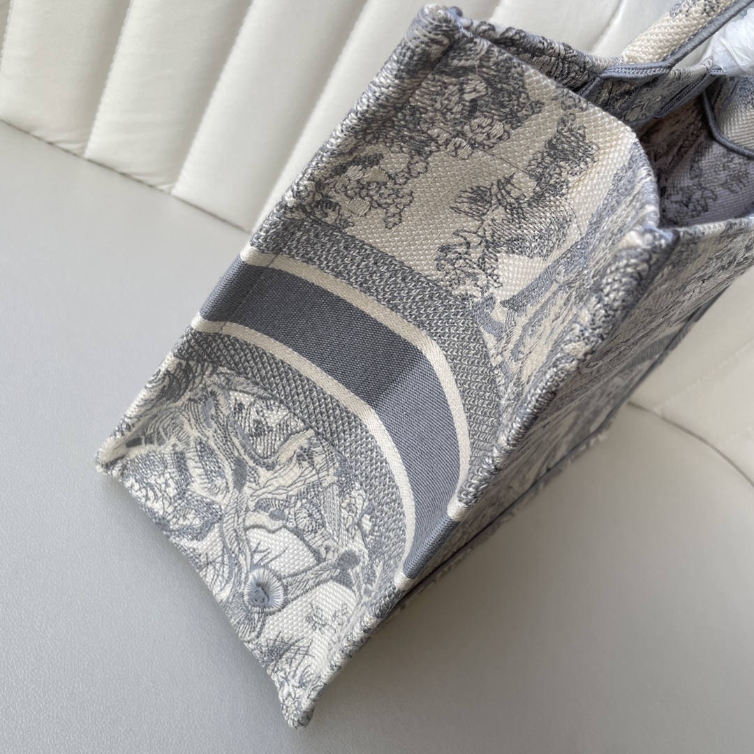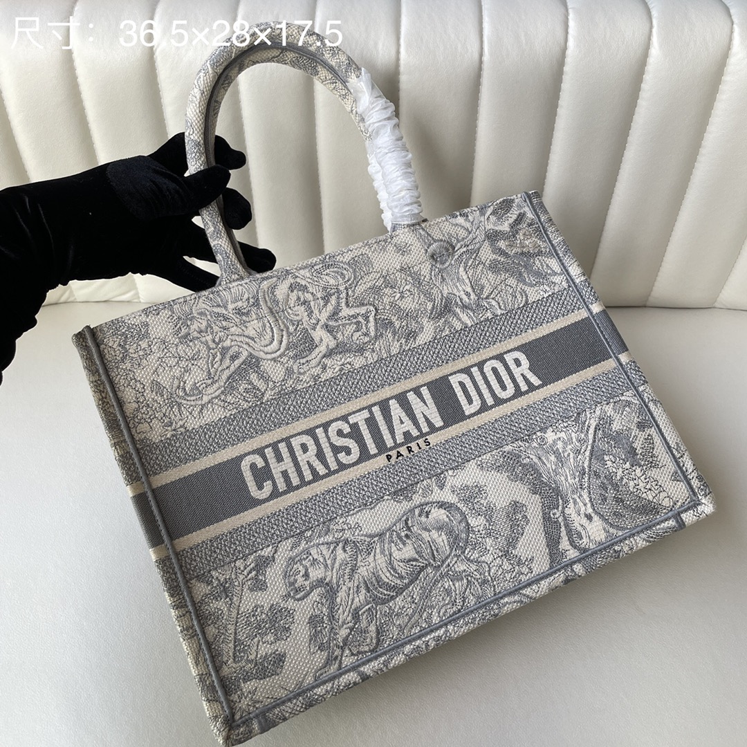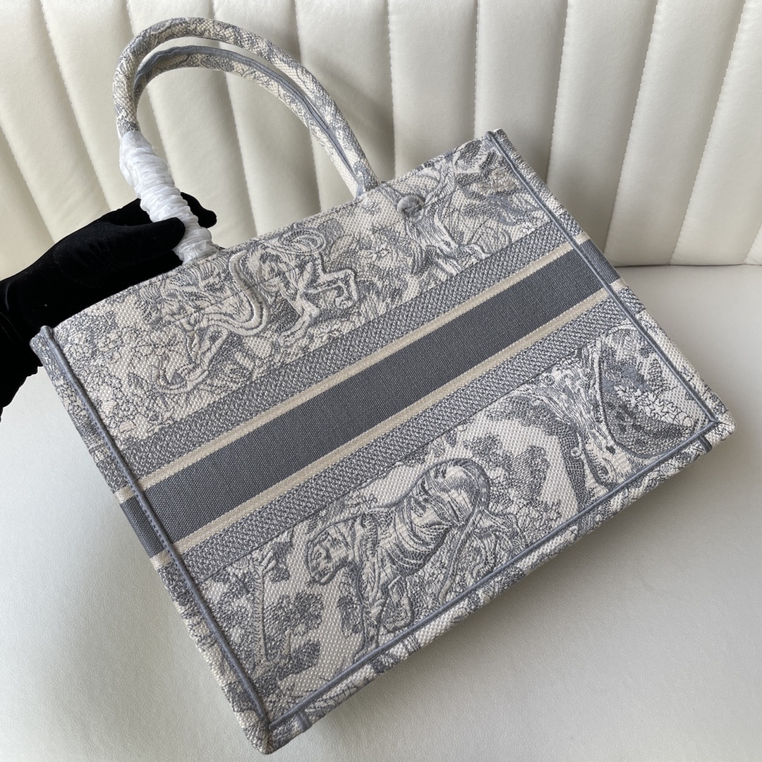 This Book Tote bag is designed by Dior's Women's Creative Director Maria Grazia Chiuri and is a flagship item that embodies Dior's aesthetic. The medium size can hold various daily essentials and is adorned with blue embroidered tiger print. The front features the "CHRISTIAN DIOR" logo. This bag showcases Dior's iconic craftsmanship and can be carried by hand or on the shoulder. The front "CHRISTIAN DIOR" logo. Dimensions: 36.5 x 28 x 17.5 cm. Color: Gray Tiger.