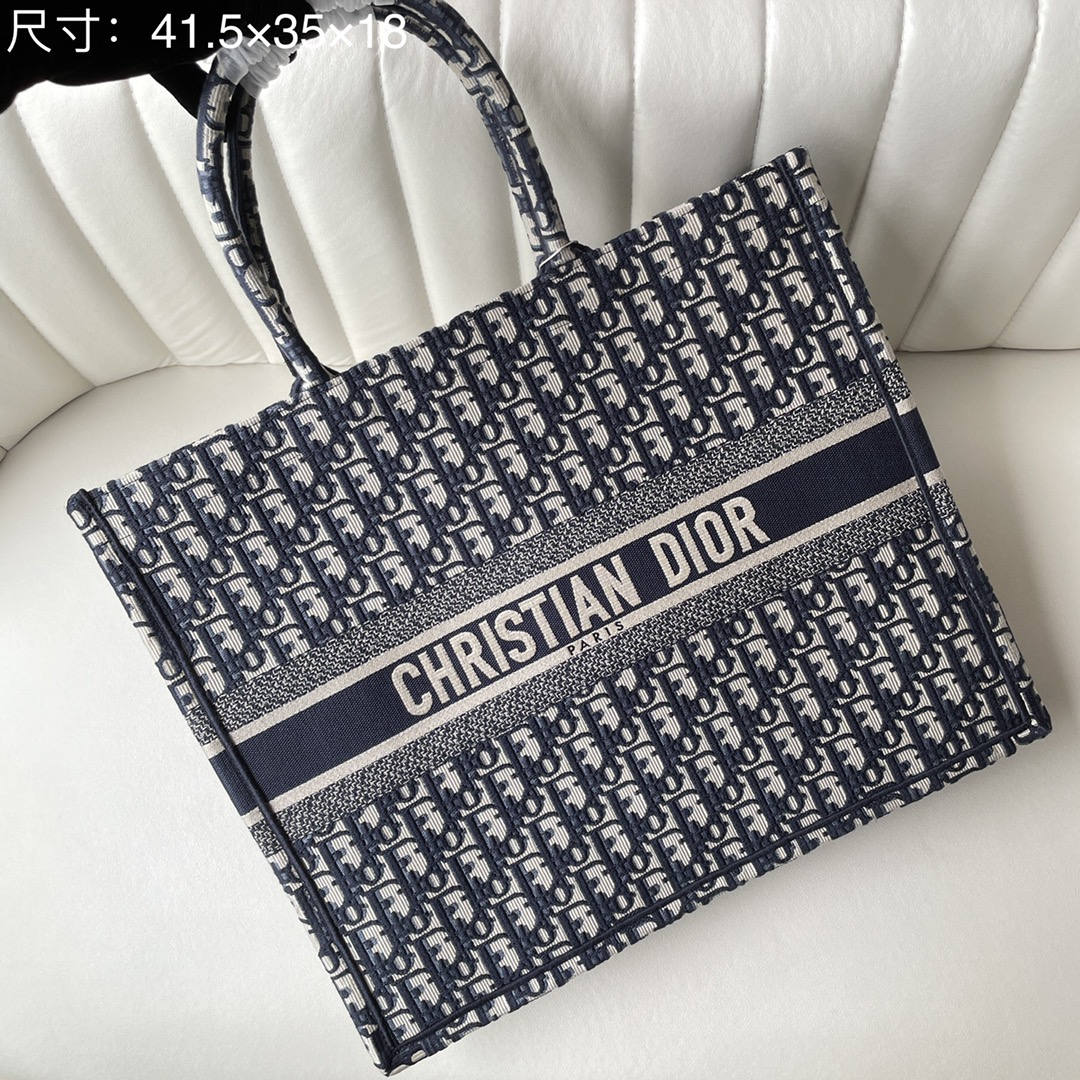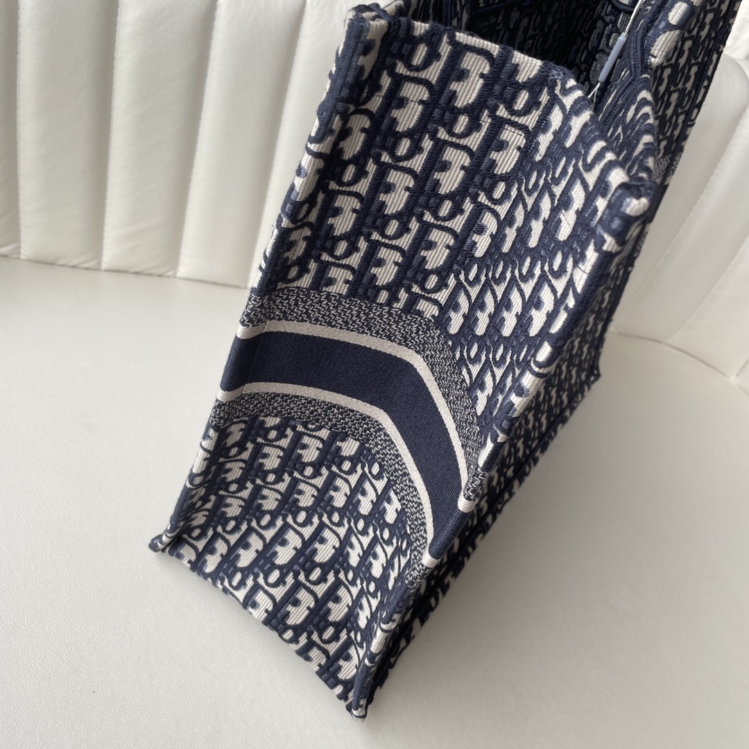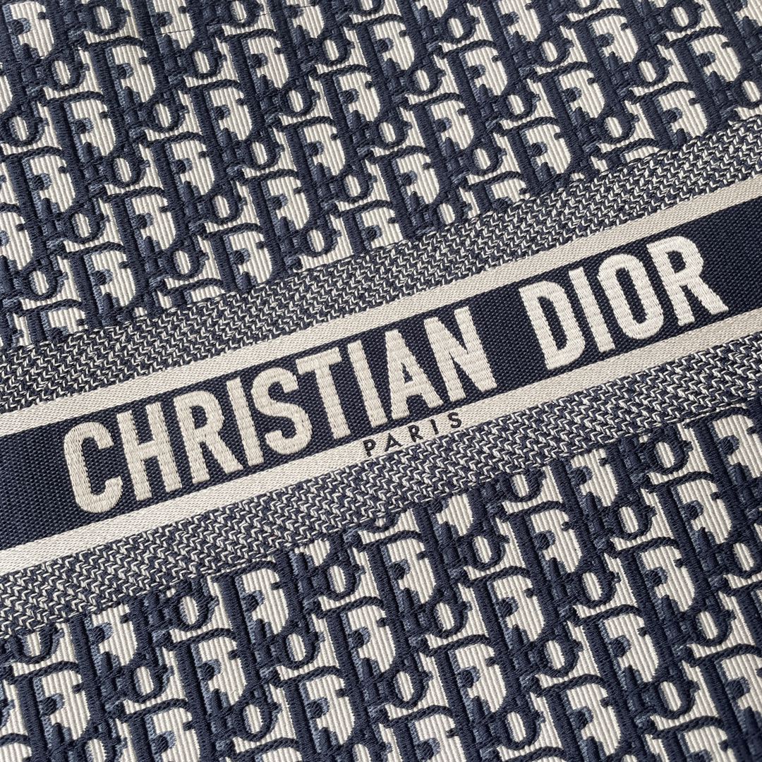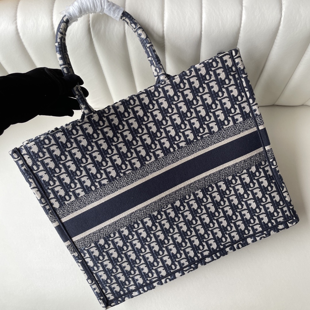 Dior Book Tote, large size, blue embroidered Oblique print. Designed by Maria Grazia Chiuri. Holds daily essentials, hand or shoulder carry. 41.5x35x18cm.