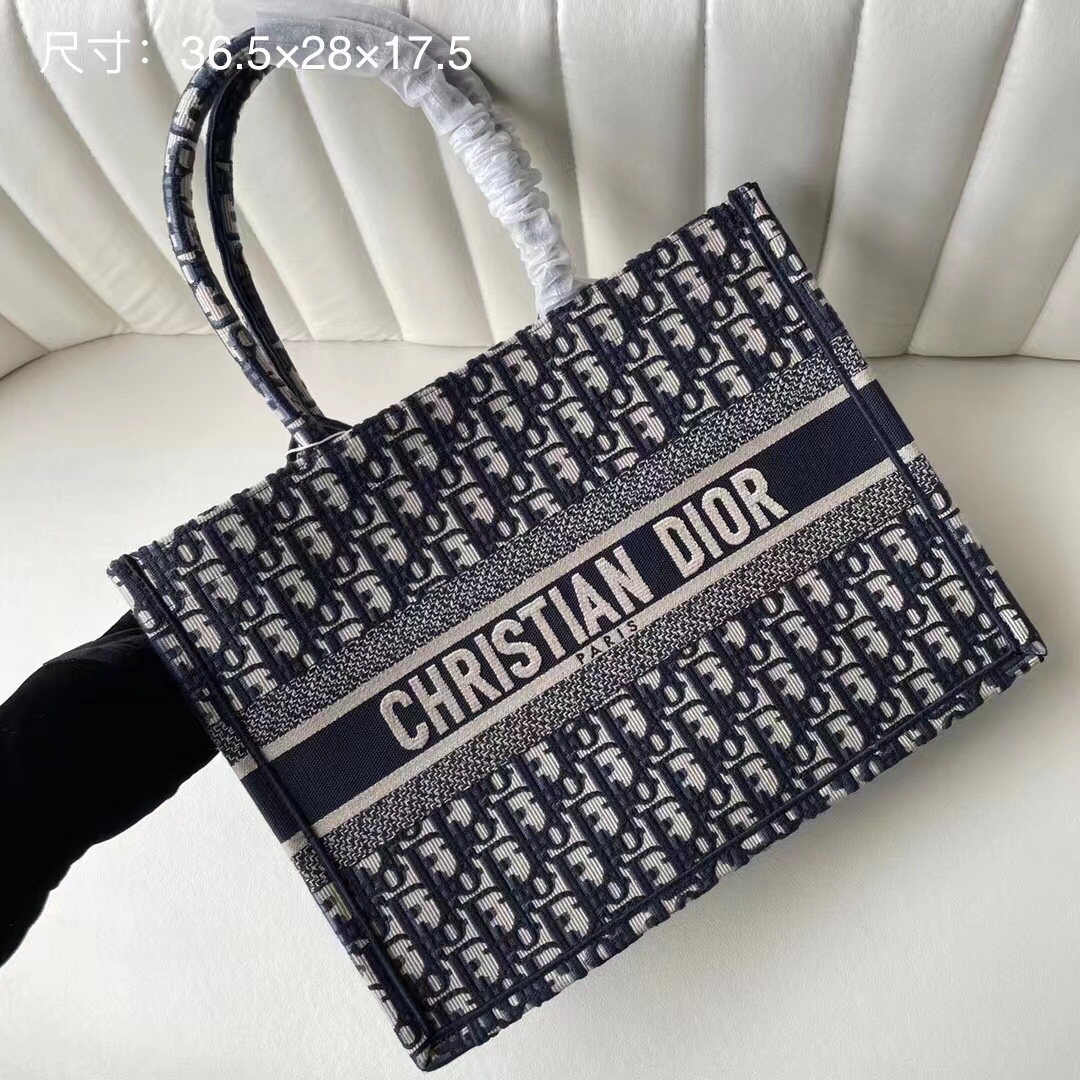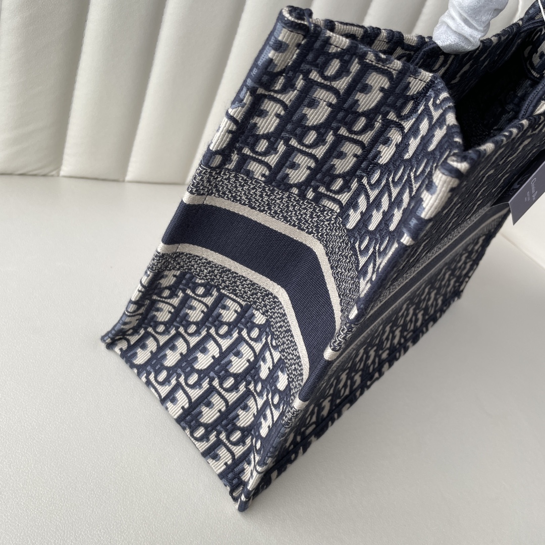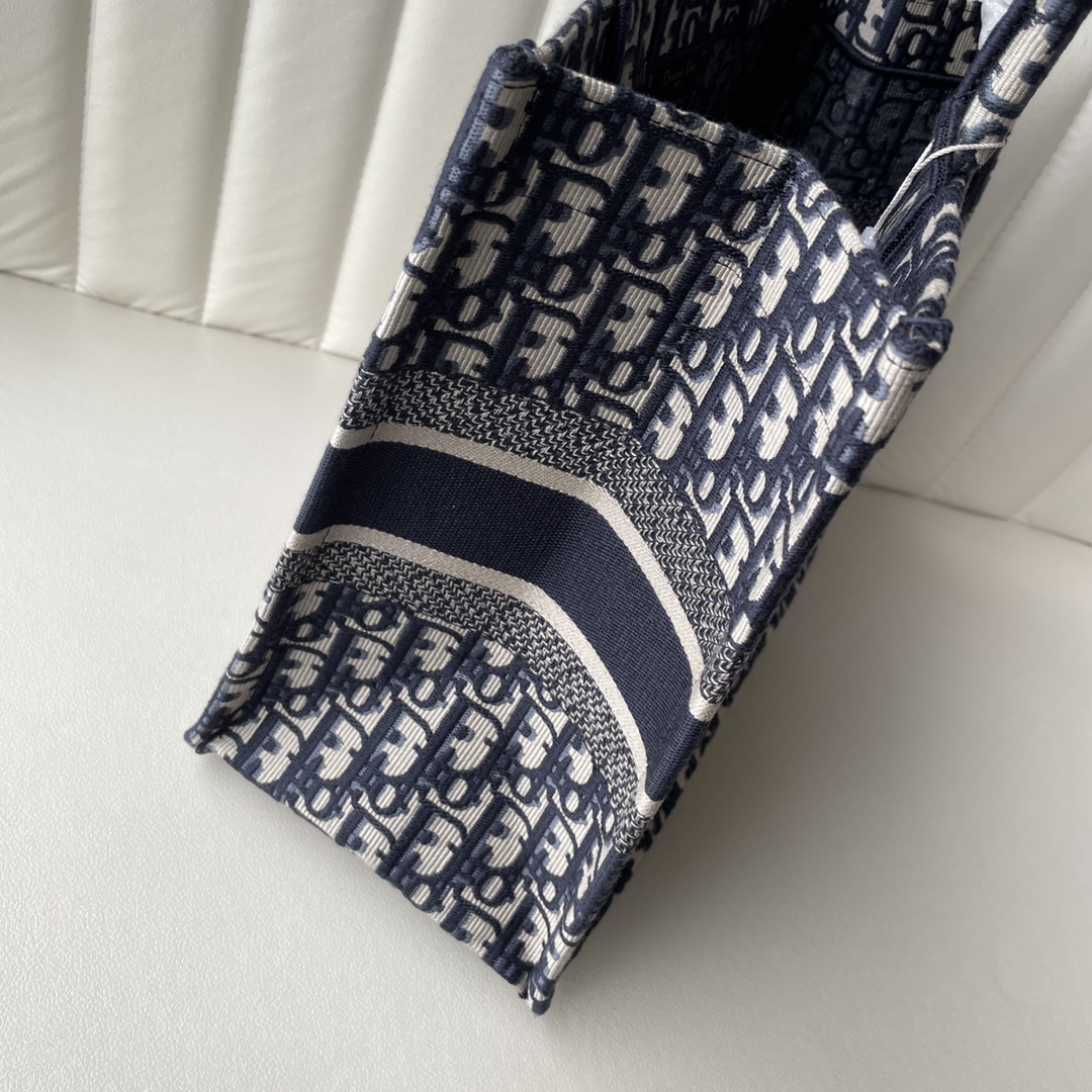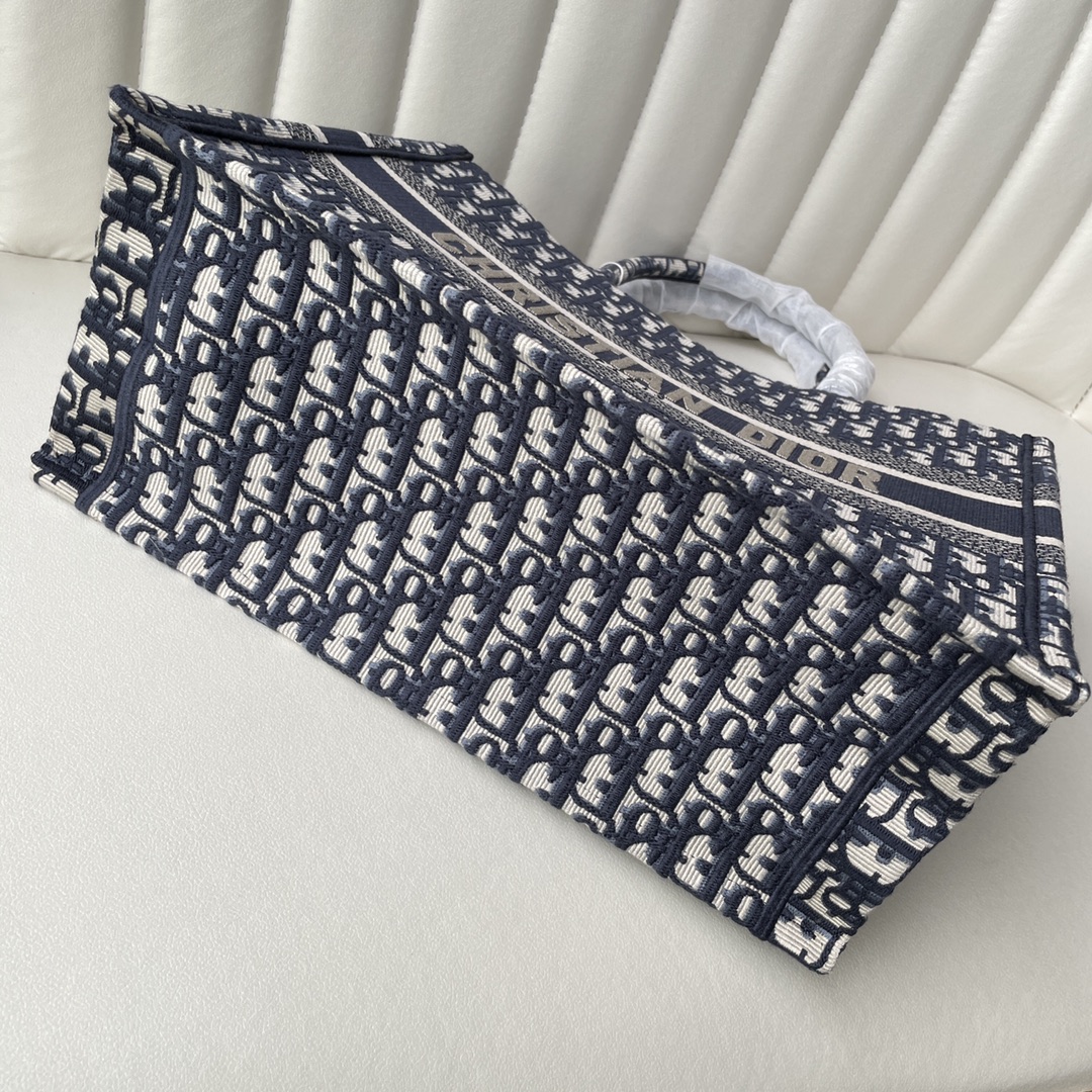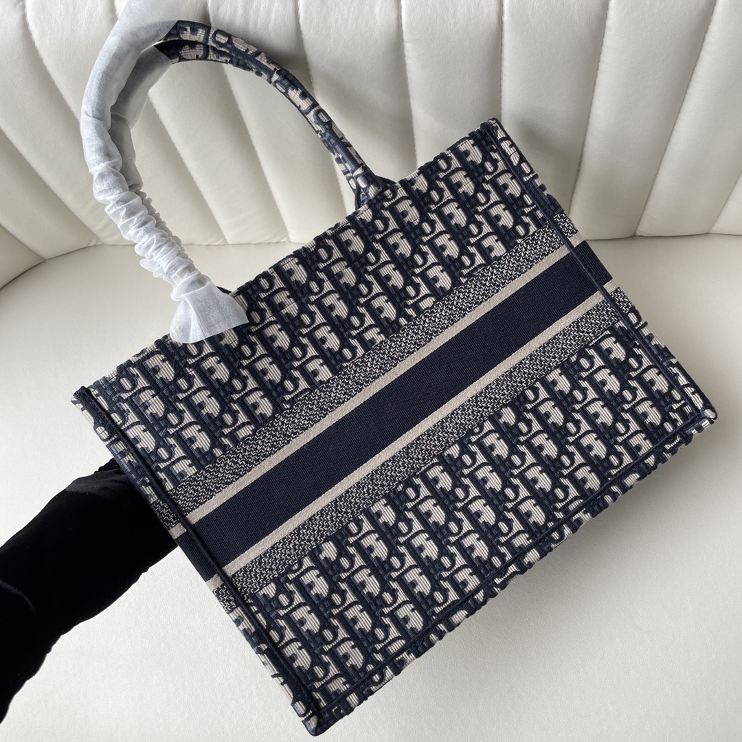 Home • Luggage • Medium Dior Book Tote. Designed by Maria Grazia Chiuri. Blue embroidered Oblique pattern, "CHRISTIAN DIOR" logo. Spacious, for daily essentials. Hand or shoulder carry. 36.5x28x17.5cm.