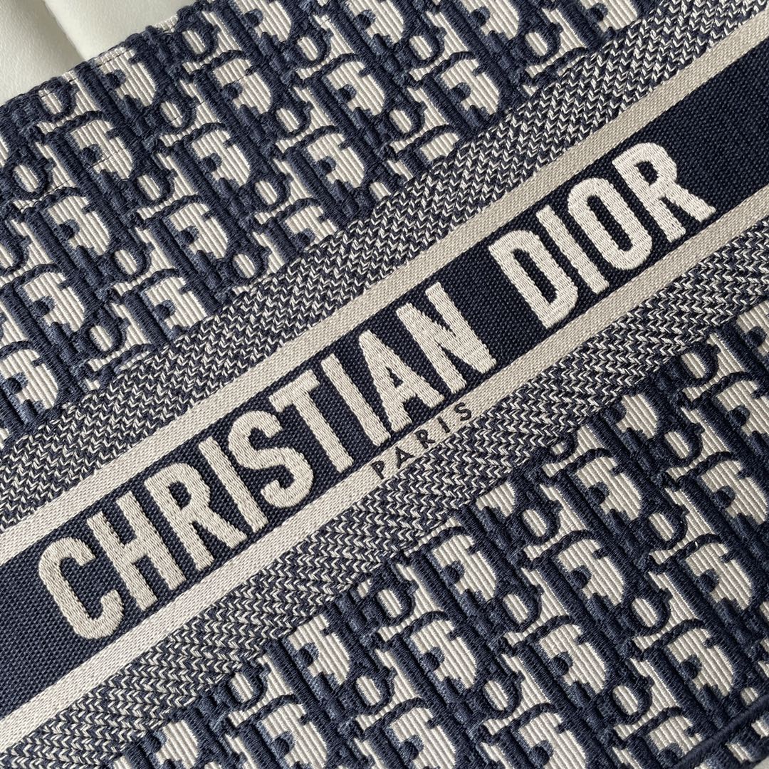 Medium Dior Book Tote. Designed by Maria Grazia Chiuri. Blue embroidered Oblique pattern, "CHRISTIAN DIOR" logo. Spacious, for daily essentials. Hand or shoulder carry. 36.5x28x17.5cm.