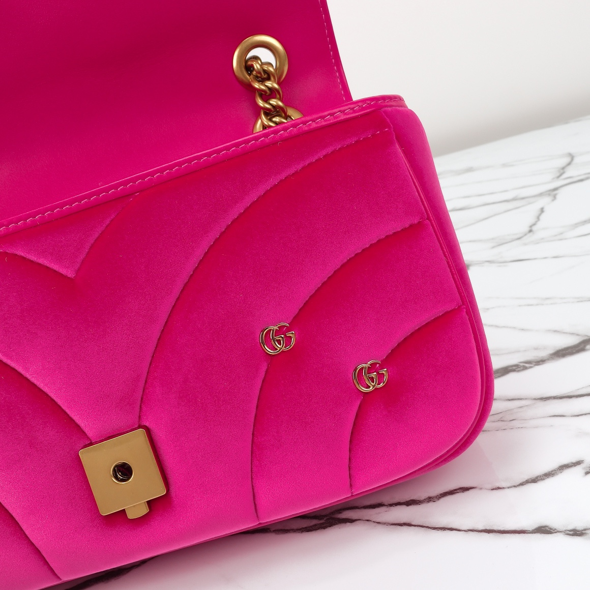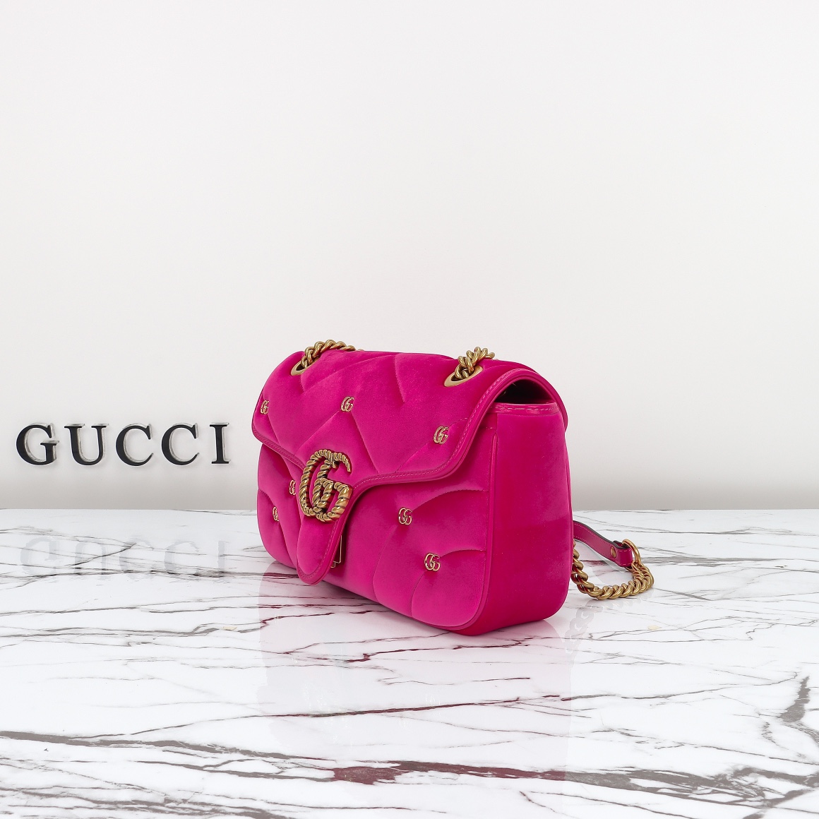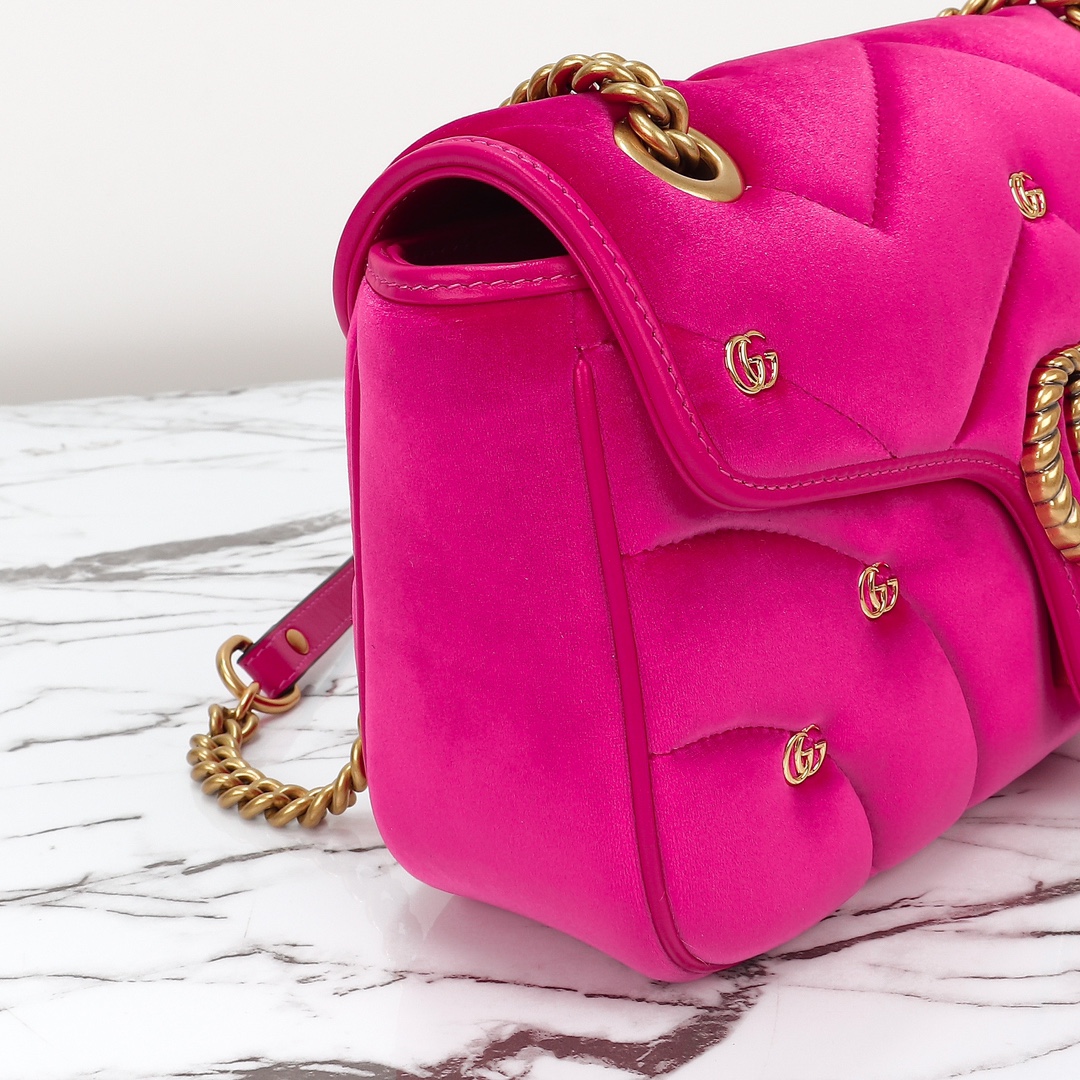 Counter quality, original factory leather, style number 443497 deep pink suede small double G. Dimensions: width 26x height 15x side width 7. Ready stock available!
