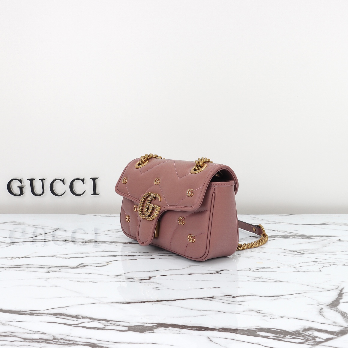 Counter quality, original factory leather, style number 446744 nude pink small double G. Dimensions: width 22 x height 13 x side width 6. Ready stock available for shipment!