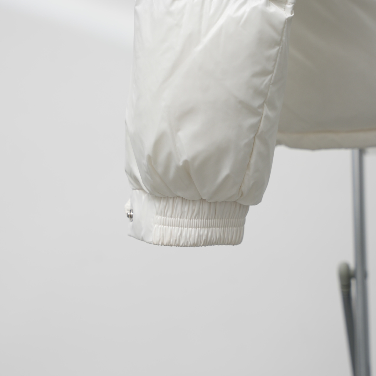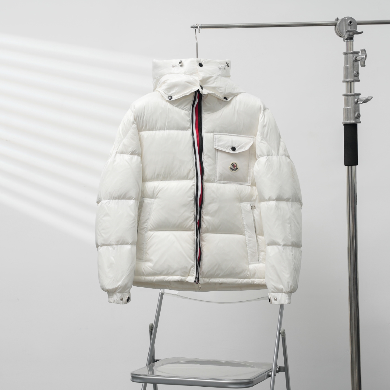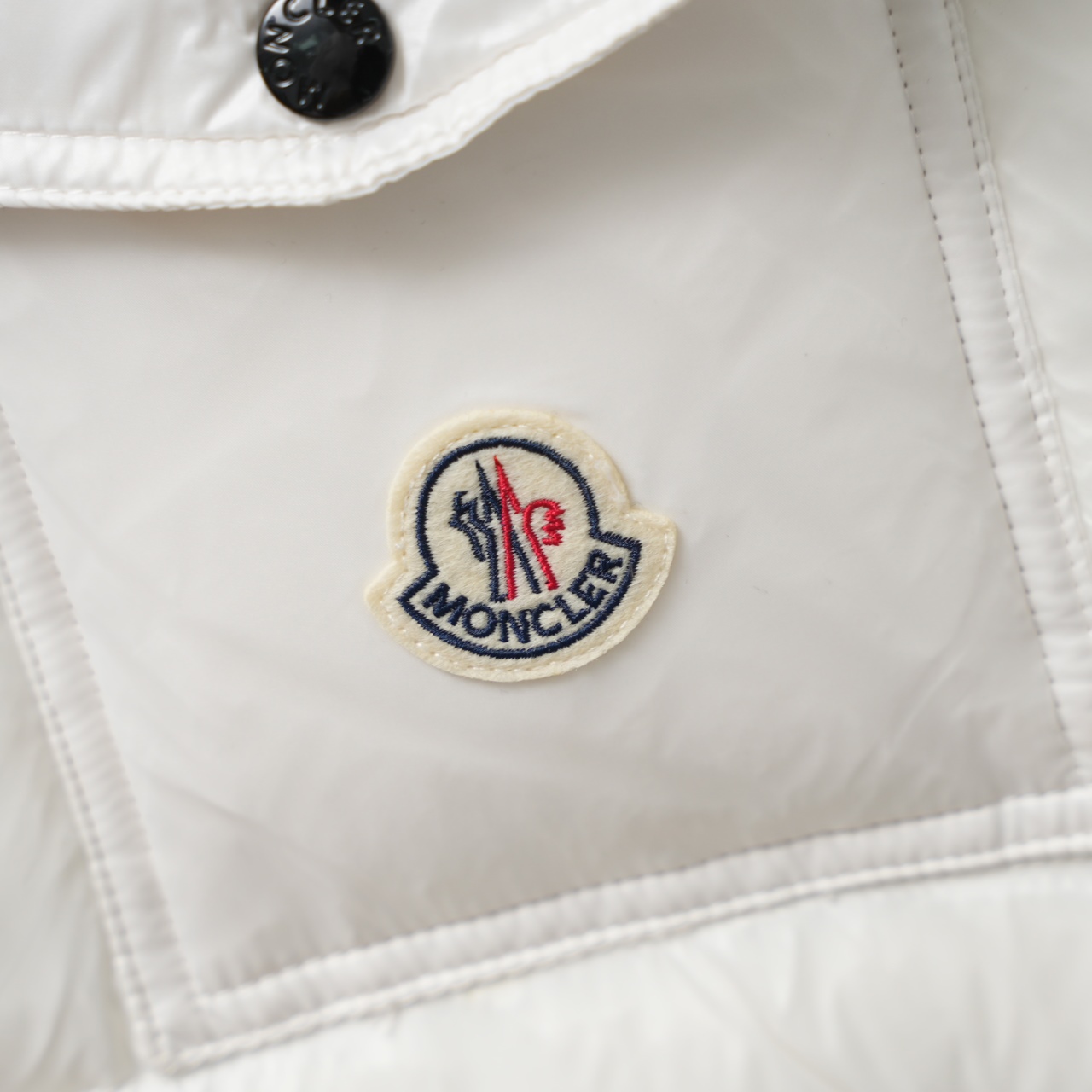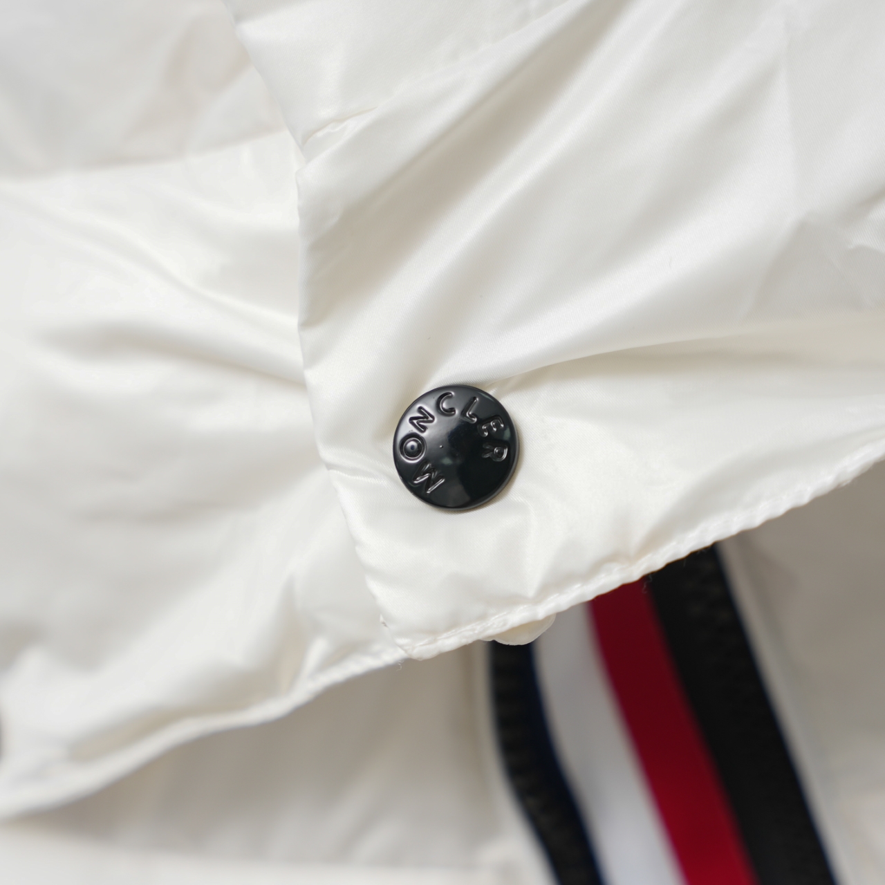 MONCLER three-color ribbon hooded down jacket in white, sizes 1-5.