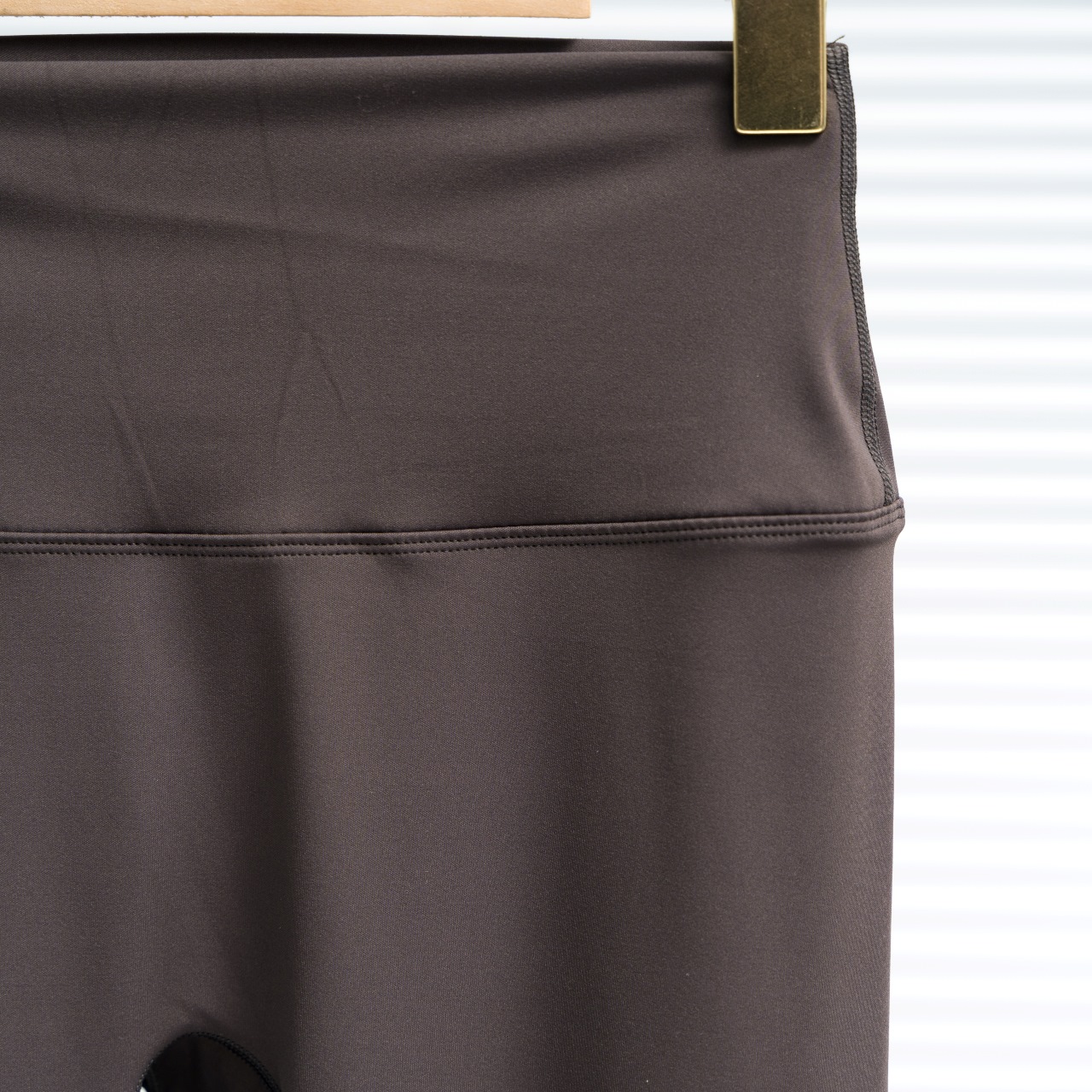 Lululemon crop pants with silver/gold waist and leg logos. Color: Graphite Gray. Sizes: 2-12.