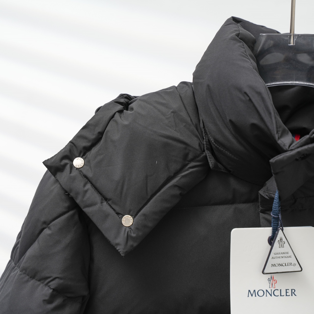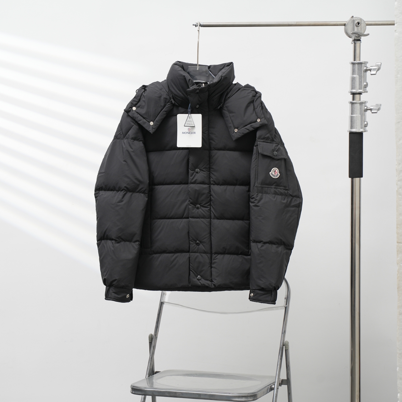 Factory direct Moncler short hooded down jacket in black. Sizes: C Factory 1-6, S Factory 0-4.