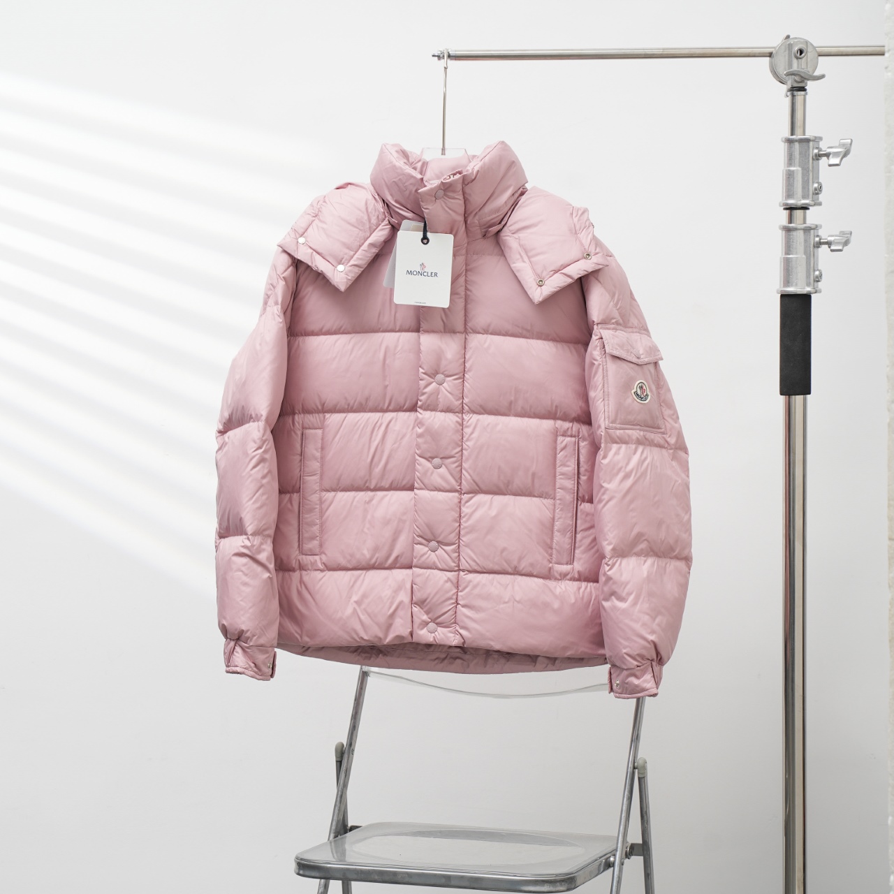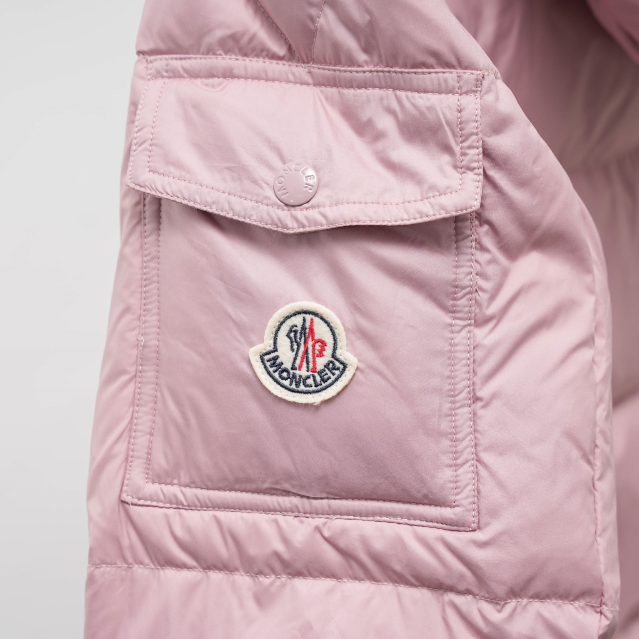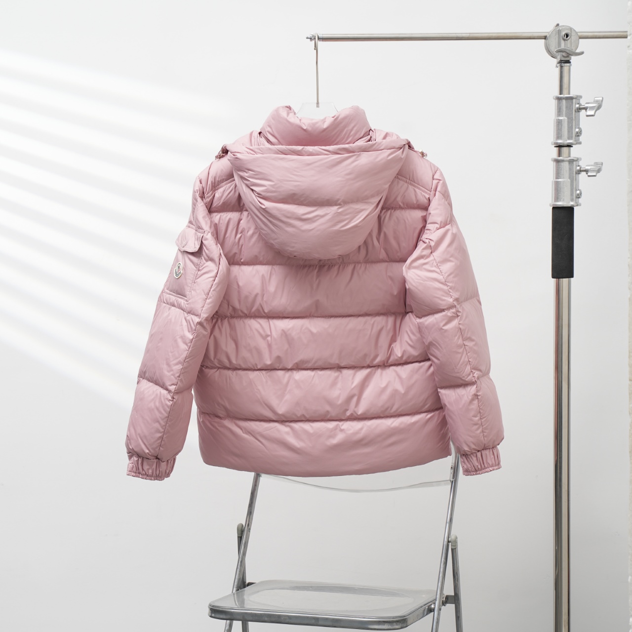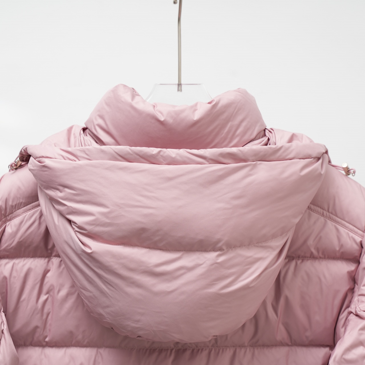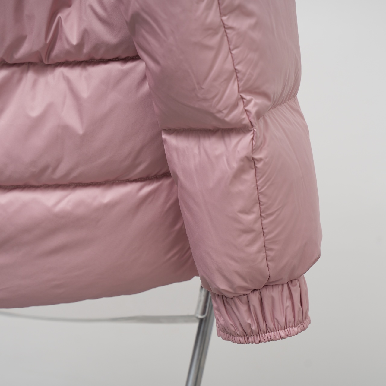 Factory direct Moncler short hooded down jacket with frosted sleeve patch. Color: pink. Sizes: C factory 1-6, S factory 0-4.