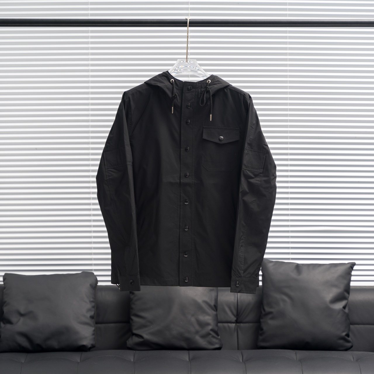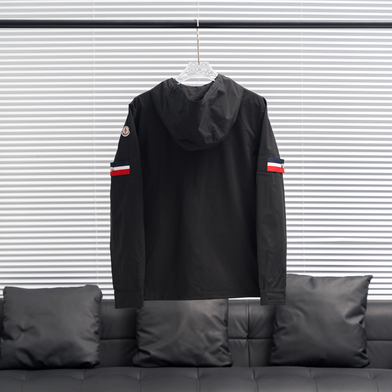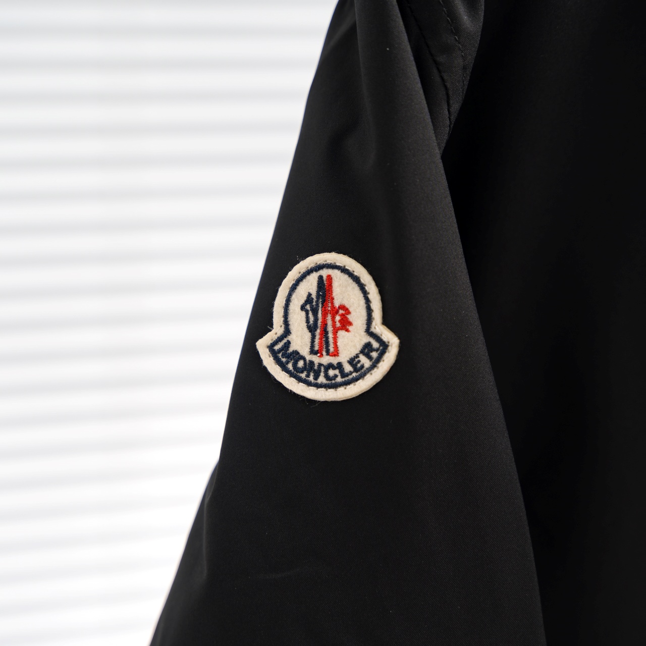 MONCLER hooded windbreaker with sleeve badge. Colors as shown. Sizes M-3XL.