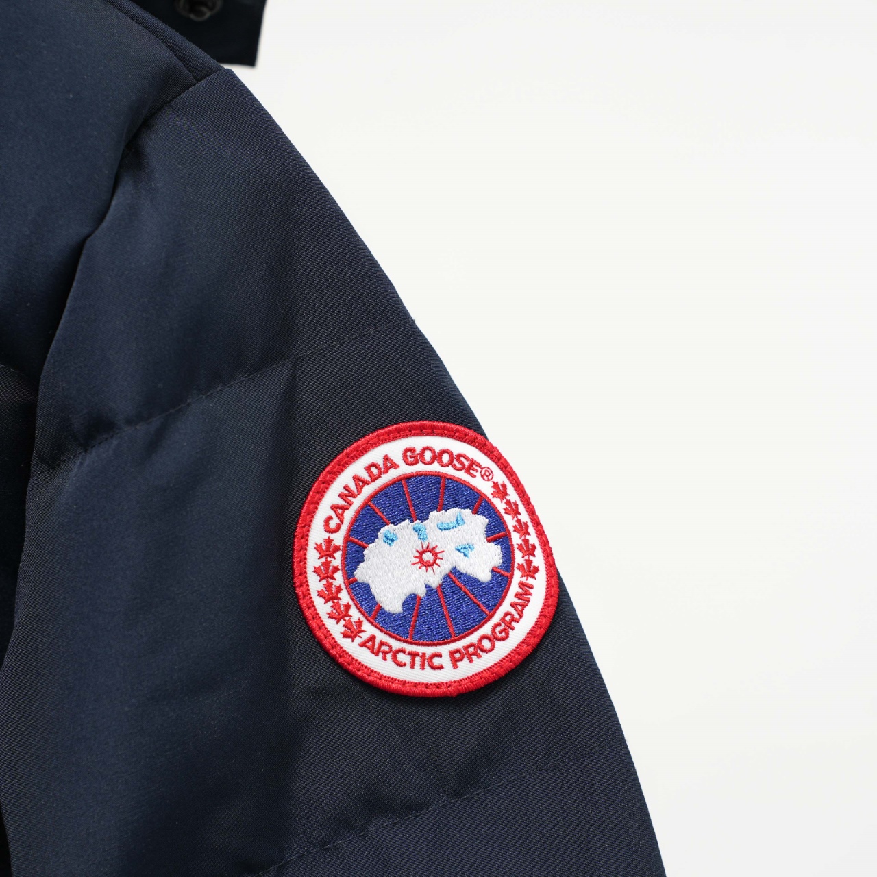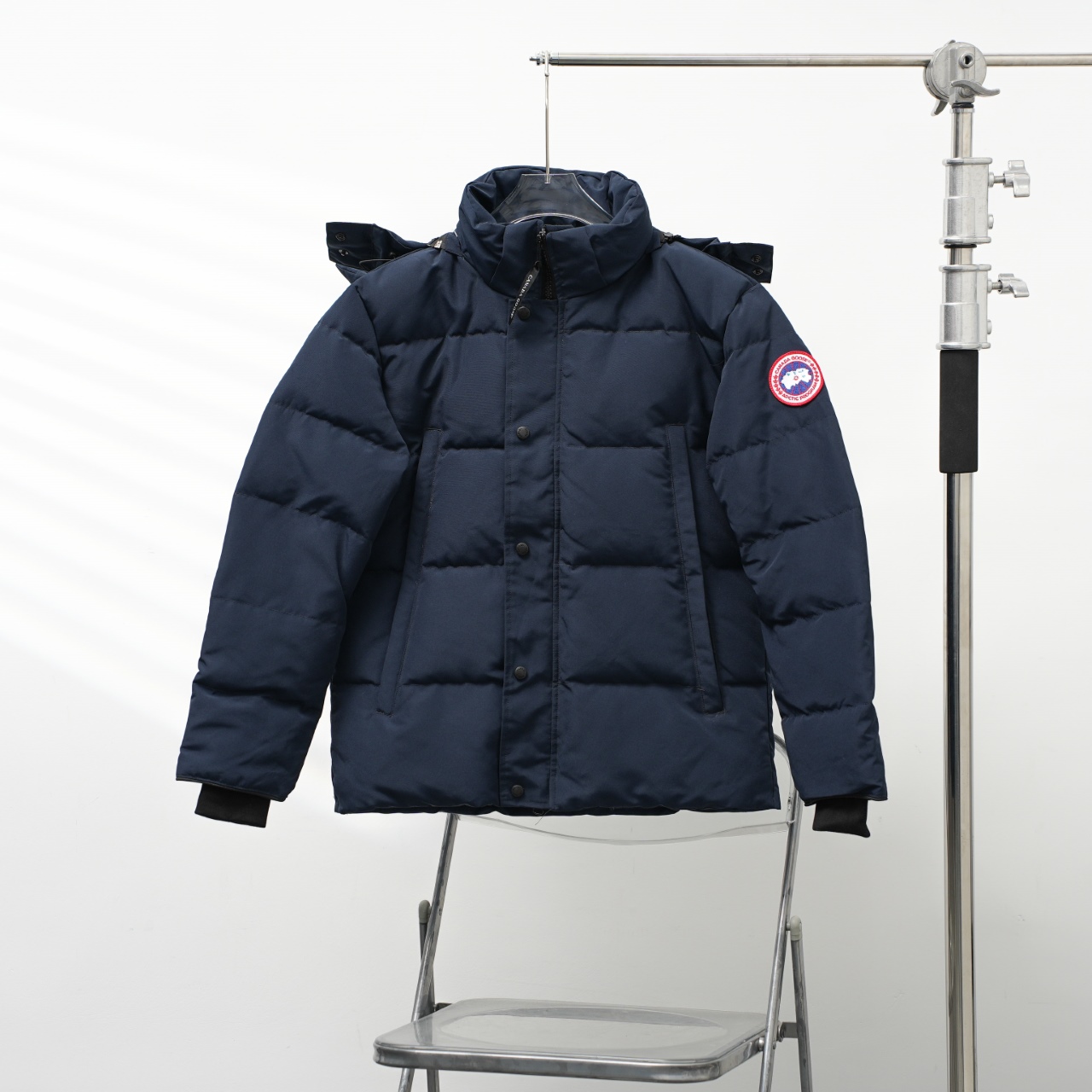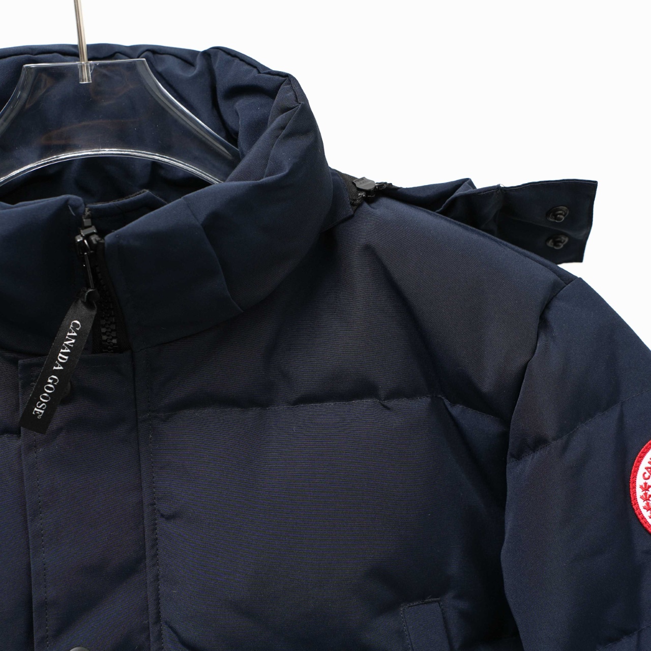 Canada Goose 29 new hooded down jacket without fur collar. Colors: Dark blue with red logo. Sizes: XS to XXL.