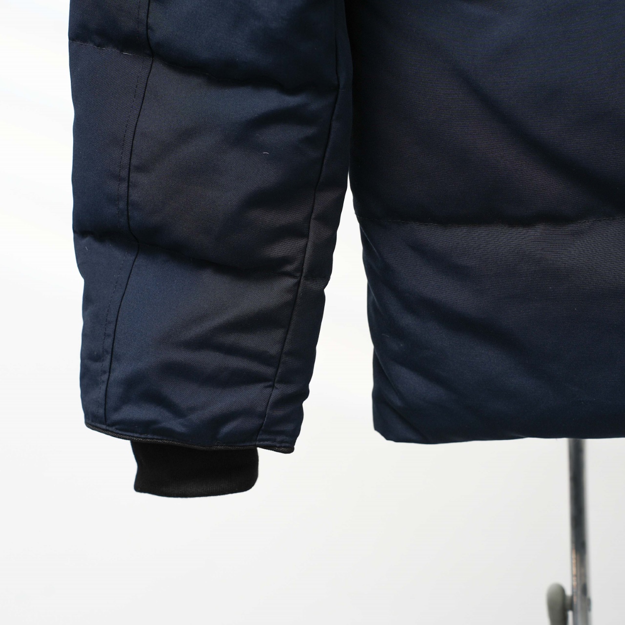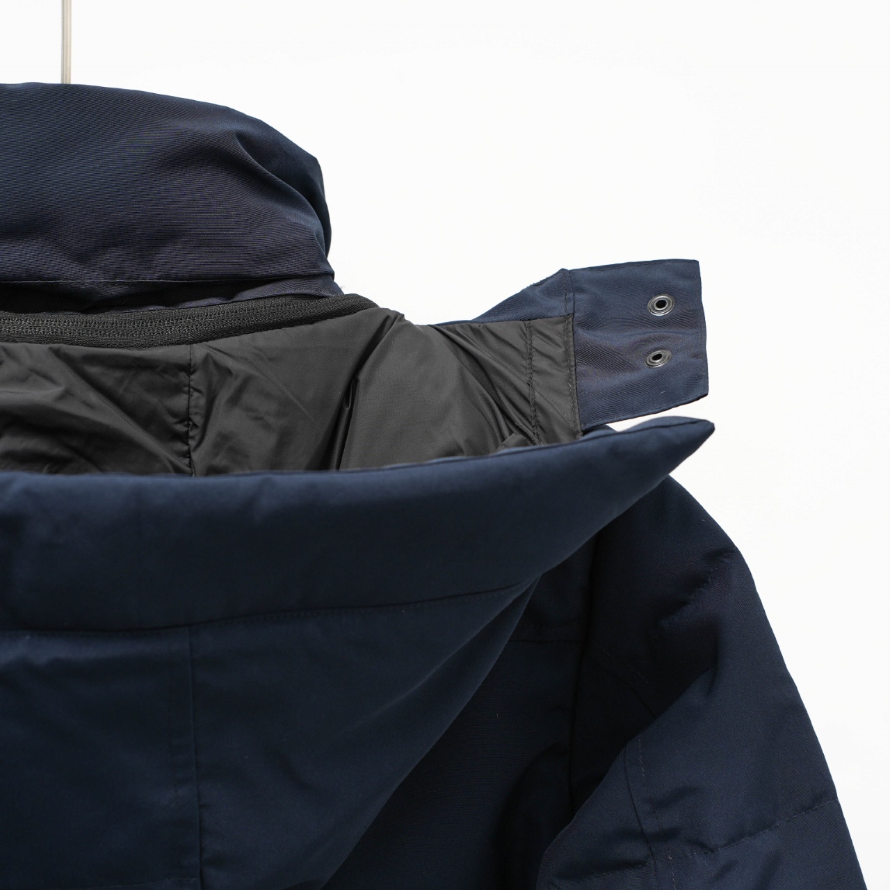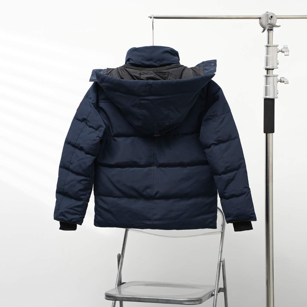 Canada Goose 29 new hooded down jacket without fur collar. Colors: Dark blue with red logo. Sizes: XS to XXL.