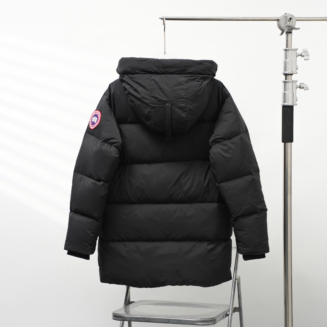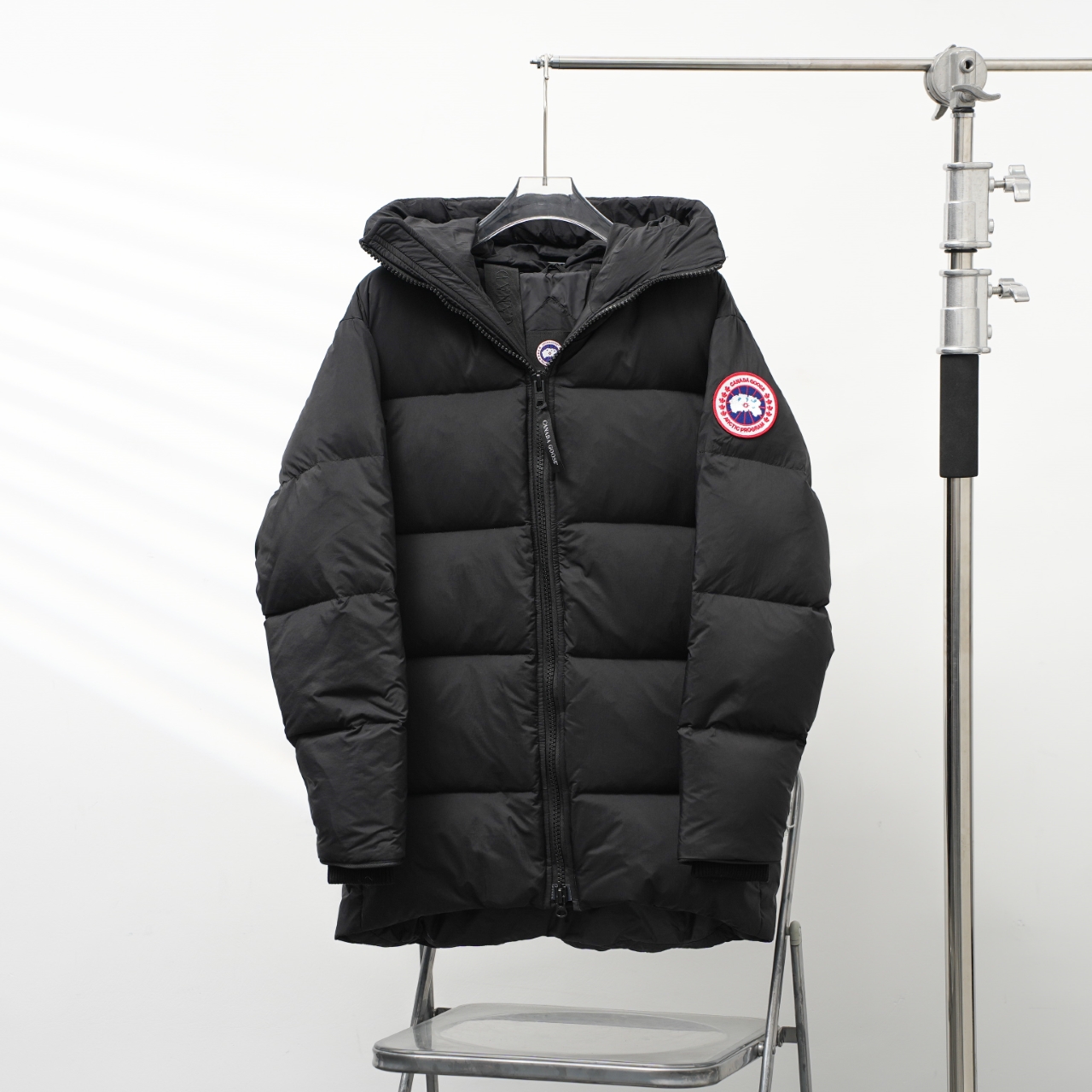 Canada Goose 2801 Hooded Mid-Length Down Jacket in Black, Sizes XS-XXL.