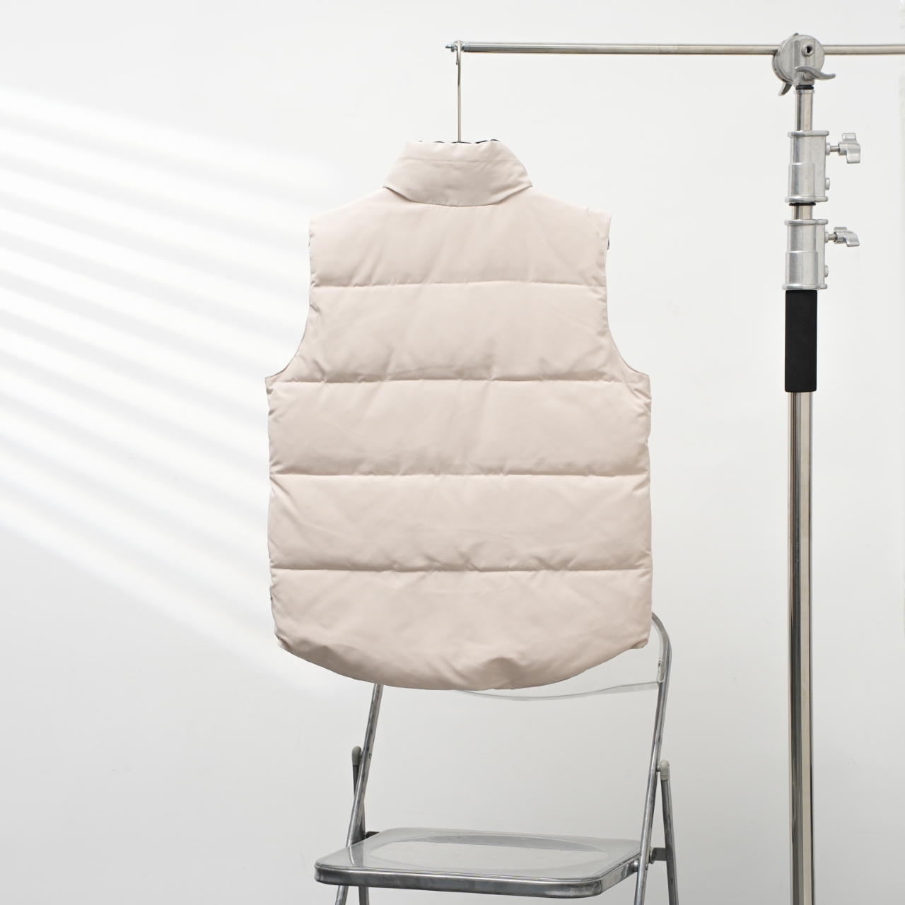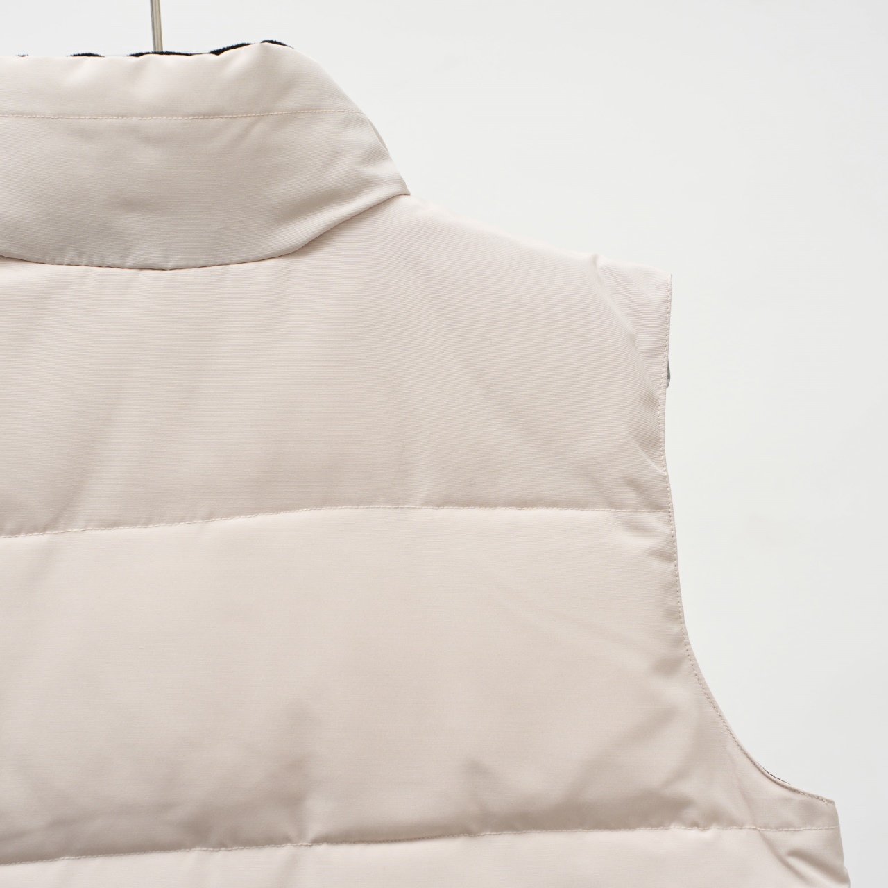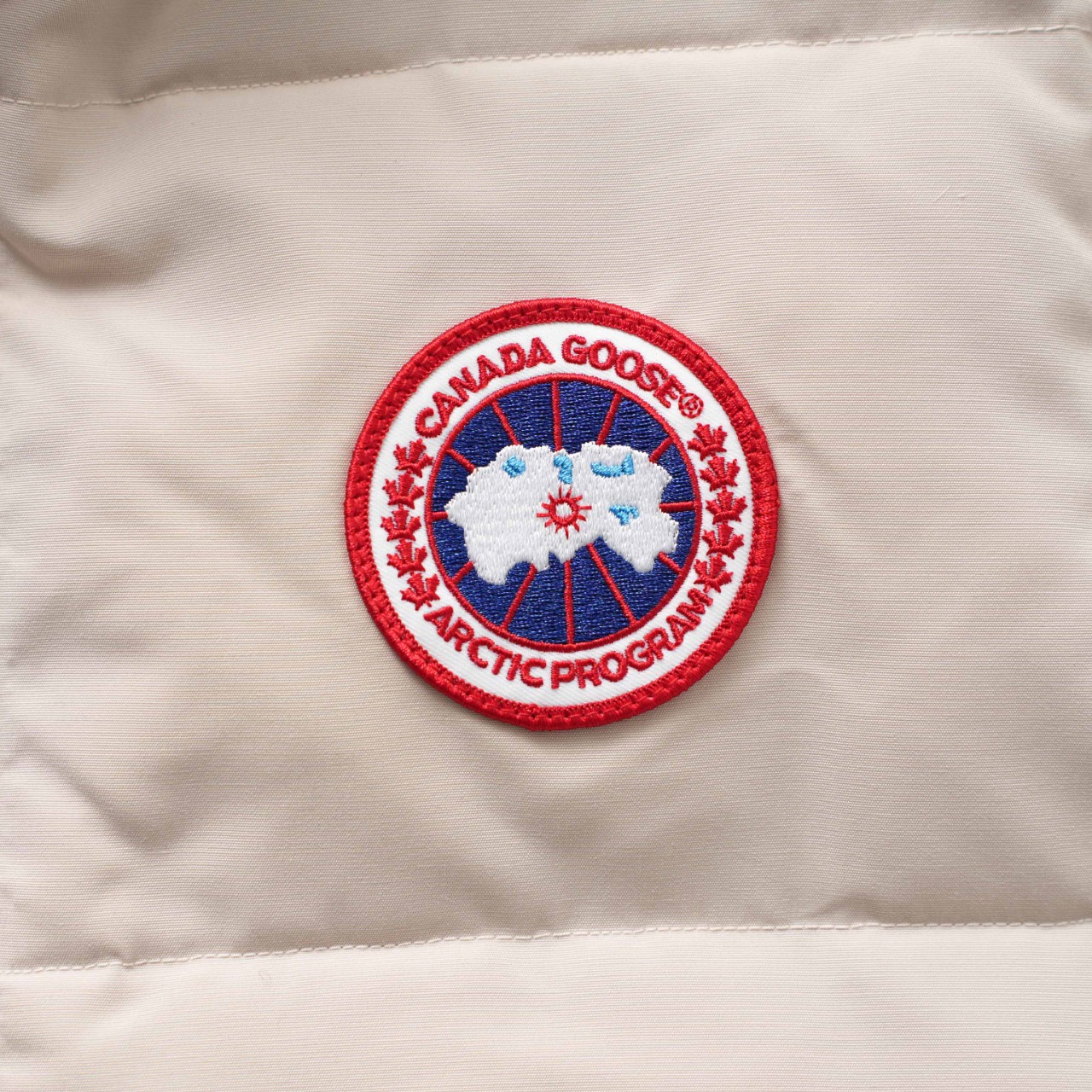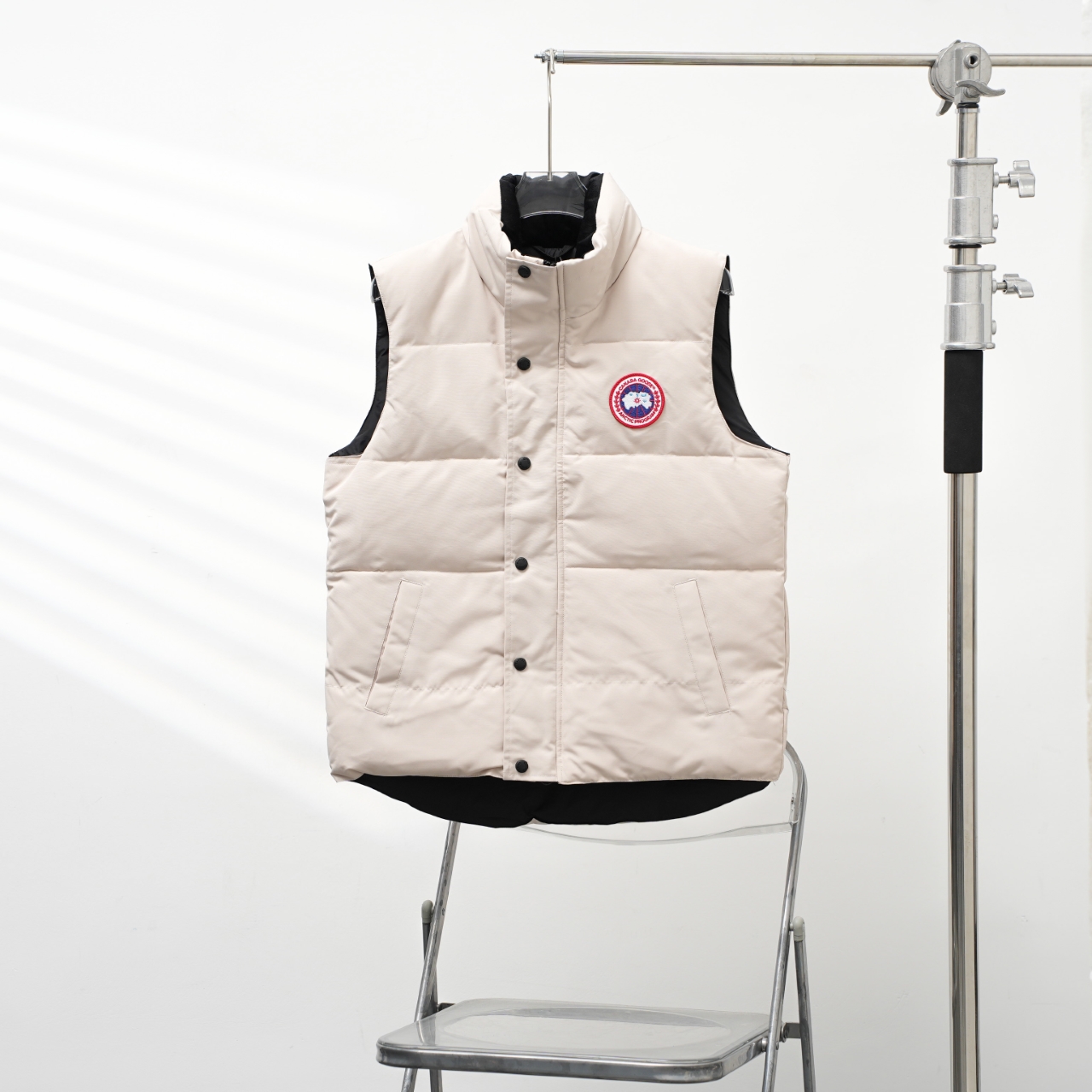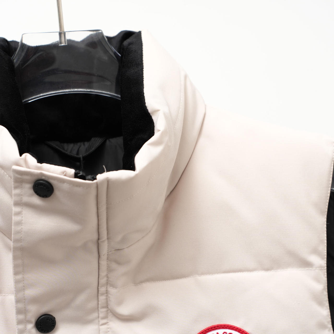 Canada Goose vest with slanted pockets and stand-up collar. Colors: White with red logo. Sizes: XS to XXL.
