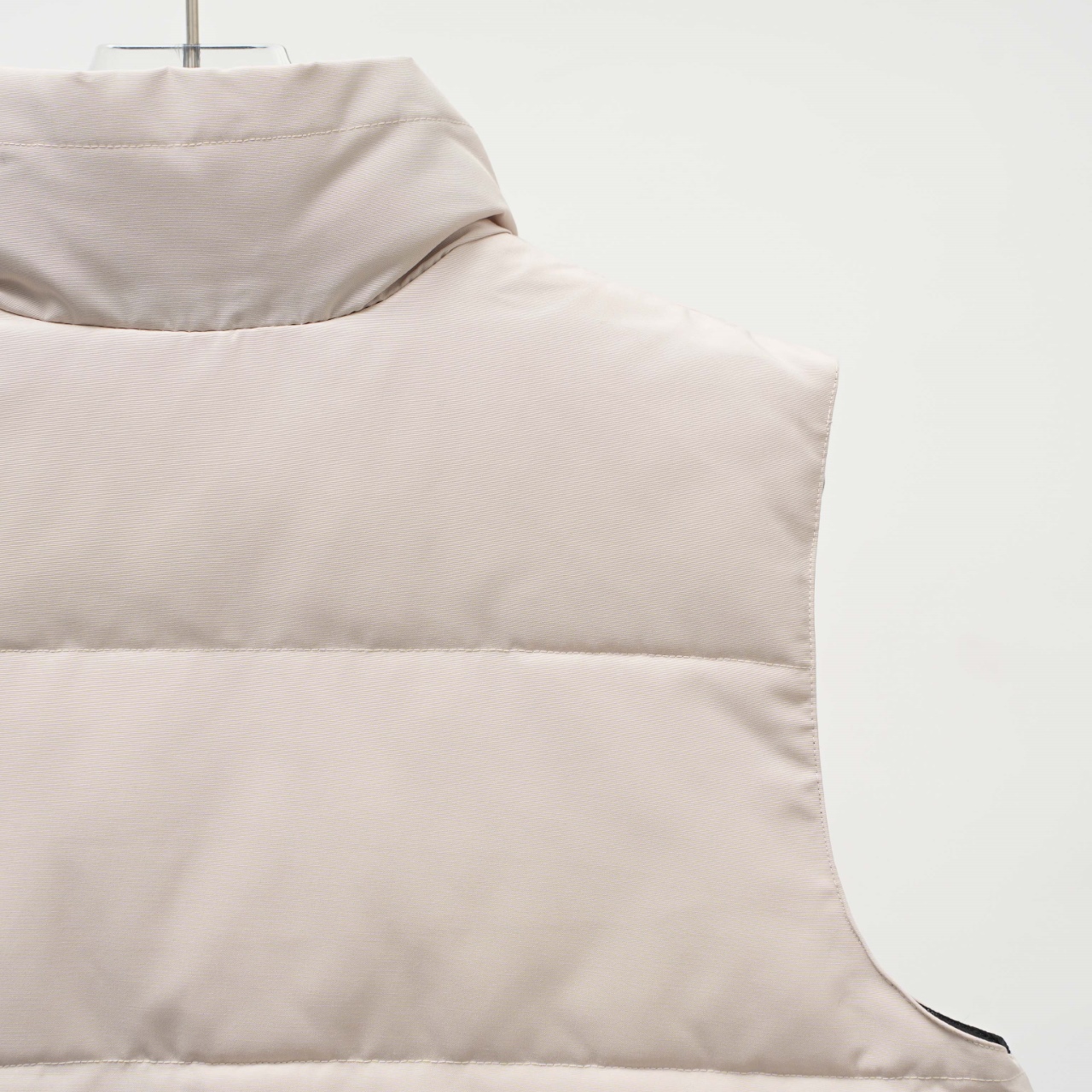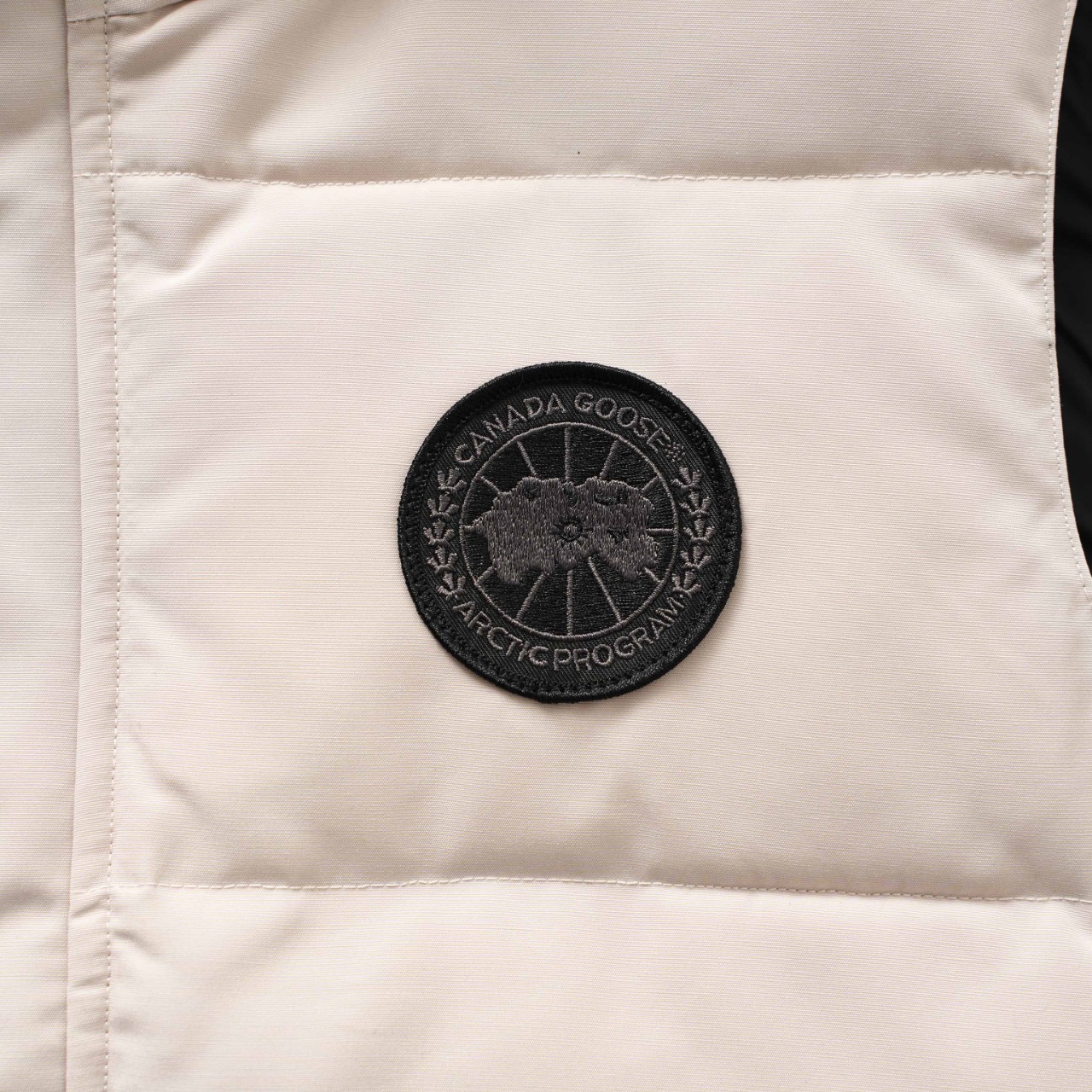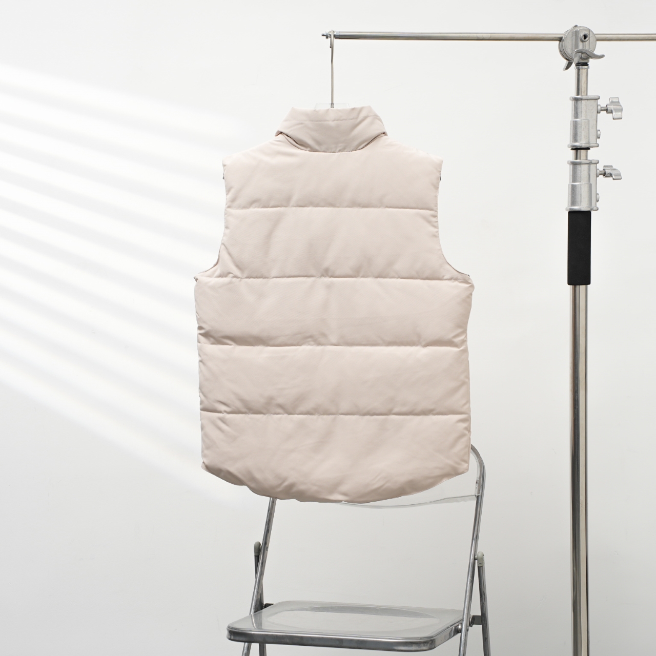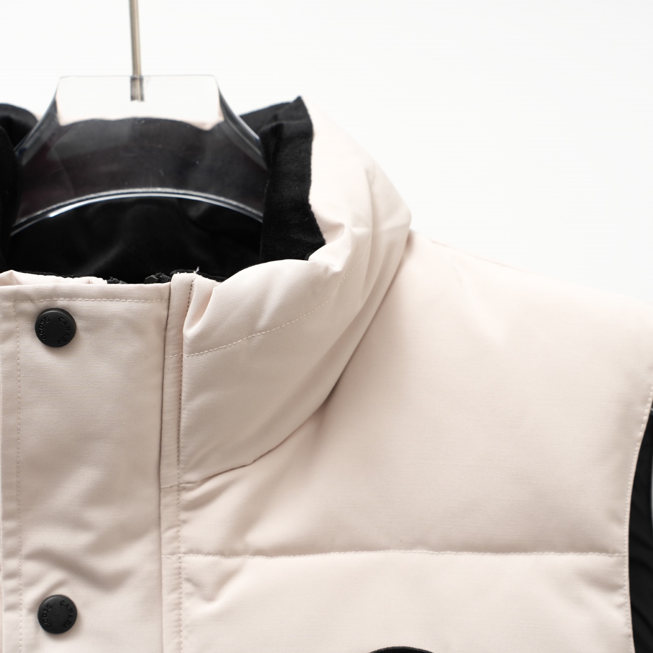 Canada Goose Vest with Slant Pockets and Stand Collar. Colors: White with Black Label. Sizes: XS to XXL.