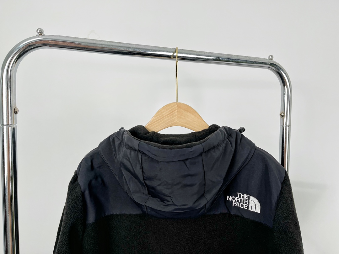 The North Face Korean style patchwork zipper fleece hooded jacket. Made of 430g imported fleece, lightweight and soft with excellent warmth. Features embroidered logo and custom details. Sizes S-XXL.