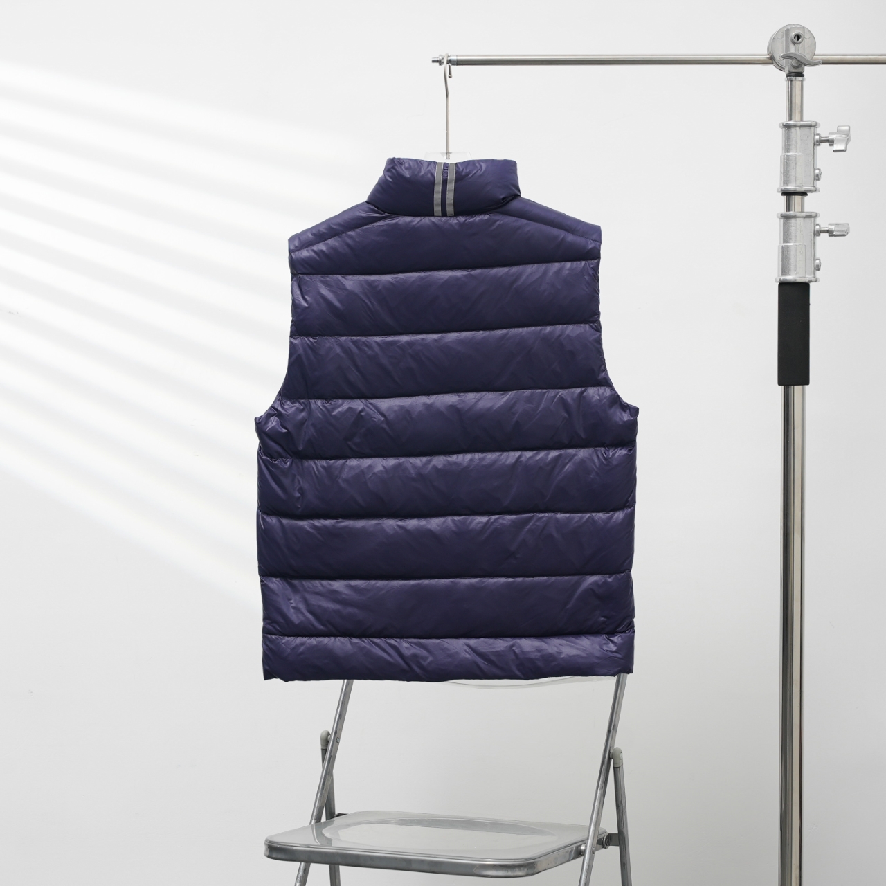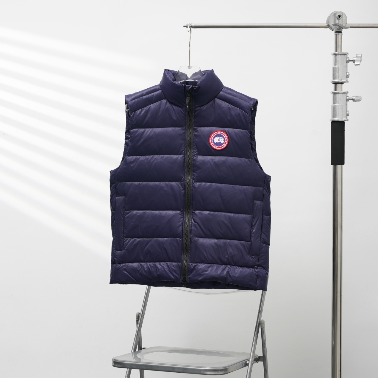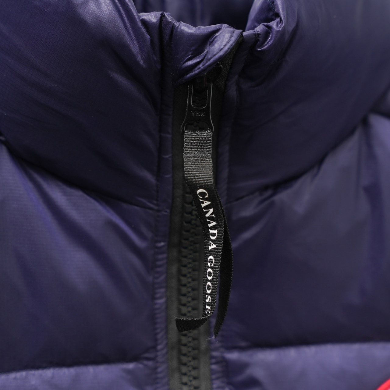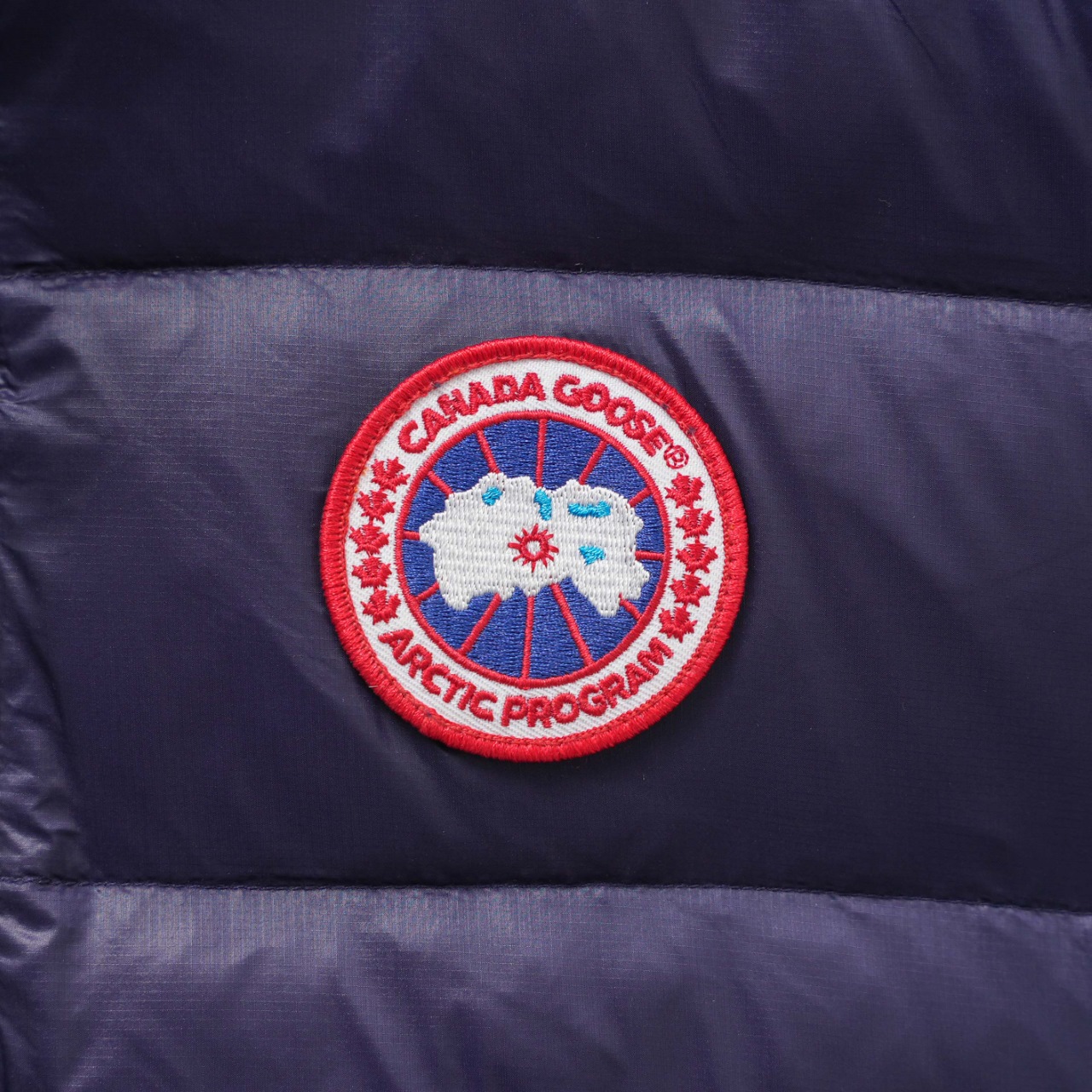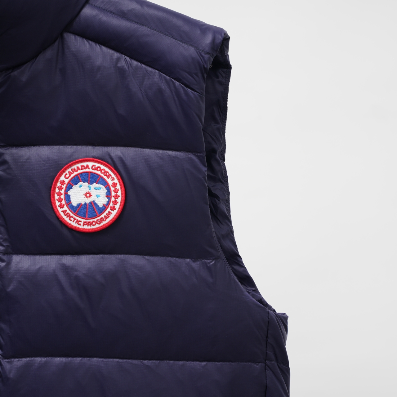 Canada Goose Vest Model 2229, slim fit, stand collar. Colors: Dark blue with red logo. Sizes: XS to XXL.