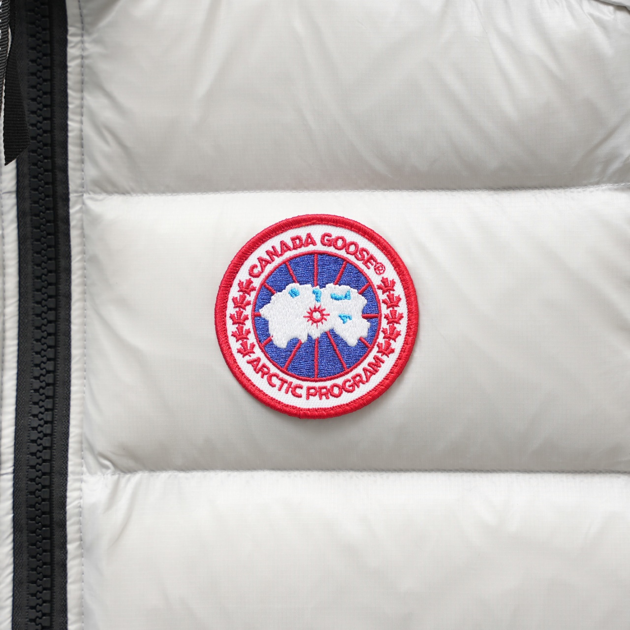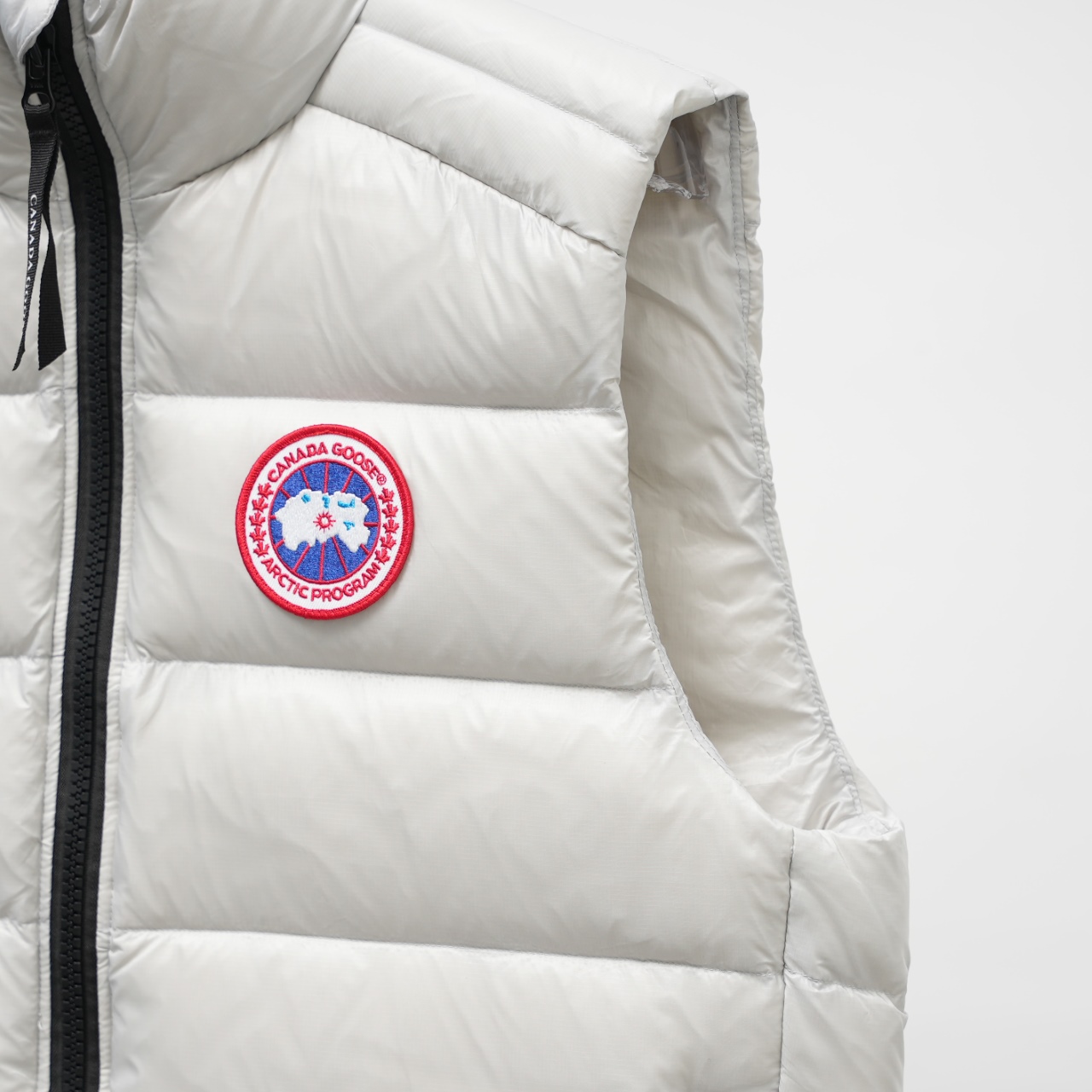 Canada Goose Vest Style 2229 Lightweight Stand Collar. Colors: Gray White Red Label. Sizes: XS-XXL.