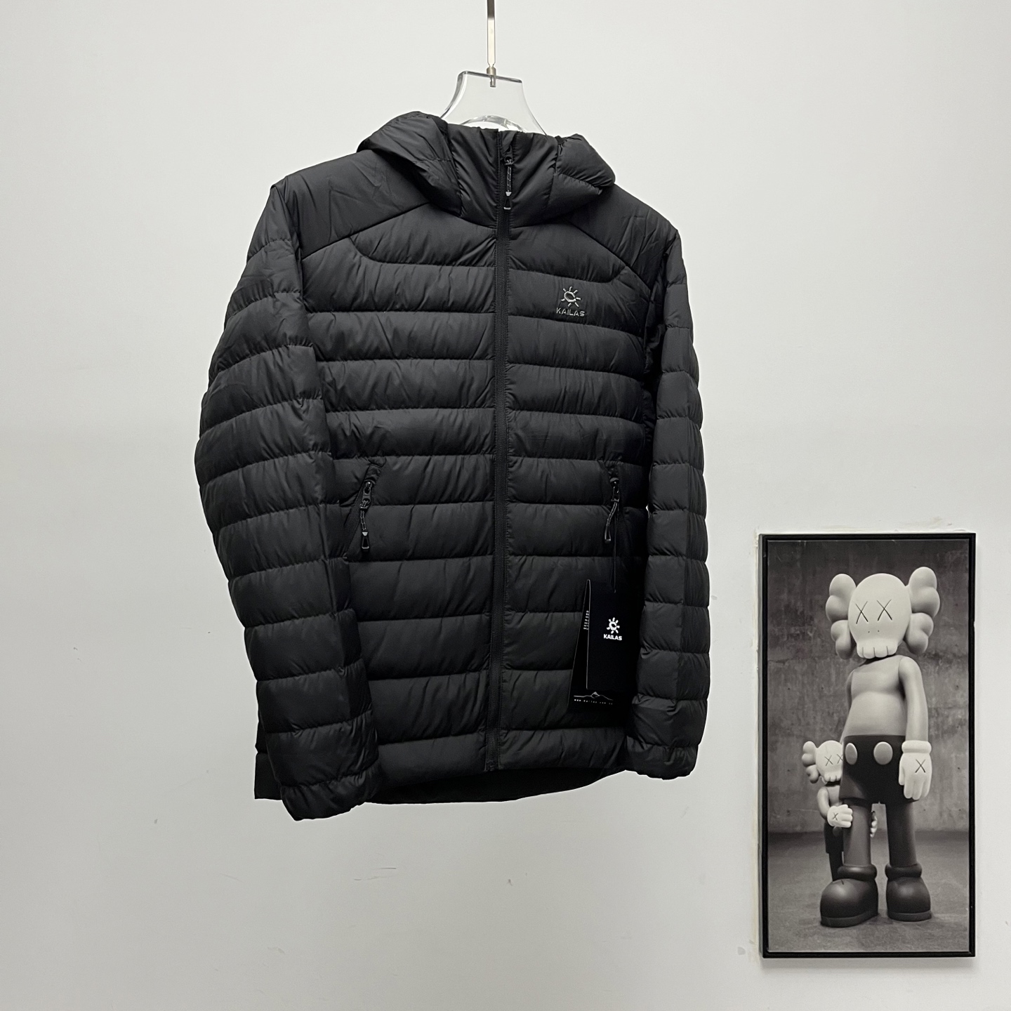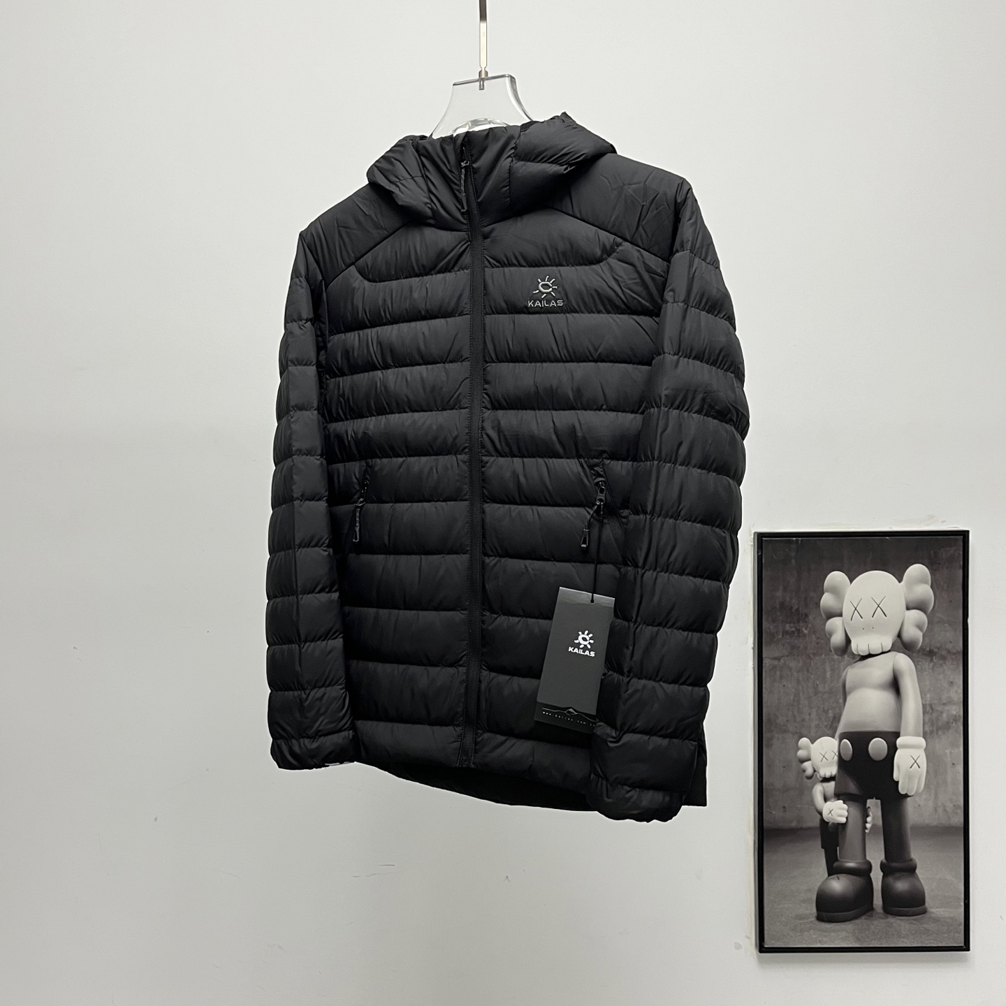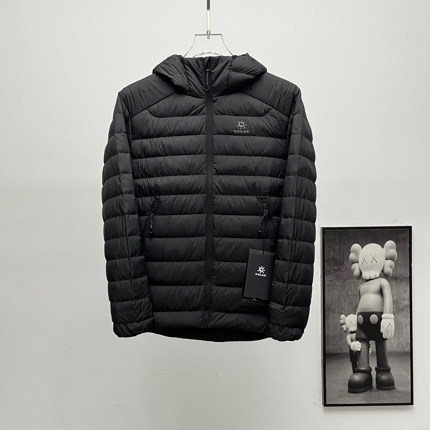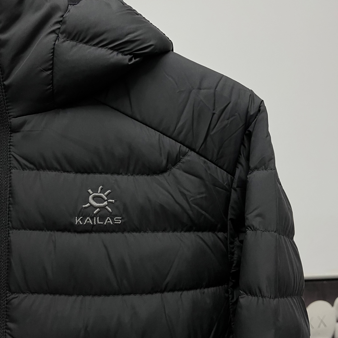 Kailas embroidered logo hooded down jacket, sizes S to XXL.